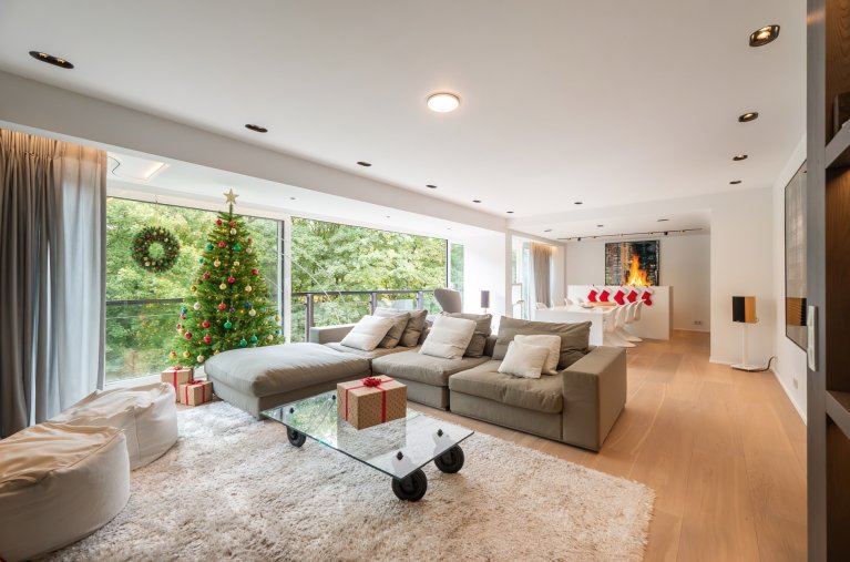 De inkomhal leidt naar een ruime, lichte woonkamer met grote ramen en een open uitzicht op het groene omliggende landschap. De volledig uitgeruste keuken, geïntegreerd in de leefruimte, heeft een hedendaagse inrichting. Het slaapgedeelte omvat een hoofdsuite met aangrenzende badkamer en balkon aan de achterzijde, een tweede slaapkamer met eigen douchekamer en balkon, en een derde slaapkamer eveneens met douchekamer.