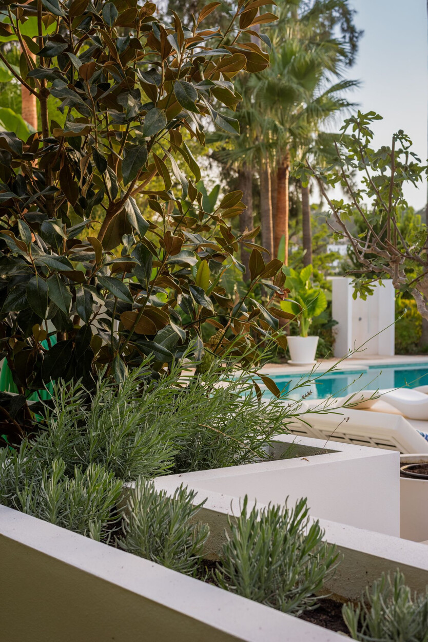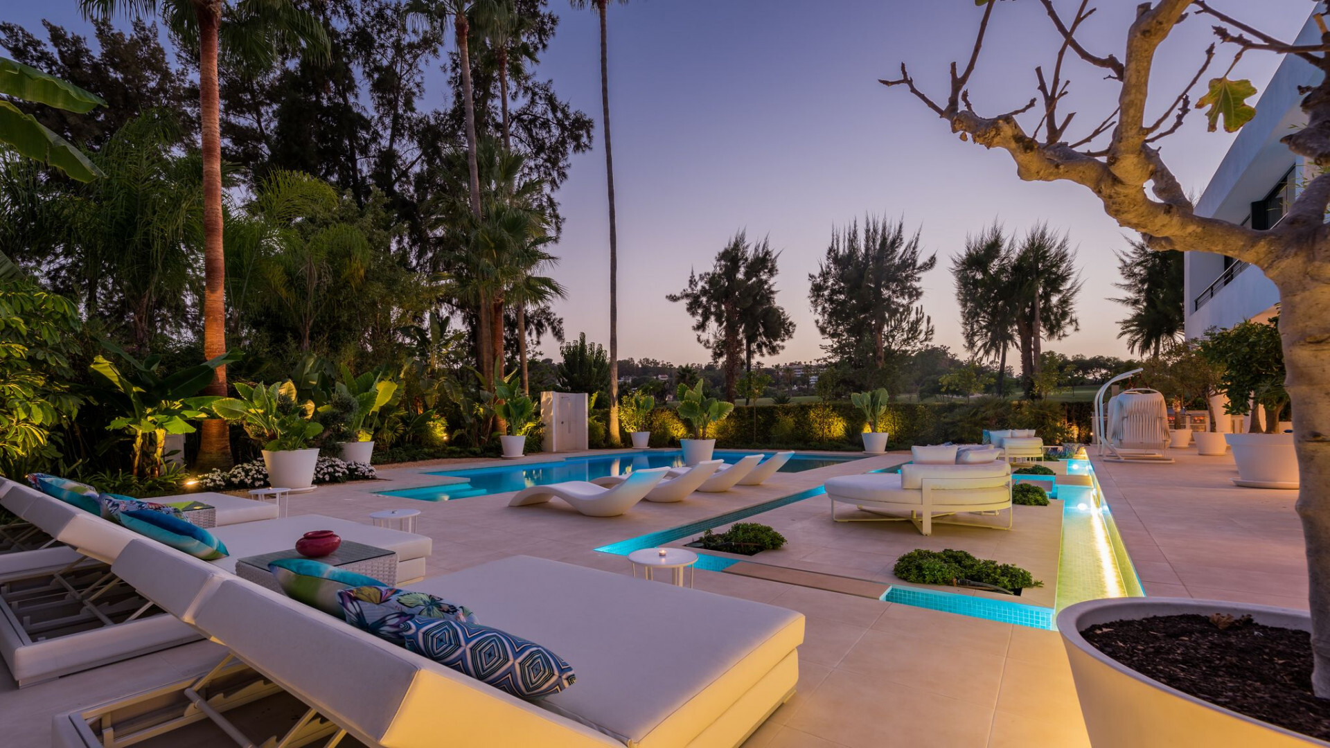 De buitenkant van deze woning heeft een perfect verzorgde en smaakvol ingerichte tuin, met verschillende zones die het genot van elk gezin garanderen. Rondom een enorme witte barbecue zijn er verschillende comfortabele chill out ruimtes waar u kunt genieten van gezellige bijeenkomsten met vrienden. Misschien wilt u liever een formeler diner bij maanlicht organiseren in de eethoek buiten met een natuurlijke houten tafel.