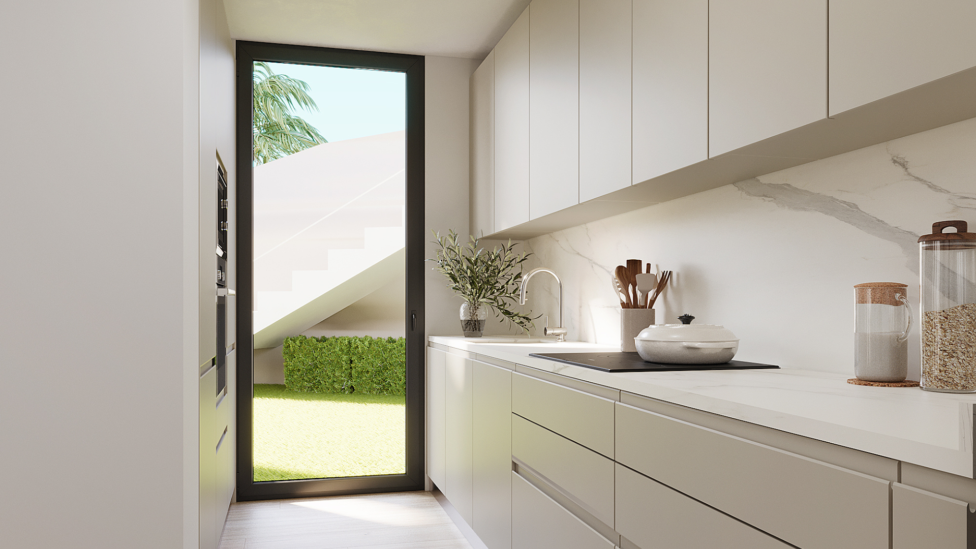 Het heeft een bebouwde oppervlakte van ongeveer 100 m2 en 75 m2 bruikbare ruimte. Op de begane grond vind je een spectaculaire ruimte waar de prachtige grote ramen het interieur en exterieur integreren en de woon-eetkamer vullen met licht. De keuken wordt verlicht door een binnenpatio en heeft toegang tot het terras, waar je een eetkamer buiten kunt installeren en kunt genieten van de rustruimtes en het prachtige uitzicht.