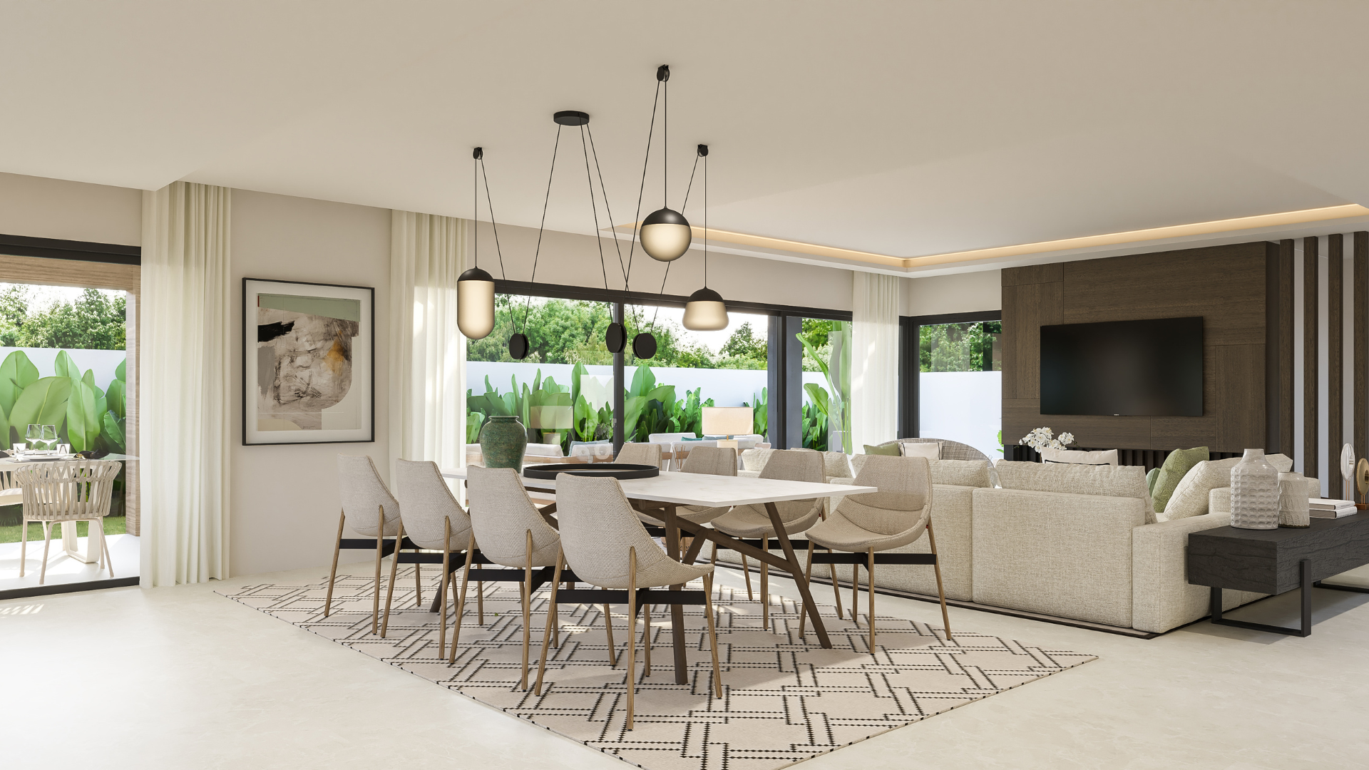 Het pand is goed verdeeld over 4 niveaus, een kelder, begane grond, eerste verdieping en dak met solarium. Het heeft een privézwembad en buitendouche. Aan de andere kant heeft de buitenruimte een overdekte eethoek, plus nog een terrasgedeelte voor banken en een chill-out gedeelte dat in deze villa ruimer is dan in de rest. De schaduwrijke en zonnige gebieden zijn goed gepland, allemaal omringd door een grote tuin. De villa wordt omringd door weelderig aangelegde tuinen en de kamers hebben grote ramen om natuurlijk licht binnen te laten en de schoonheid van de tuin een constant onderdeel van het huis te laten zijn.