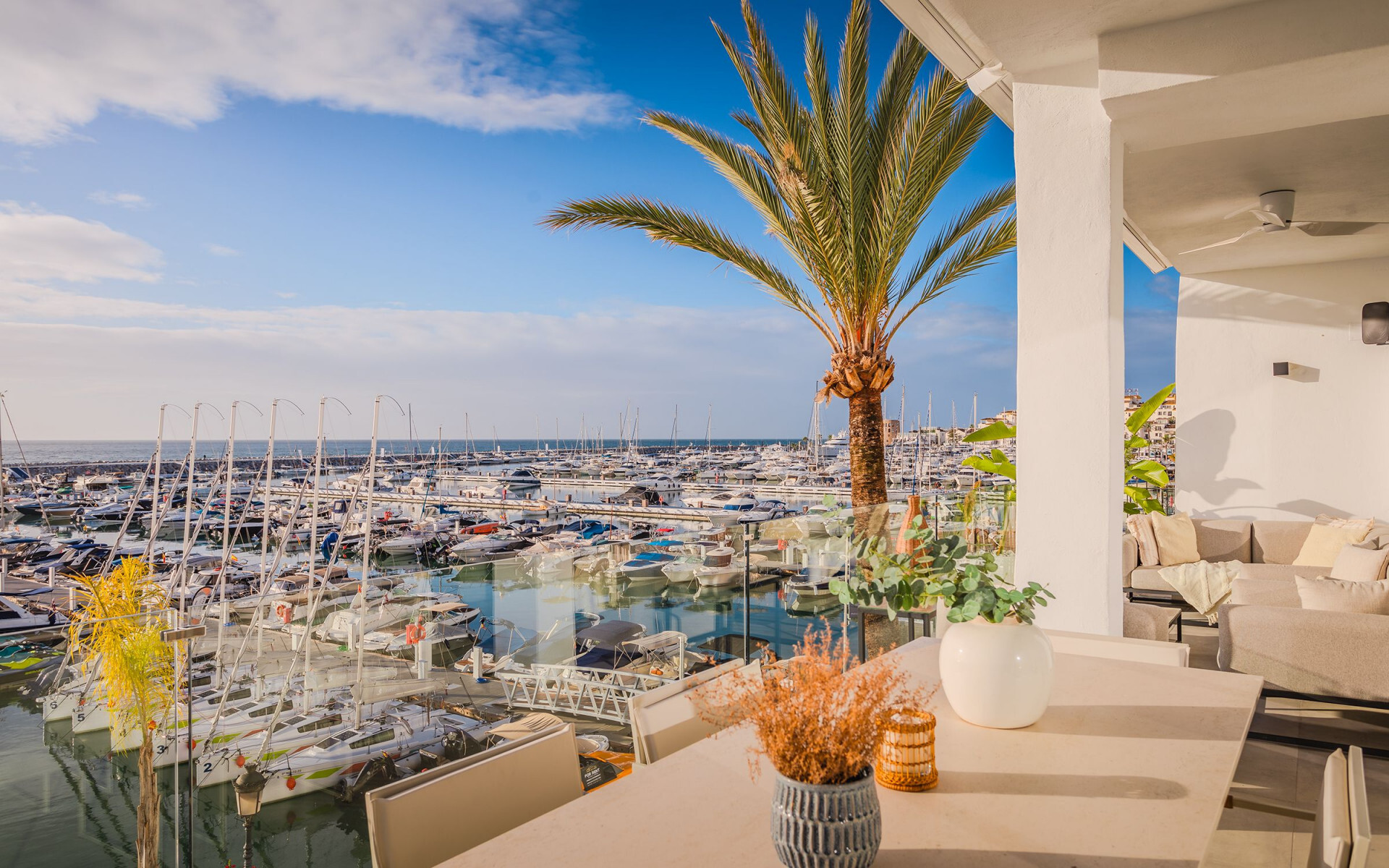 Vanuit de woonkamer en de hoofdslaapkamer heb je een panoramisch uitzicht op de prachtige jachten van de jachthaven, de zee en de indrukwekkende berg La Concha. Het huis heeft een mooi terras, perfect om te genieten van de prachtige mediterrane zonsopgang en zonsondergang, terwijl je geniet van “al fresco” dineren.