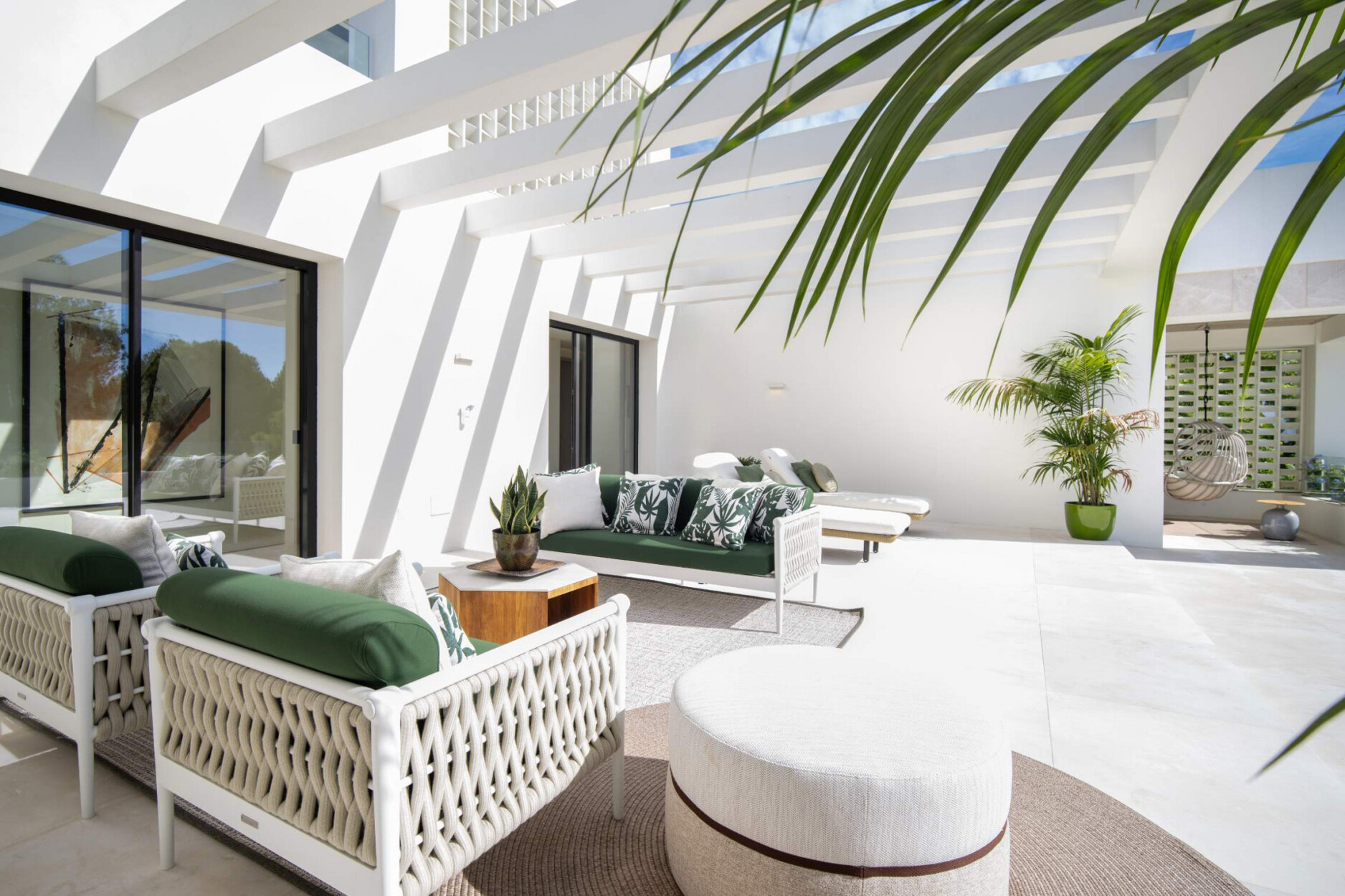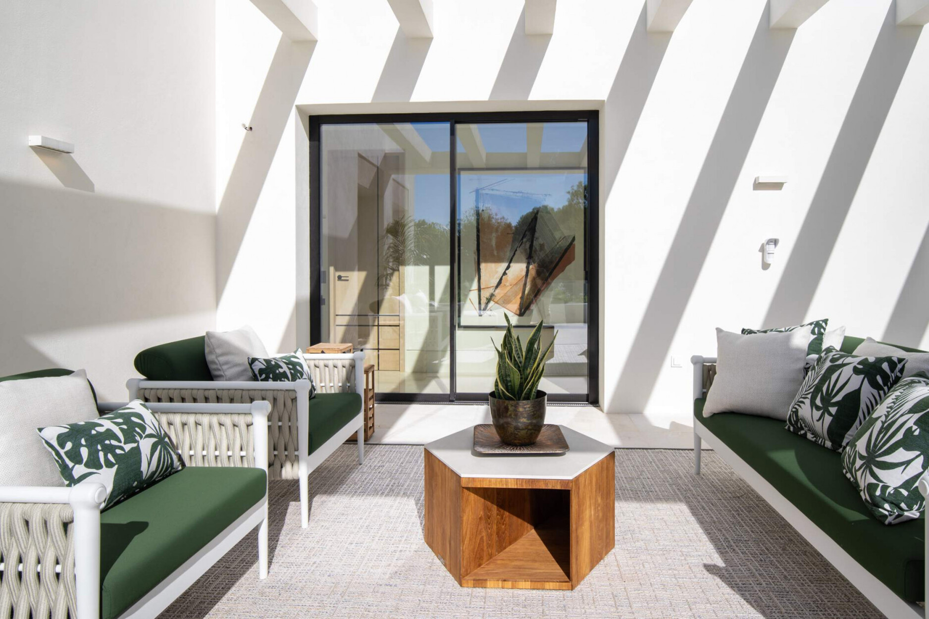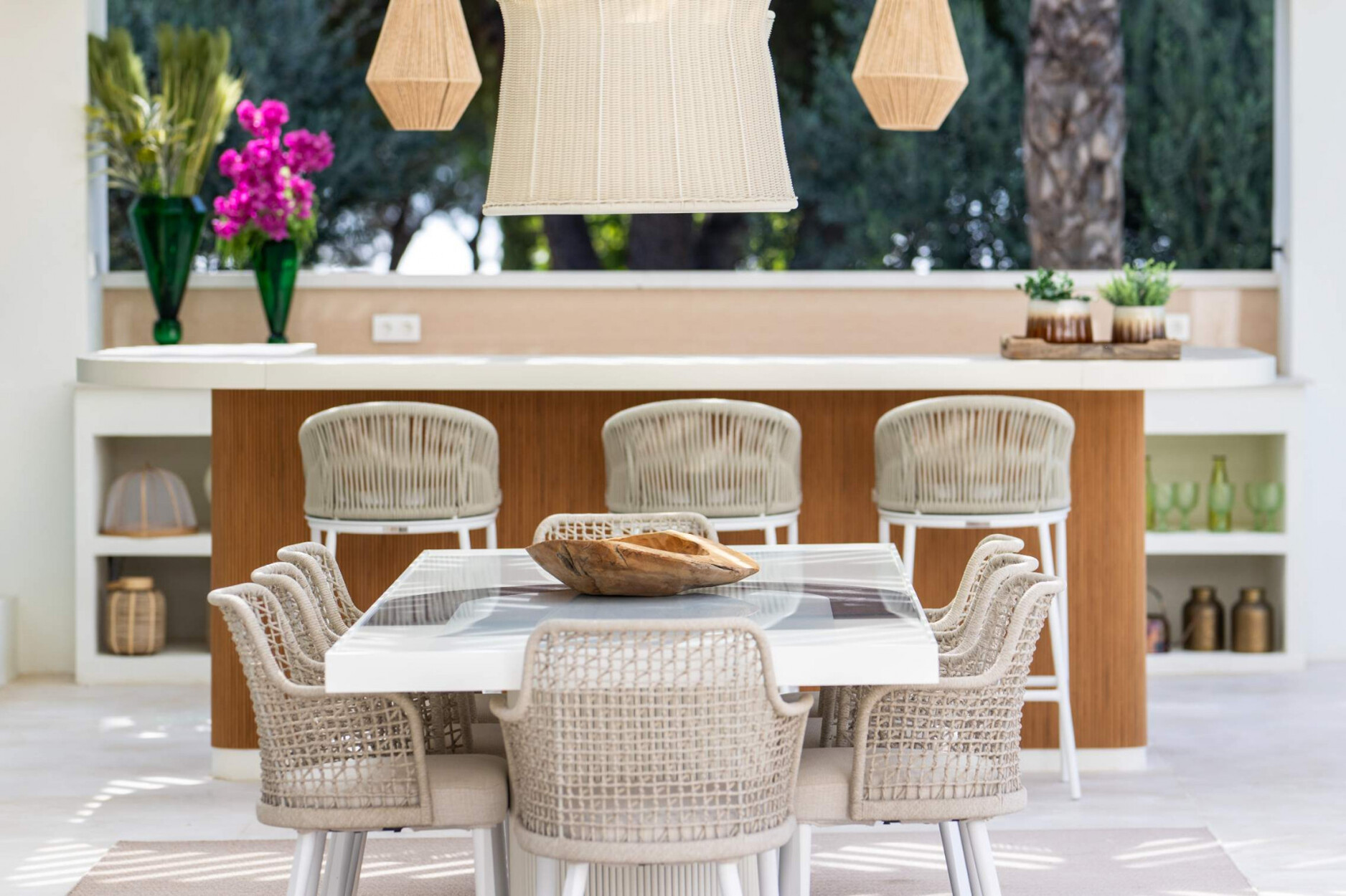 Dankzij de strategische ligging op het zuidoosten baadt het pand het grootste deel van de dag in natuurlijk licht. Het interieur, ontworpen door Pedro Peña, is net zo indrukwekkend als het exterieur, met een verfijnde selectie meubels en accessoires die esthetiek en comfort combineren. De eetkamer heeft directe toegang tot het terras en de keuken, waardoor het de ideale plek is om samen te komen met de familie en te genieten van een maaltijd. De op maat gemaakte keuken straalt elegantie en functionaliteit uit. Het eiland en de kasten zijn versierd met indrukwekkende houten details en onderscheiden zich door de ruime opbergruimte.