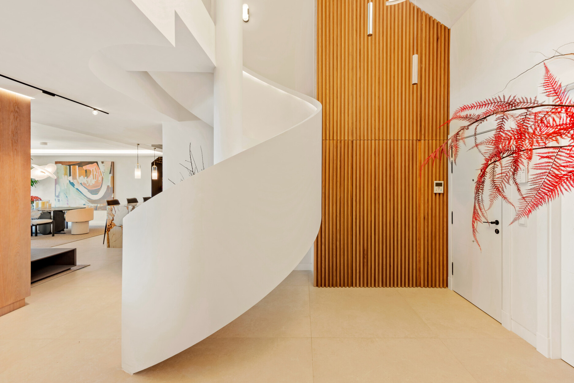 Deze woning is volledig gerenoveerd met materialen van de hoogste kwaliteit en heeft directe toegang tot de lift. De hoofdverdieping heeft een open ontwerp dat perfect harmonieert met de eetkamer, woonkamer en een moderne keuken, die uitkomt op een spectaculair terras met vrij frontaal zeezicht. Op dezelfde verdieping bevinden zich drie slaapkamers met eigen badkamer.