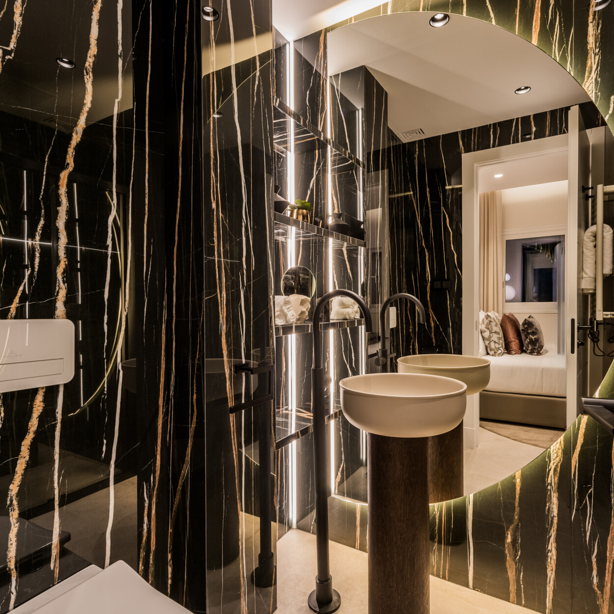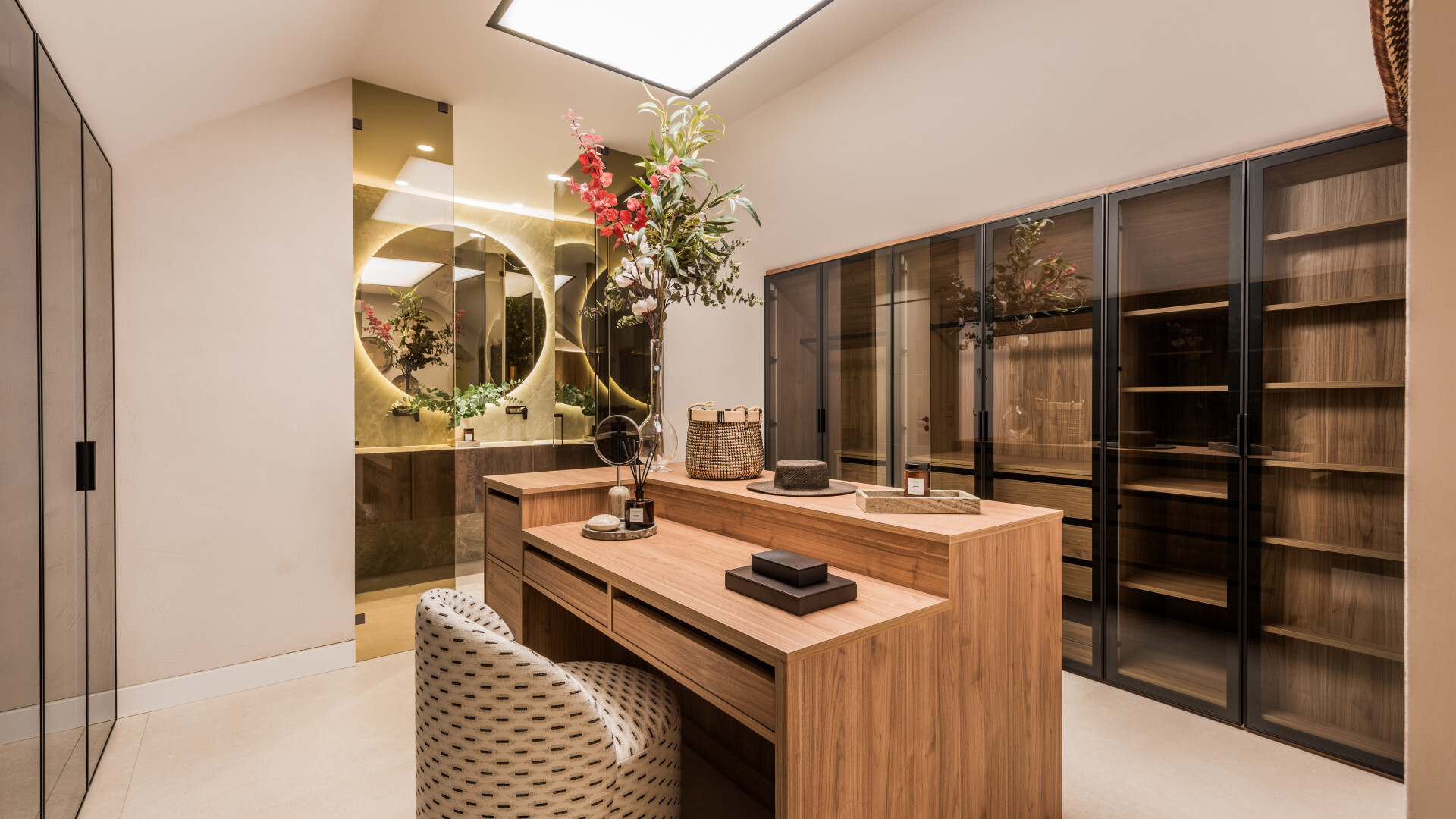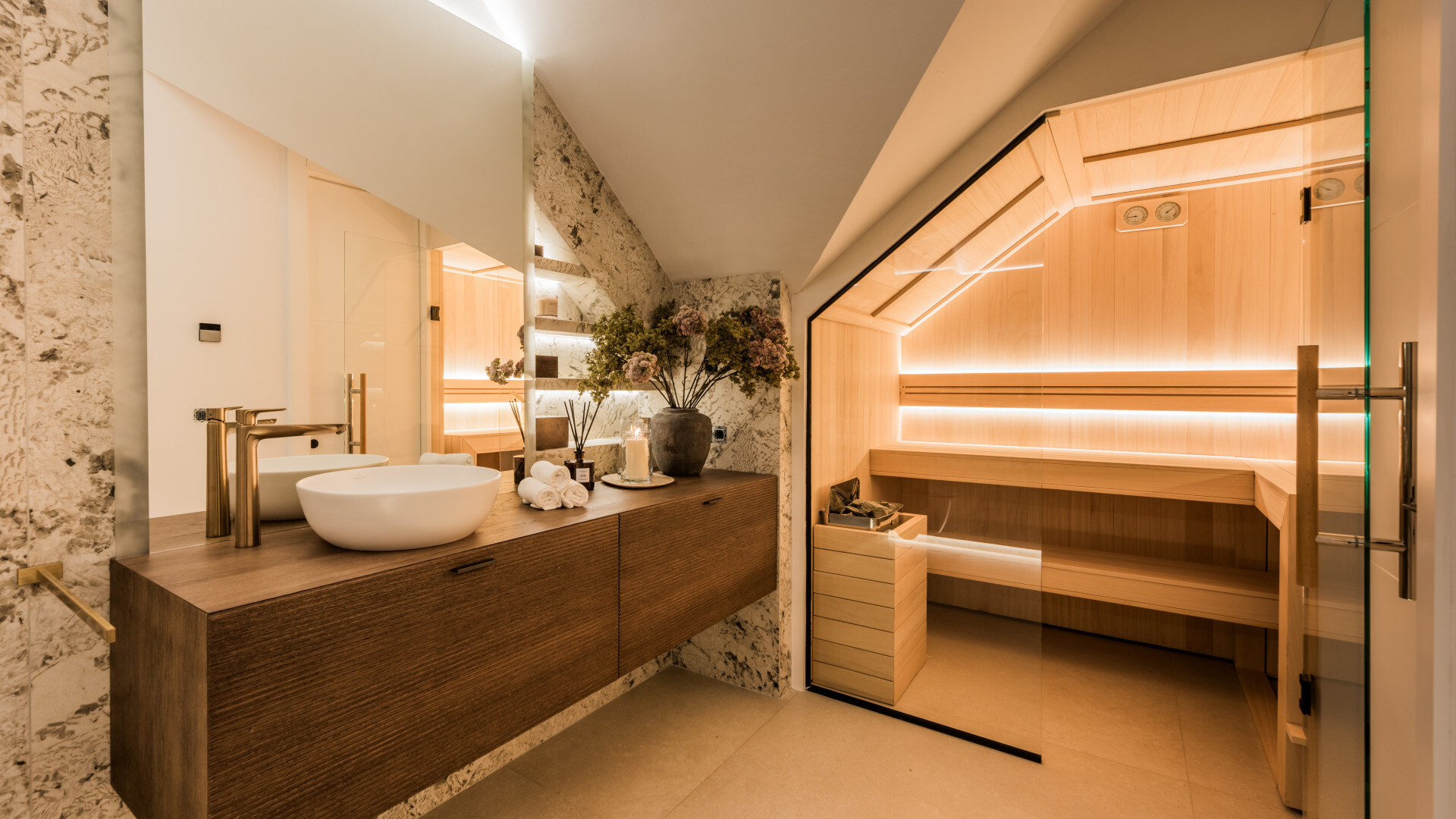 De bovenste verdieping is gewijd aan de hoofdslaapkamer, een luxueus toevluchtsoord met hoge plafonds, inclusief twee badkamers (een voor hem en een voor haar), een ruime kleedkamer, een sauna en een privéterras met adembenemend uitzicht en een rustige ambiance. Het penthouse is uitgerust met tal van luxe voorzieningen, waaronder twee elektrische open haarden, vloerverwarming, een ultramodern Bang & Olufsen-geluidssysteem, op maat gemaakte kasten en een tweede servicekeuken. Bij de woning horen ook een parkeerplaats en een berging.