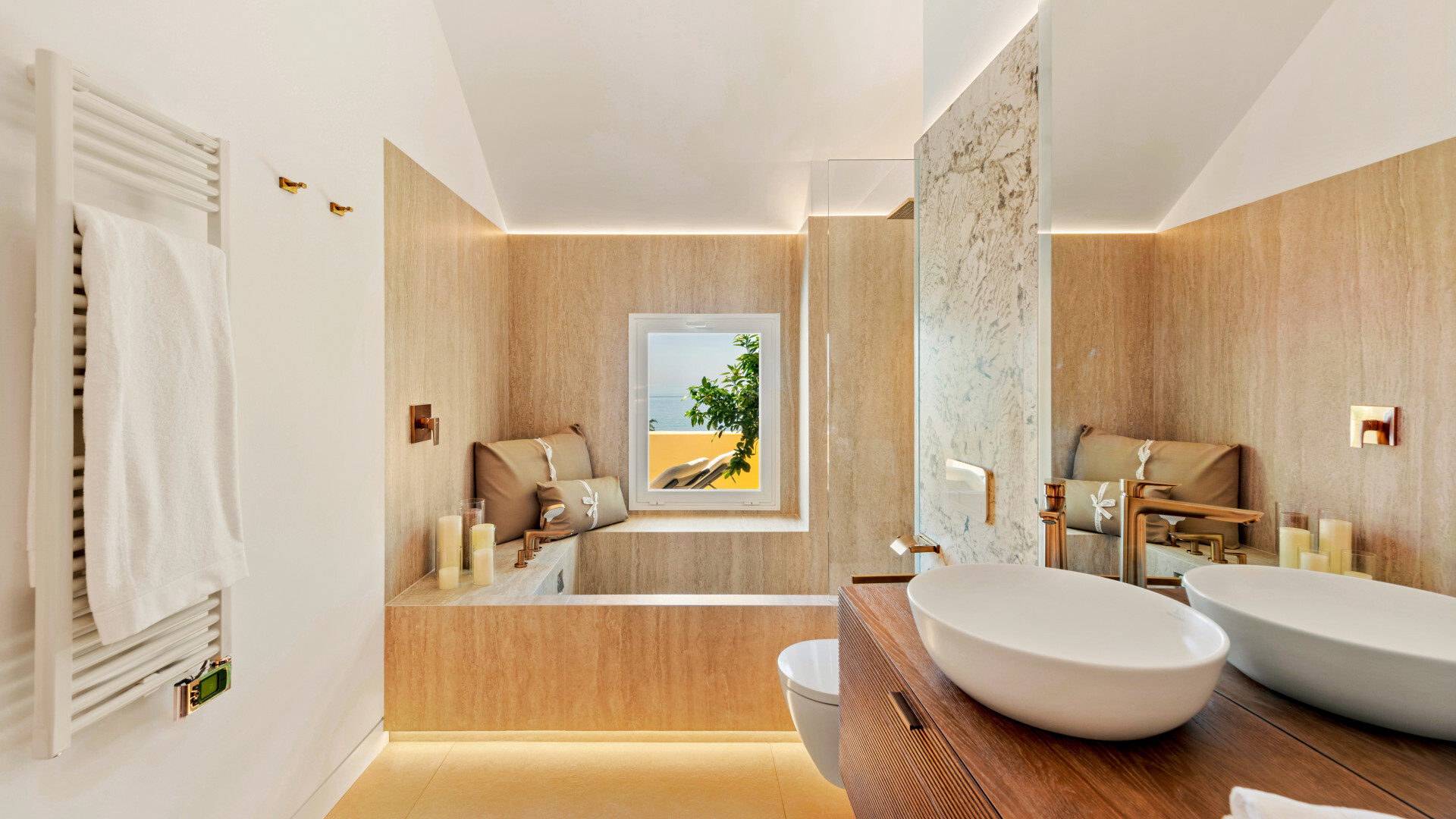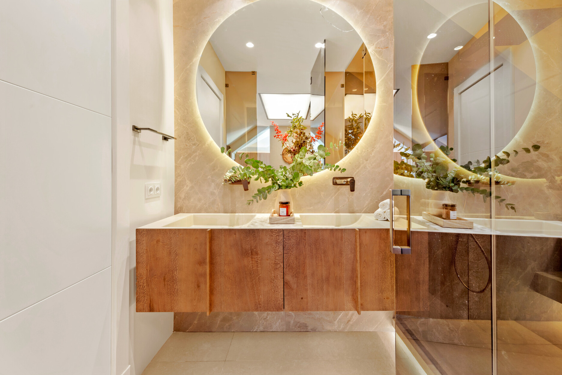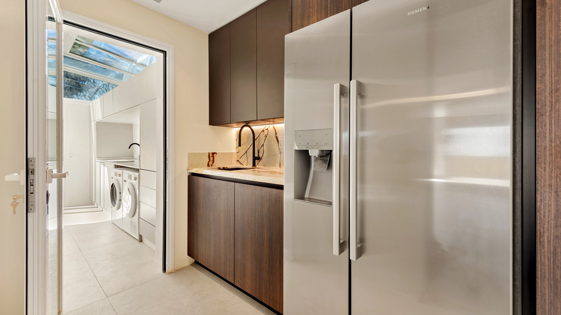 De bovenste verdieping is gewijd aan de hoofdslaapkamer, een luxueus toevluchtsoord met hoge plafonds, inclusief twee badkamers (een voor hem en een voor haar), een ruime kleedkamer, een sauna en een privéterras met adembenemend uitzicht en een rustige ambiance. Het penthouse is uitgerust met tal van luxe voorzieningen, waaronder twee elektrische open haarden, vloerverwarming, een ultramodern Bang & Olufsen-geluidssysteem, op maat gemaakte kasten en een tweede servicekeuken. Bij de woning horen ook een parkeerplaats en een berging.