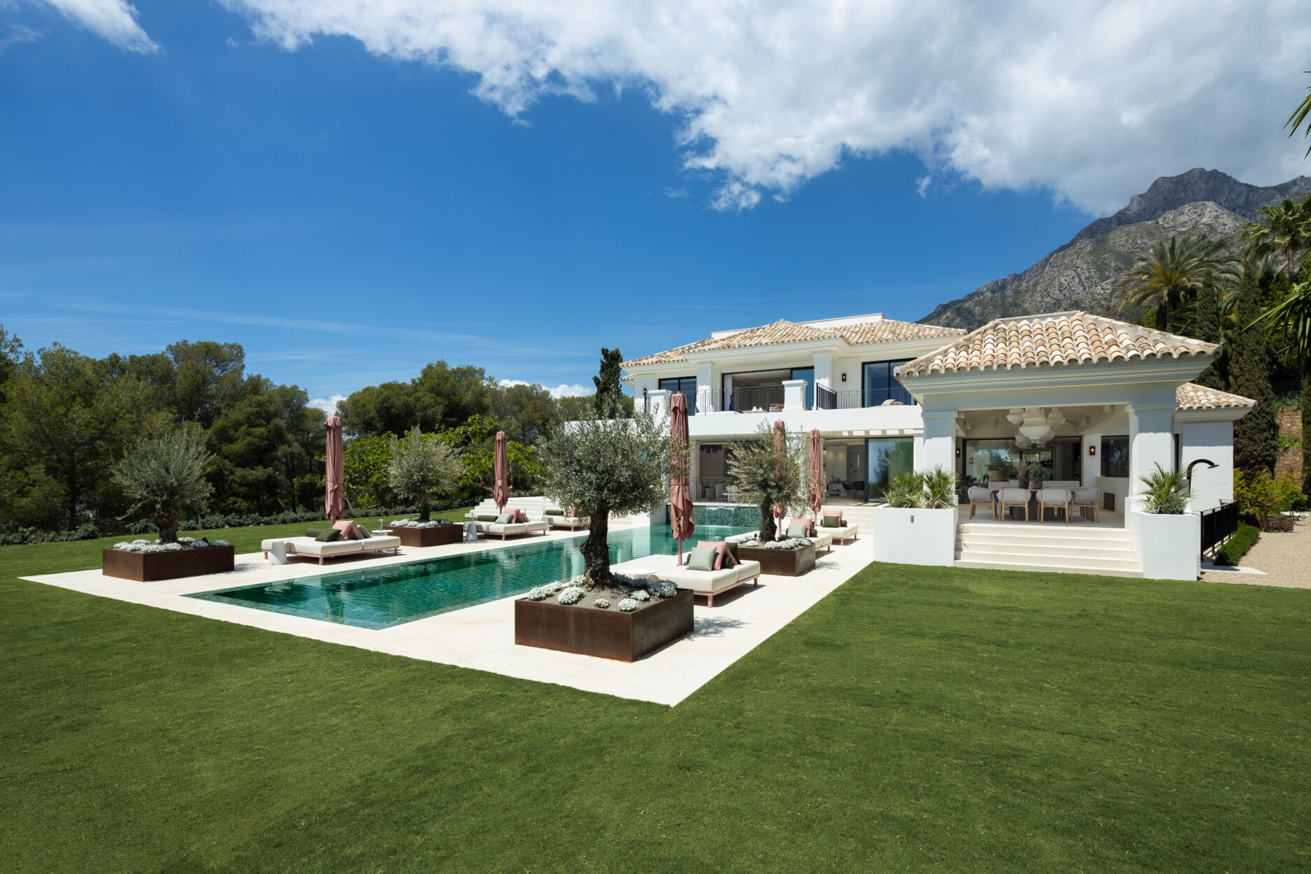 Te midden van weelderig groen op een groot perceel ligt het buitenzwembad, omringd door zorgvuldig onderhouden tuinen met panoramisch uitzicht op zee en de bergen. De terrassen zijn zorgvuldig ontworpen en nodigen u uit om te ontspannen te midden van een exquise inrichting, waaruit een ongeëvenaarde toewijding aan kwaliteit blijkt.