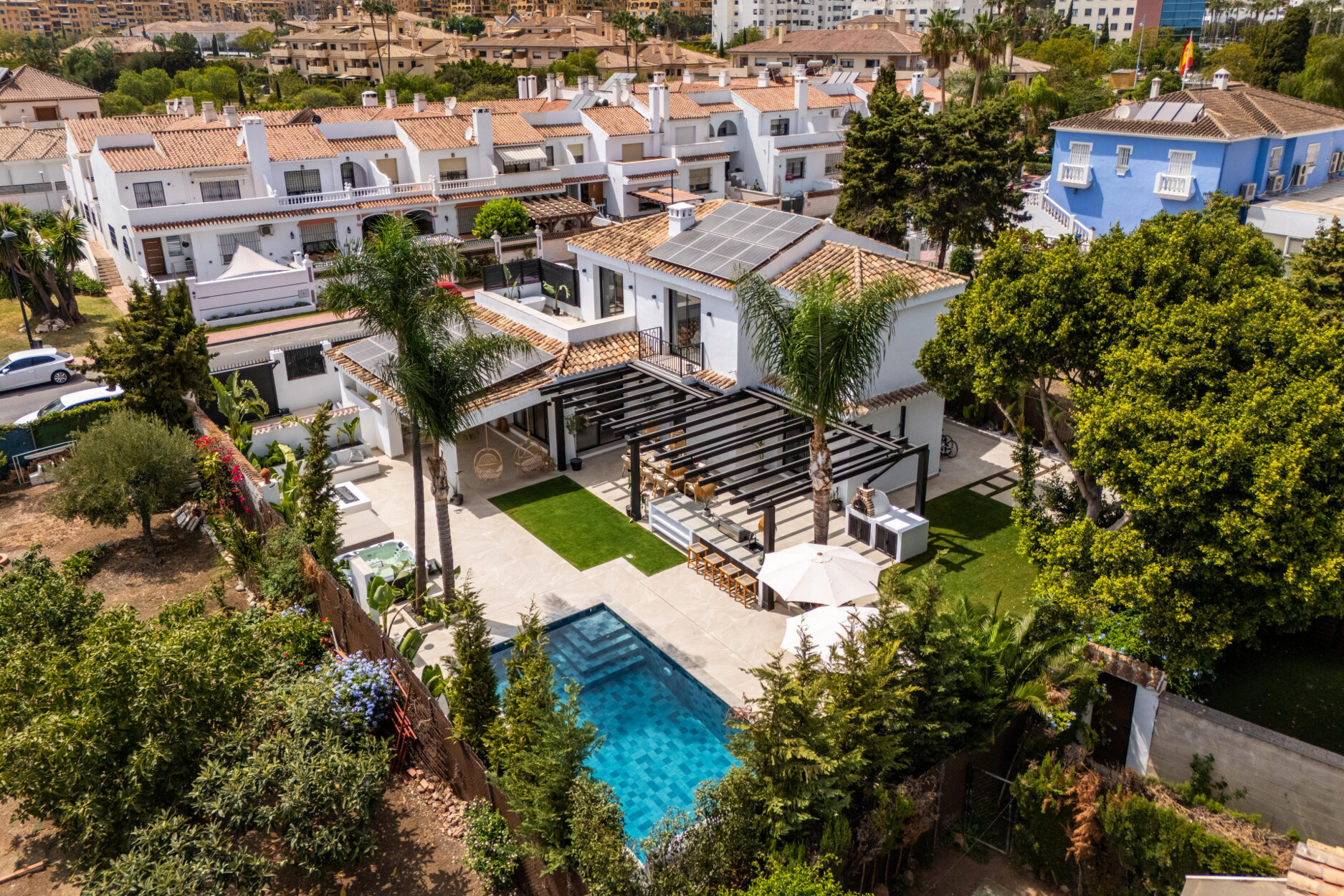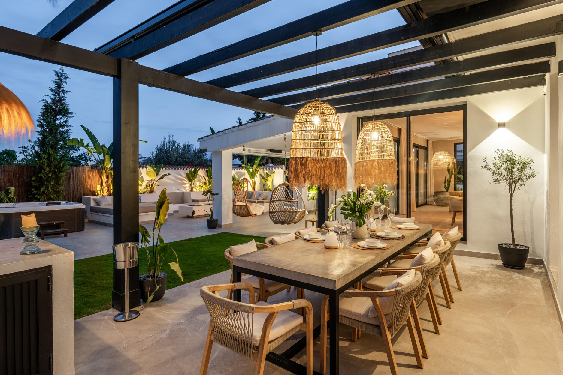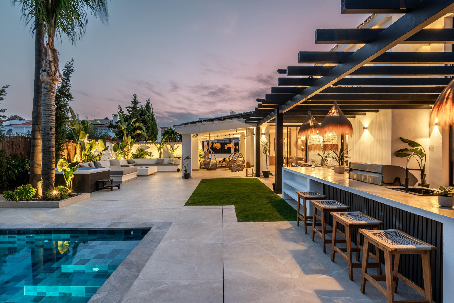 Buiten biedt een beschutte ruimte een comfortabele loungeplek, uitgerust met een projector voor het genieten van buitenfilmavonden. De jacuzzi bevindt zich naast een chill-out zone met een andere ethanolhaard. Naast het verwarmde Balinese zwembad is de buitenkeuken voorzien van een barbecue, pizzaoven en bar. Er is ook een eetruimte, allemaal onder een automatische pergola die schaduw biedt van de zon die 346 dagen per jaar schijnt. Daarnaast is er een speelruimte met een basketbalring en een veilige parkeerplaats. Zonnepanelen dragen bij aan het milieuvriendelijke ontwerp.