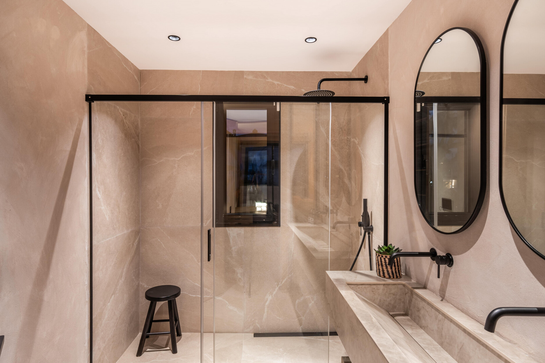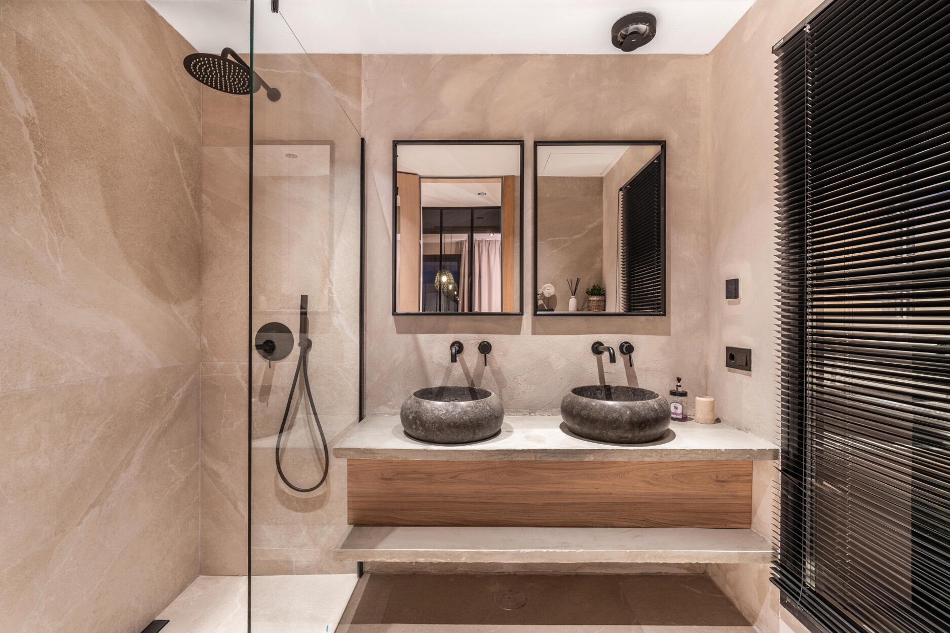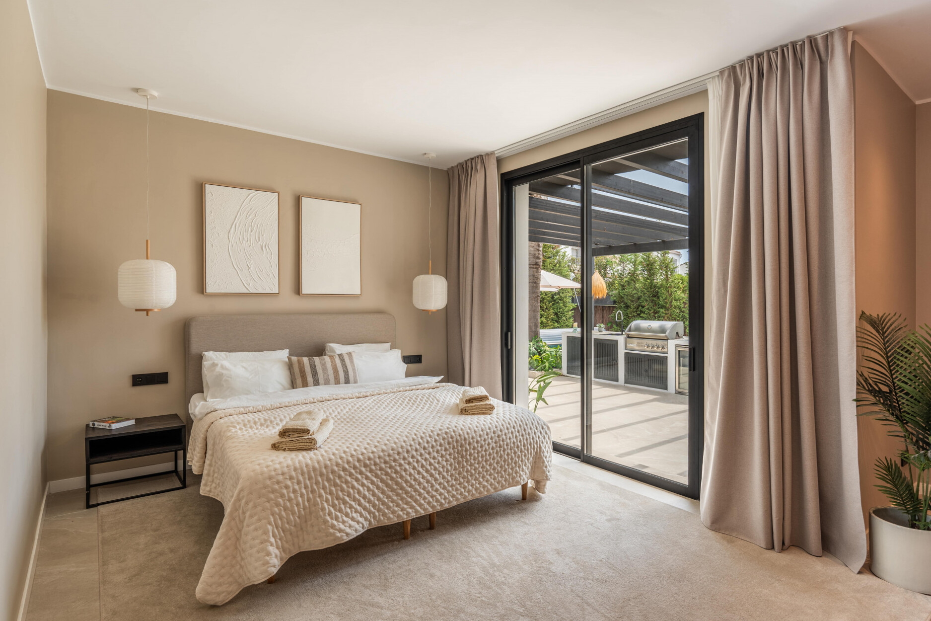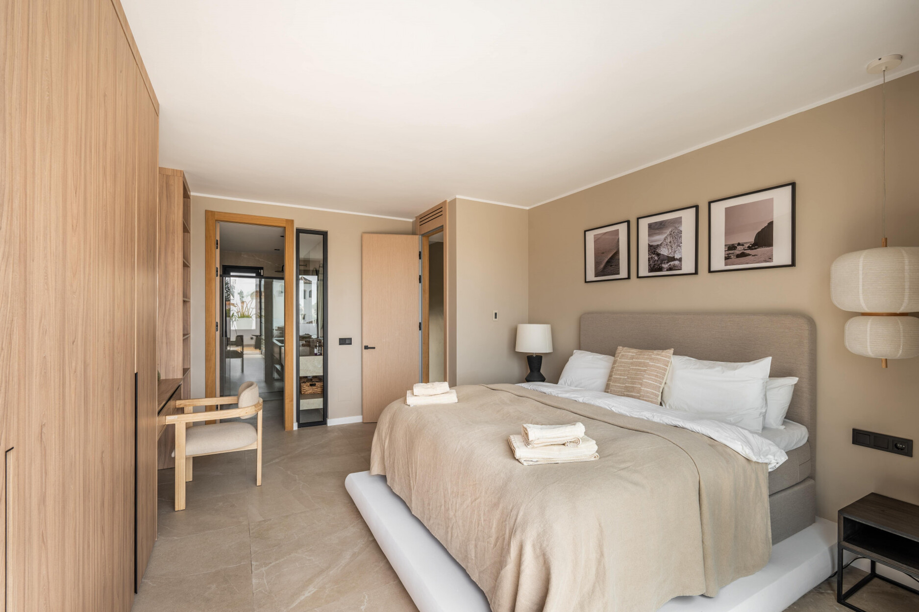 Op de begane grond zijn er een gastentoilet met douche en twee slaapkamers, waarvan er één en suite is met een royaal open inloopkast. De bovenverdieping heeft drie extra slaapkamers. De master suite omvat een terras, een ruime badkamer en een buitendouche, wat een privé toevluchtsoord biedt. De andere twee slaapkamers delen een grote badkamer met dubbele wastafels en een douche. Alle slaapkamers zijn uitgerust met op maat gemaakte houten opbergoplossingen met interieurverlichting. Het huis is volledig geautomatiseerd en gemeubileerd, inclusief centrale airconditioning, vloeren tot aan het plafond, een wasruimte en voldoende opbergruimte.