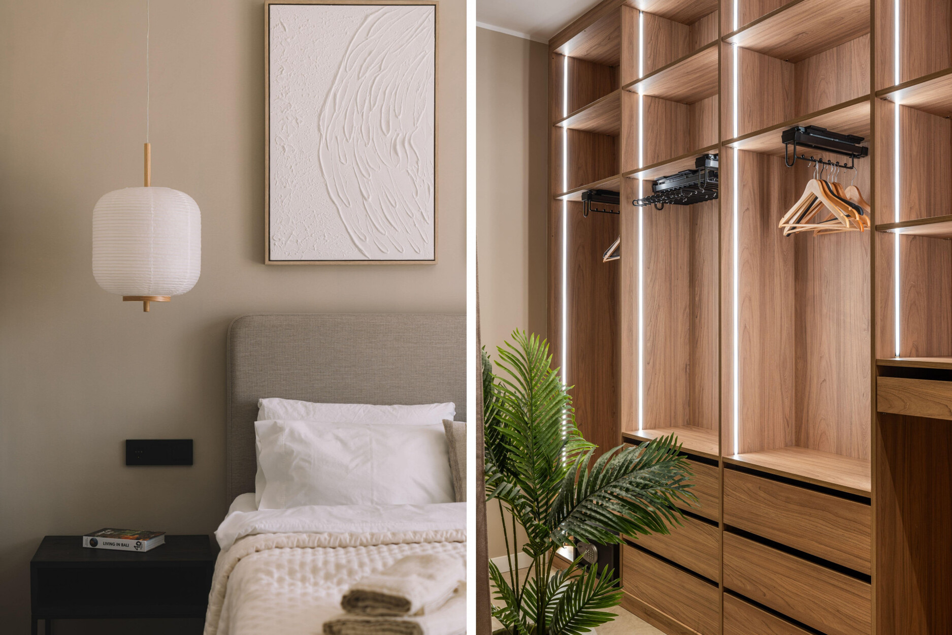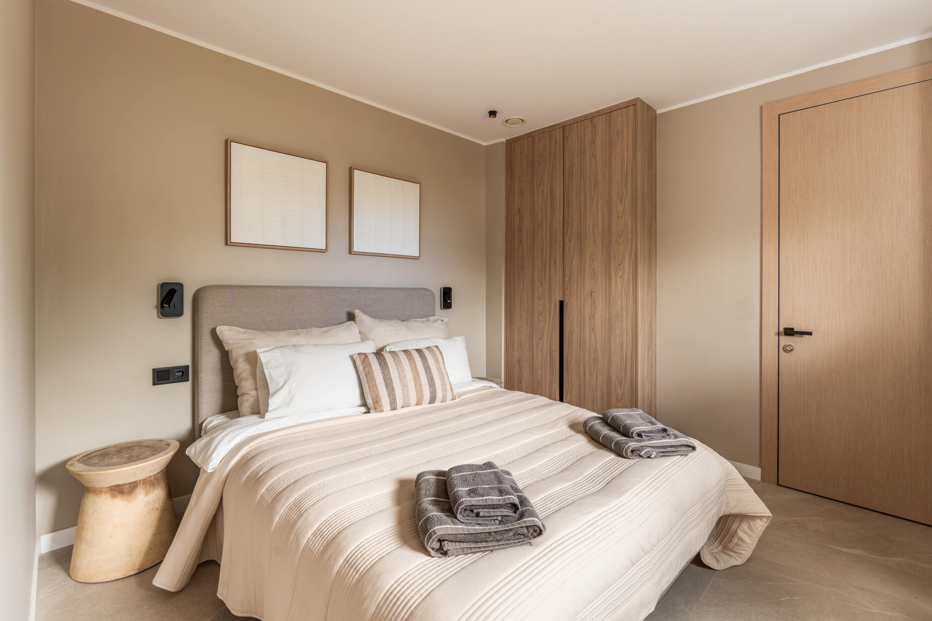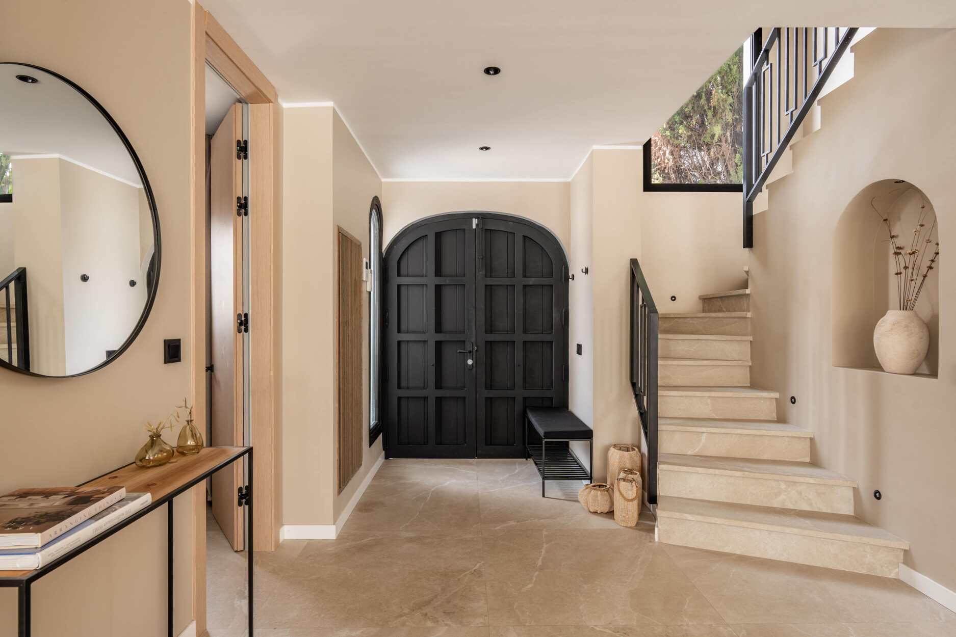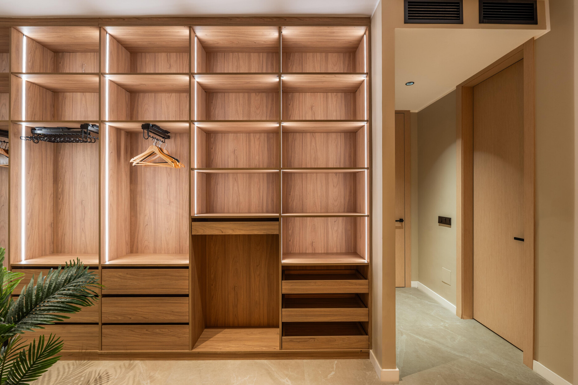 Op de begane grond zijn er een gastentoilet met douche en twee slaapkamers, waarvan er één en suite is met een royaal open inloopkast. De bovenverdieping heeft drie extra slaapkamers. De master suite omvat een terras, een ruime badkamer en een buitendouche, wat een privé toevluchtsoord biedt. De andere twee slaapkamers delen een grote badkamer met dubbele wastafels en een douche. Alle slaapkamers zijn uitgerust met op maat gemaakte houten opbergoplossingen met interieurverlichting. Het huis is volledig geautomatiseerd en gemeubileerd, inclusief centrale airconditioning, vloeren tot aan het plafond, een wasruimte en voldoende opbergruimte.