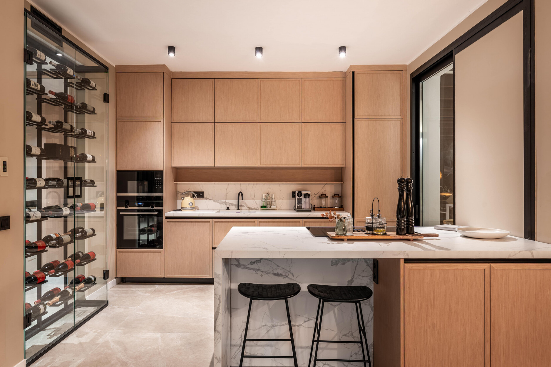 Deze woning is ontworpen voor plezier zowel binnen als buiten. Via de dubbele deuren heeft men toegang tot een ruime eetkamer die grenst aan een open keuken, die een eiland en een wijnkelder van vloer tot plafond omvat. Voor de travertijn tafel markeert een ethanolhaard de overgang naar de woonkamer. Grote ramen vervagen de grenzen tussen binnen en buiten, waardoor de ruimte overspoeld wordt met natuurlijk licht.