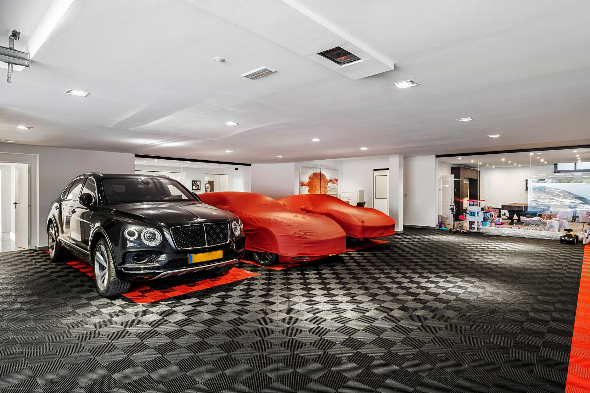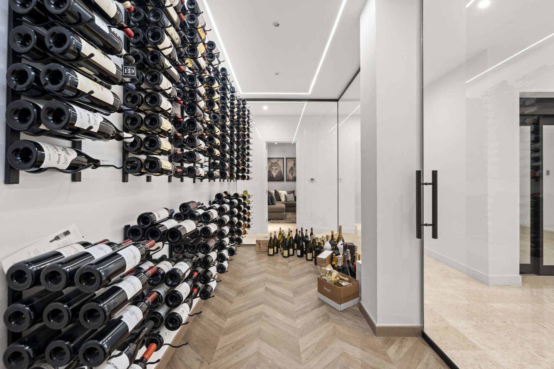 Het ontwerp van de woning maakt optimaal gebruik van natuurlijk licht en presenteert een open lay-out. Op de begane grond leidt een elegante hal naar een woonkamer en een volledig uitgeruste keuken met eethoek. Op dit niveau is er een gastensuite (die kan dienen als alternatieve master suite) en een gastentoilet. Op deze verdieping is ook een gastenslaapkamer met en-suite badkamer en een personeelsappartement met woonkamer, slaapkamer en badkamer. Er is ook een bioscoopzaal, wijnkelder, entertainment-/zwembadkamer, fitnessruimte, kantoor, wasruimte en een garage voor 6 auto's. Alle kamers genieten van natuurlijk licht, wat het doorzichtige karakter van het pand versterkt.