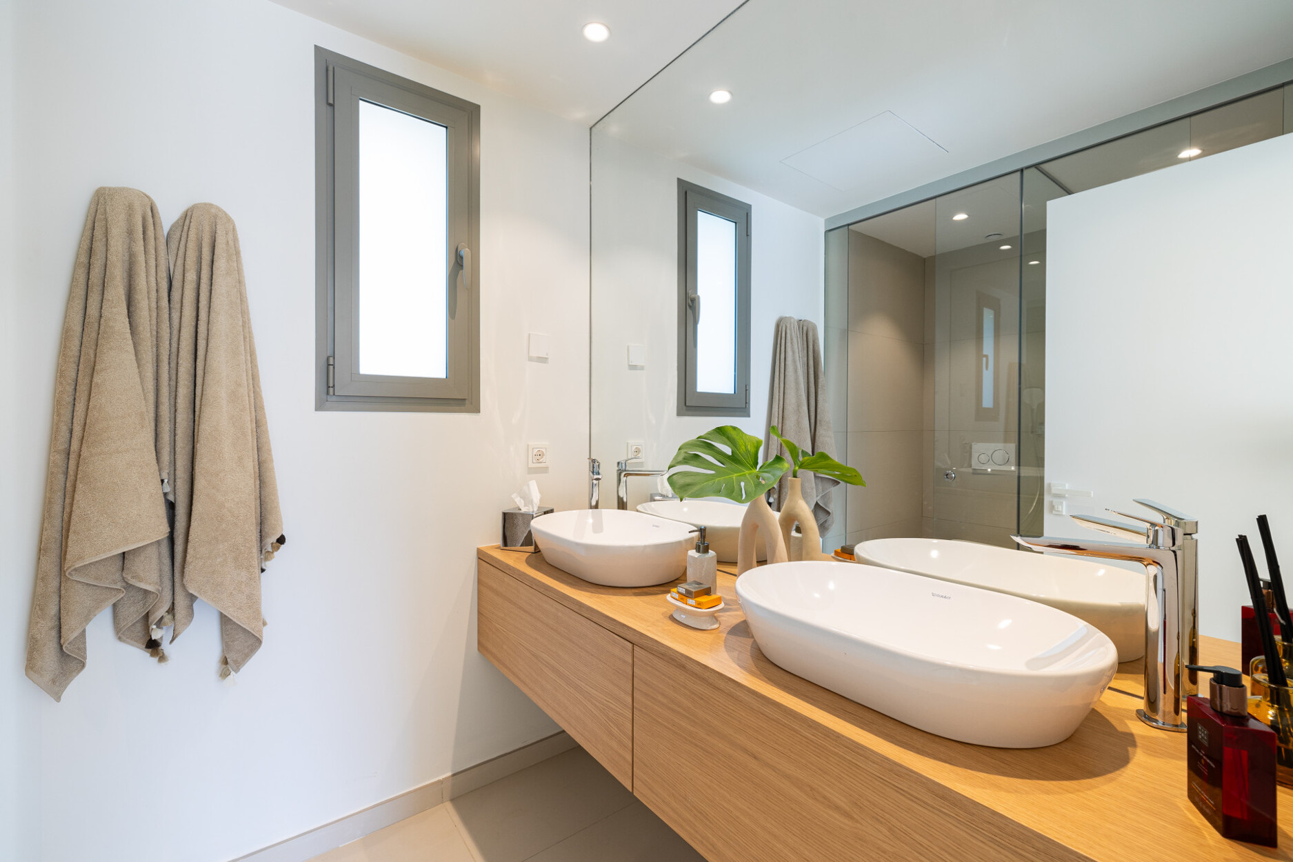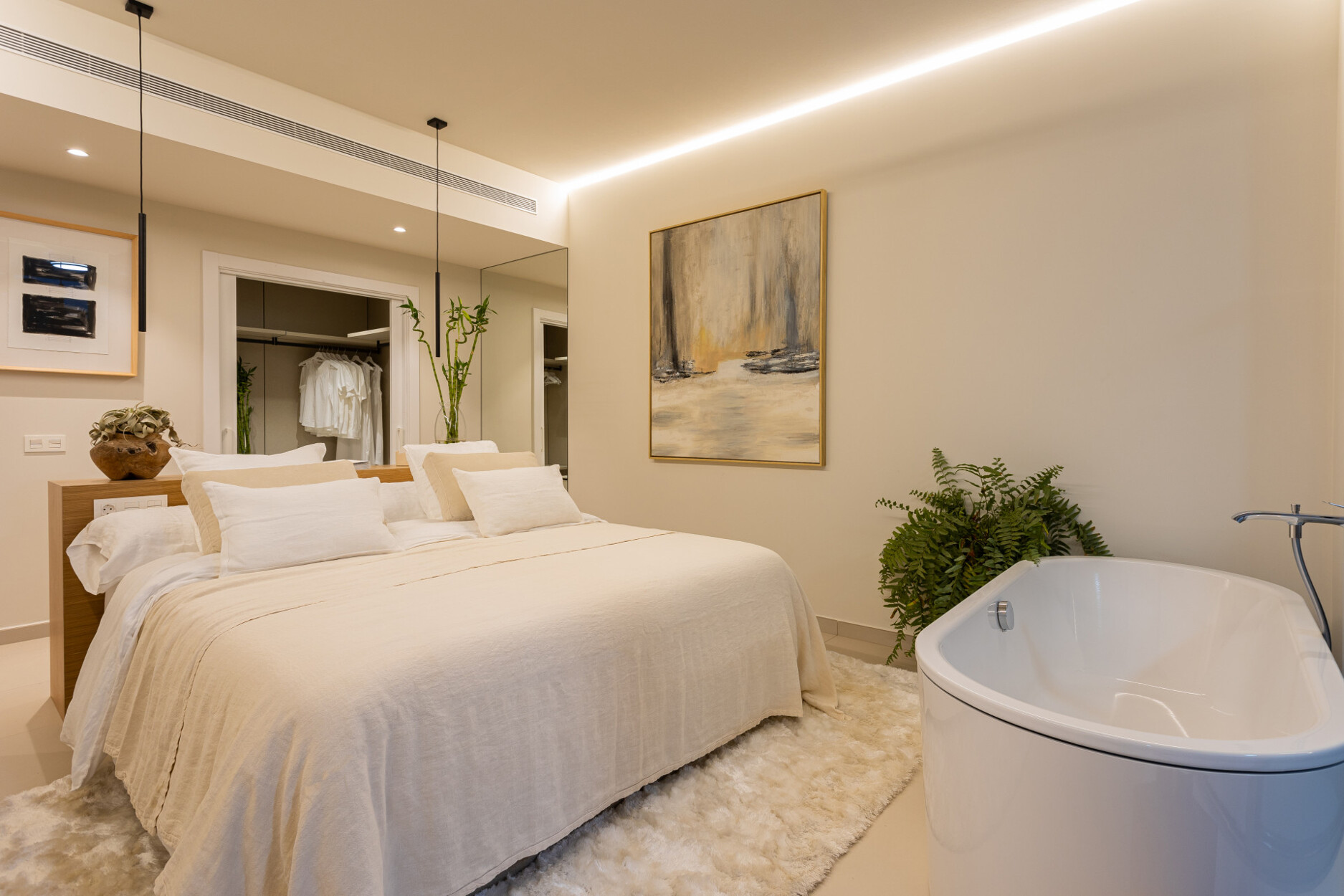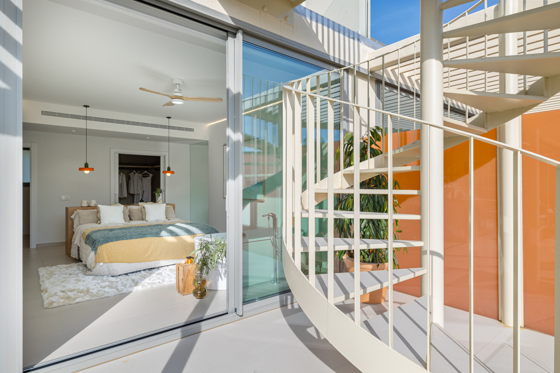 De interieurs van het penthouse onderscheiden zich door hun uitzonderlijke kwaliteit, met Saloni-keramische vloeren en een keuken uitgerust met Bosch- en AEG-apparatuur. Vloerverwarming zorgt het hele jaar door voor optimaal comfort. Domotica biedt gemak en controle, terwijl de badkamers luxe afwerkingen hebben van merken zoals Kaldewei, Duravit en Hansgrohe. Elke kamer heeft directe toegang tot het enorme terras, waardoor natuurlijk licht de ruimte kan binnenstromen en de neutrale en warme tinten kan accentueren die een gezellige en elegante sfeer creëren.