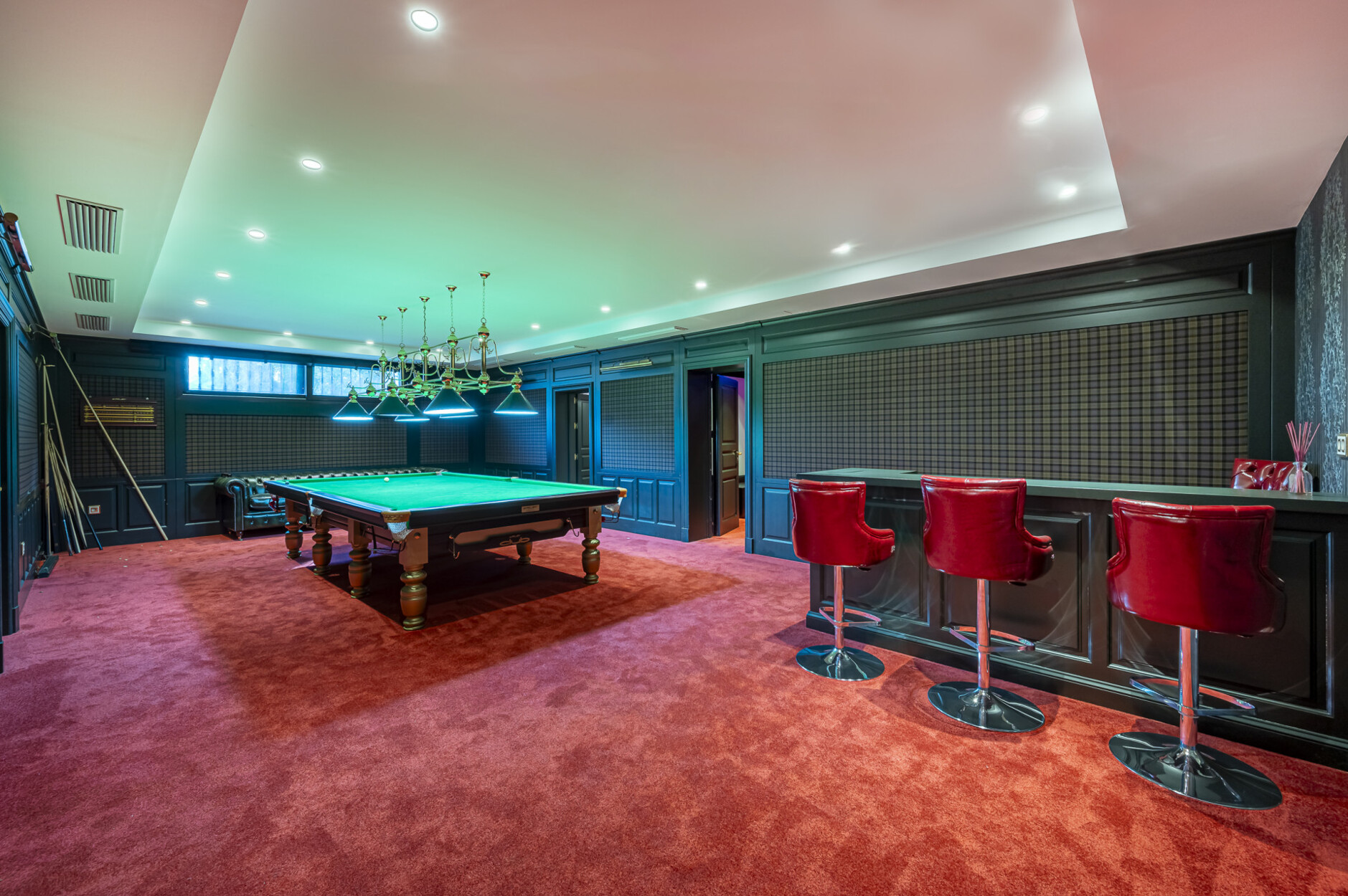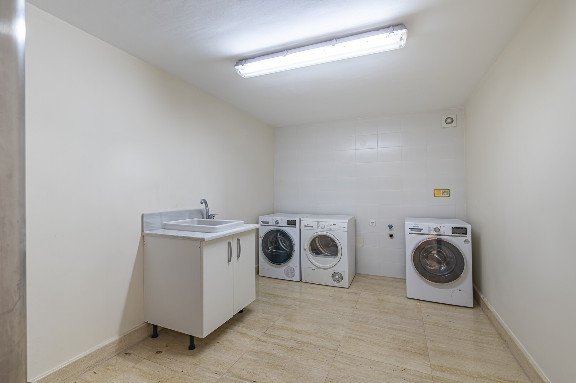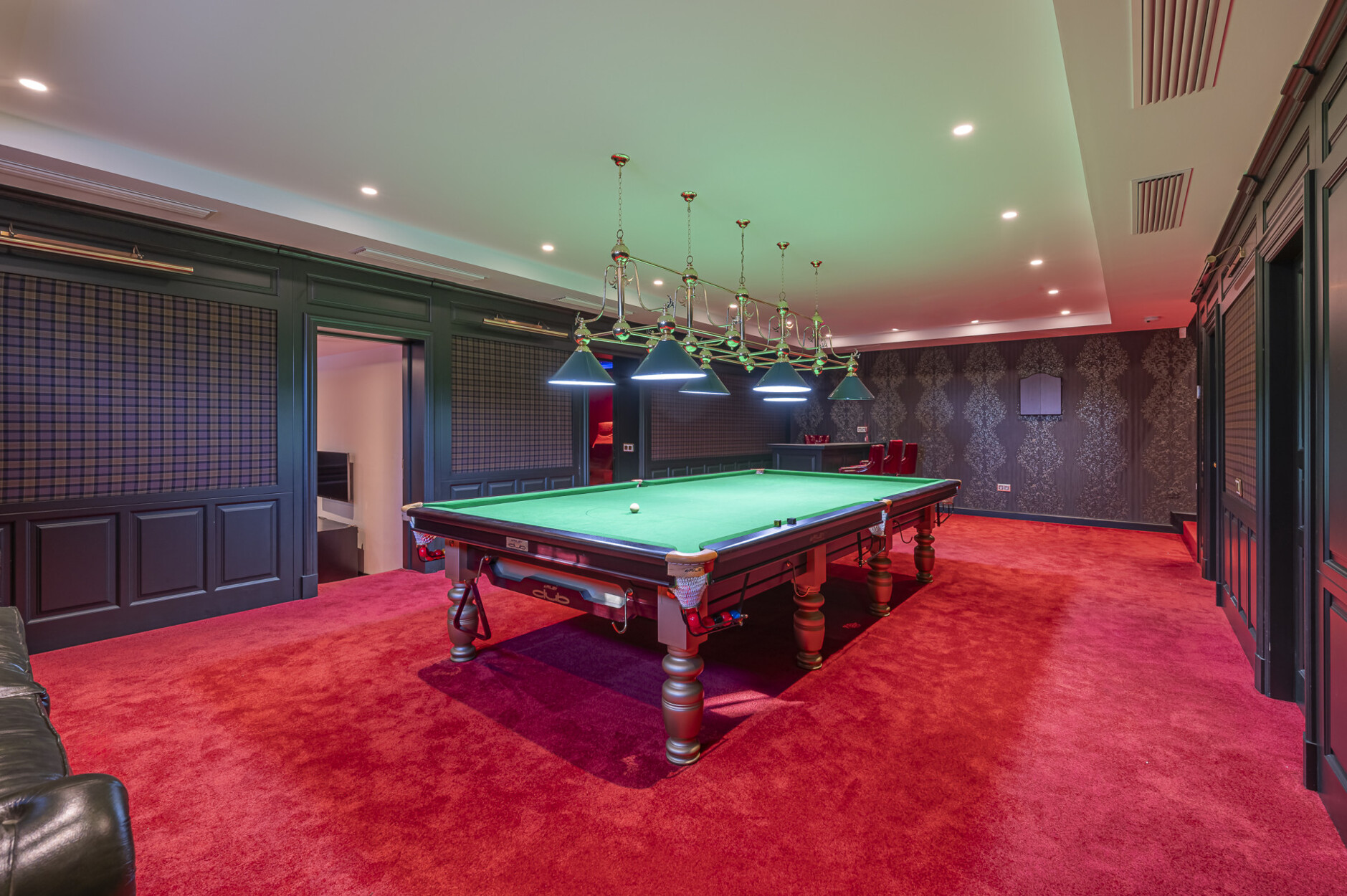 Veiligheid, van het grootste belang voor een villa van deze aard, wordt versterkt door een ultramodern alarmsysteem, naast de gemoedsrust die het wonen in een omheinde gemeenschap met zich meebrengt. Entertainment staat centraal, met een bioscoopzaal en een speelkamer, inclusief een pooltafel, die beide heerlijke ruimtes bieden voor ontspanning en sociale bijeenkomsten. De villa integreert ook naadloos moderne gemakken, zoals high-speed Wi-Fi internet en een handige wasruimte, wat een extra niveau van comfort en functionaliteit toevoegt aan het dagelijks leven van de bewoners.