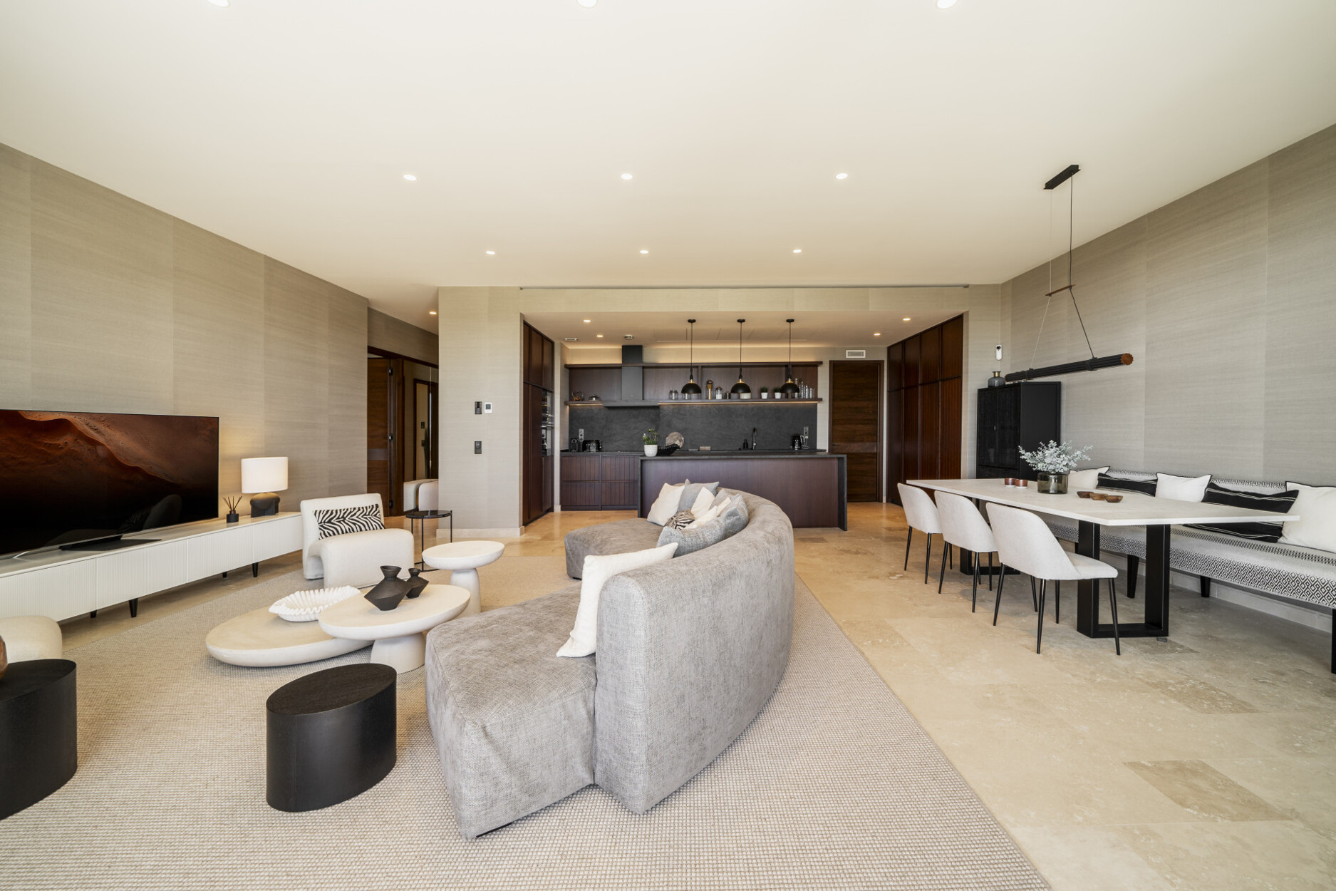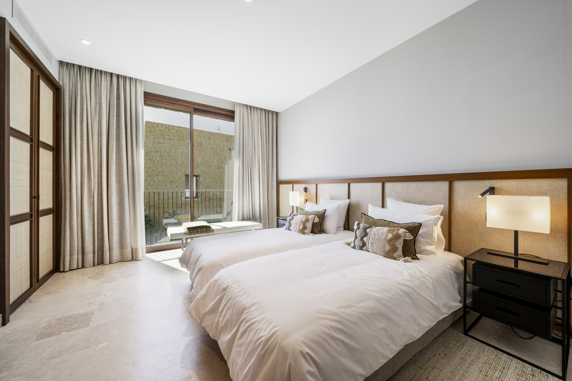 Het appartement beschikt over drie royale en-suite slaapkamers, elk met zandkleurige Carrara marmeren badkamers uitgerust met dubbele wastafels en douches. De master suite heeft een op maat gemaakte kleedkamer, een ligbad en een groot raam dat direct uitkomt op het terras. De houten afwerking en hoogwaardige materialen in het hele pand creëren een gastvrije sfeer, terwijl het kleurenpalet in warme tinten perfect past bij de natuurlijke omgeving.
