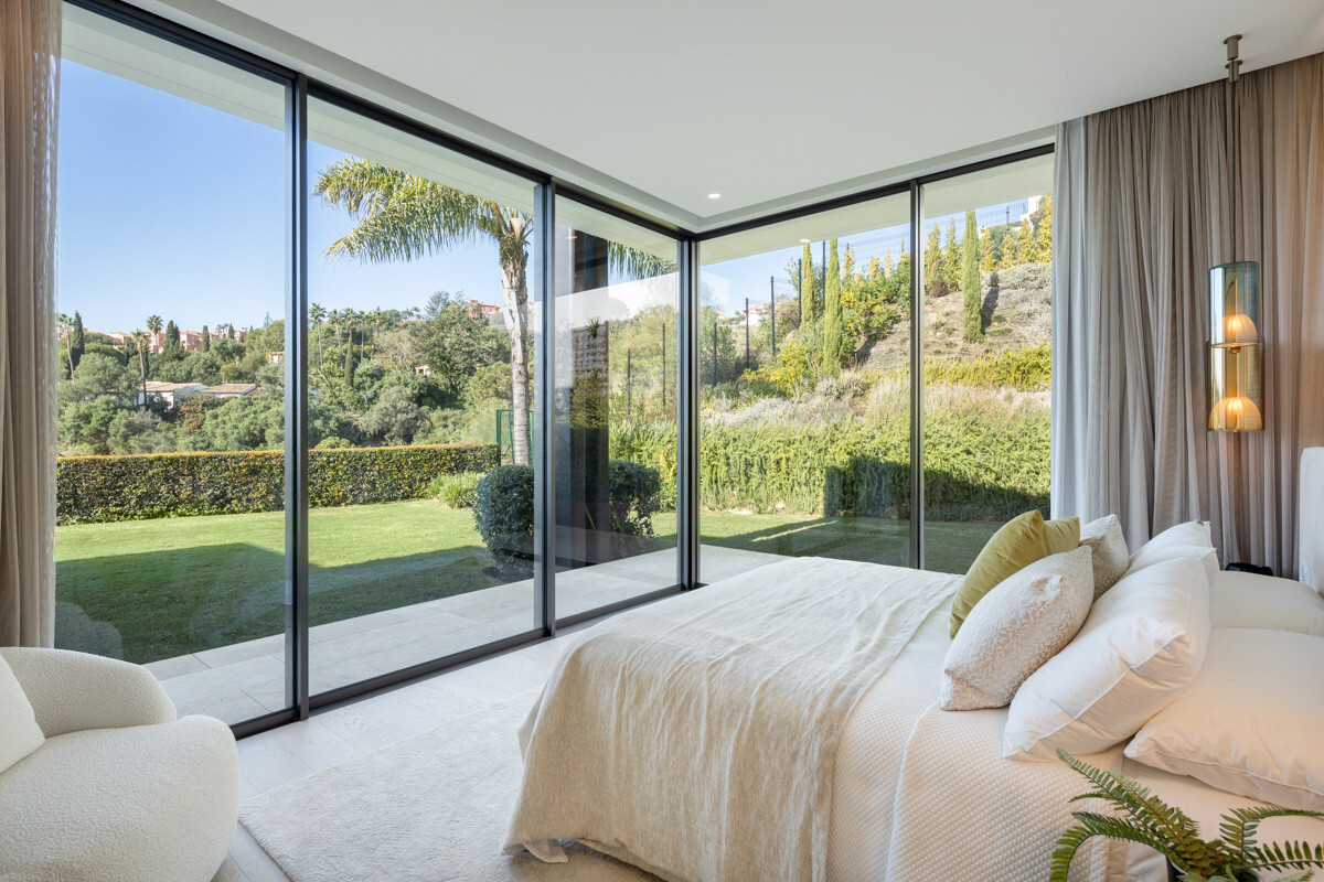 Het interieur van de villa wordt gekenmerkt door een elegant en functioneel ontwerp, met een open indeling die het natuurlijke licht maximaliseert. Door de grote ramen is het panoramische uitzicht een integraal onderdeel van de ruimte, terwijl de inrichting, door Aalto Exclusive Design, verfijning en warmte toevoegt. De villa heeft vier slaapkamers, waaronder een indrukwekkende master suite met een kleedkamer en en-suite badkamer, allemaal ontworpen om maximaal comfort en privacy te bieden aan de bewoners.