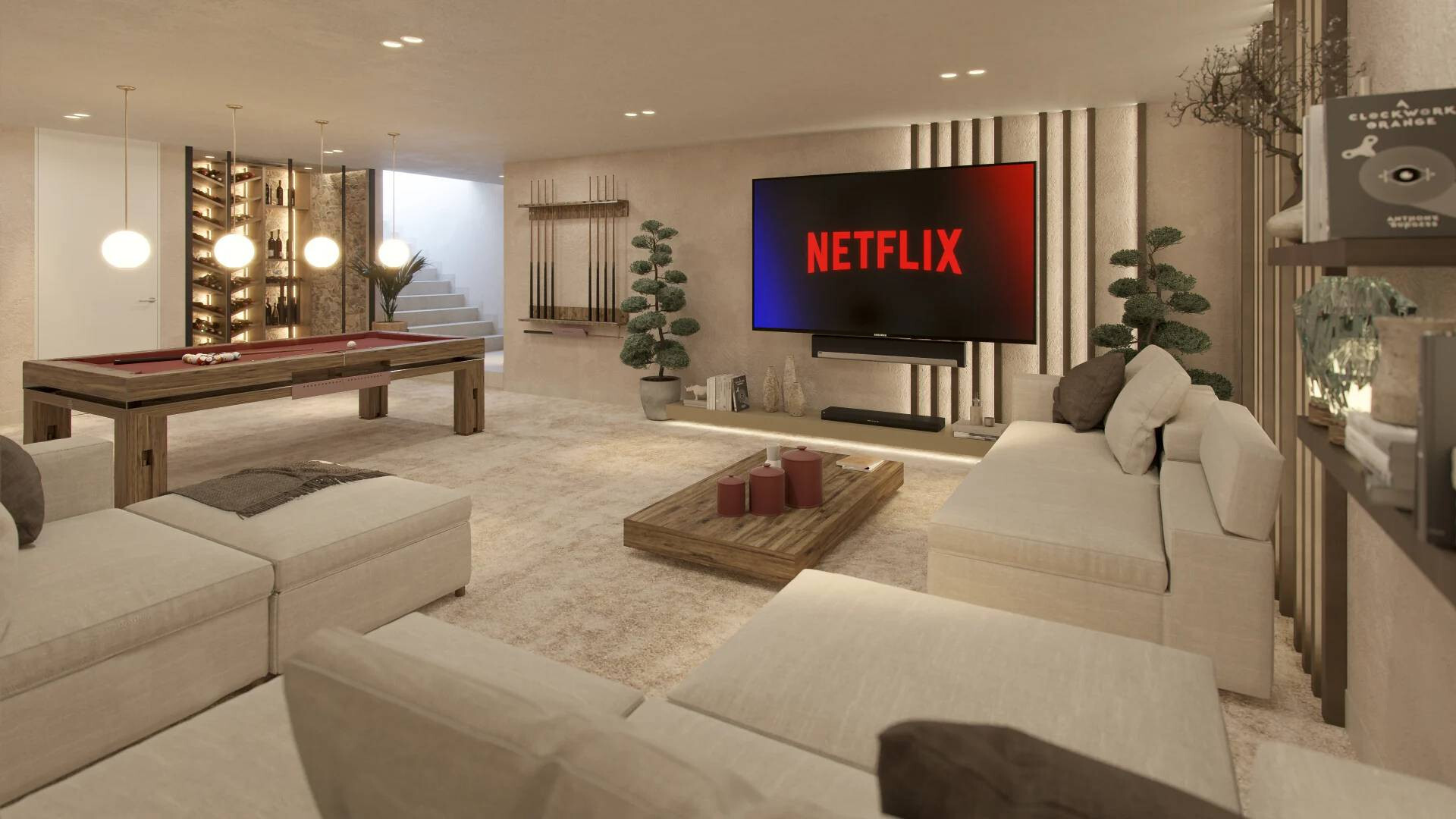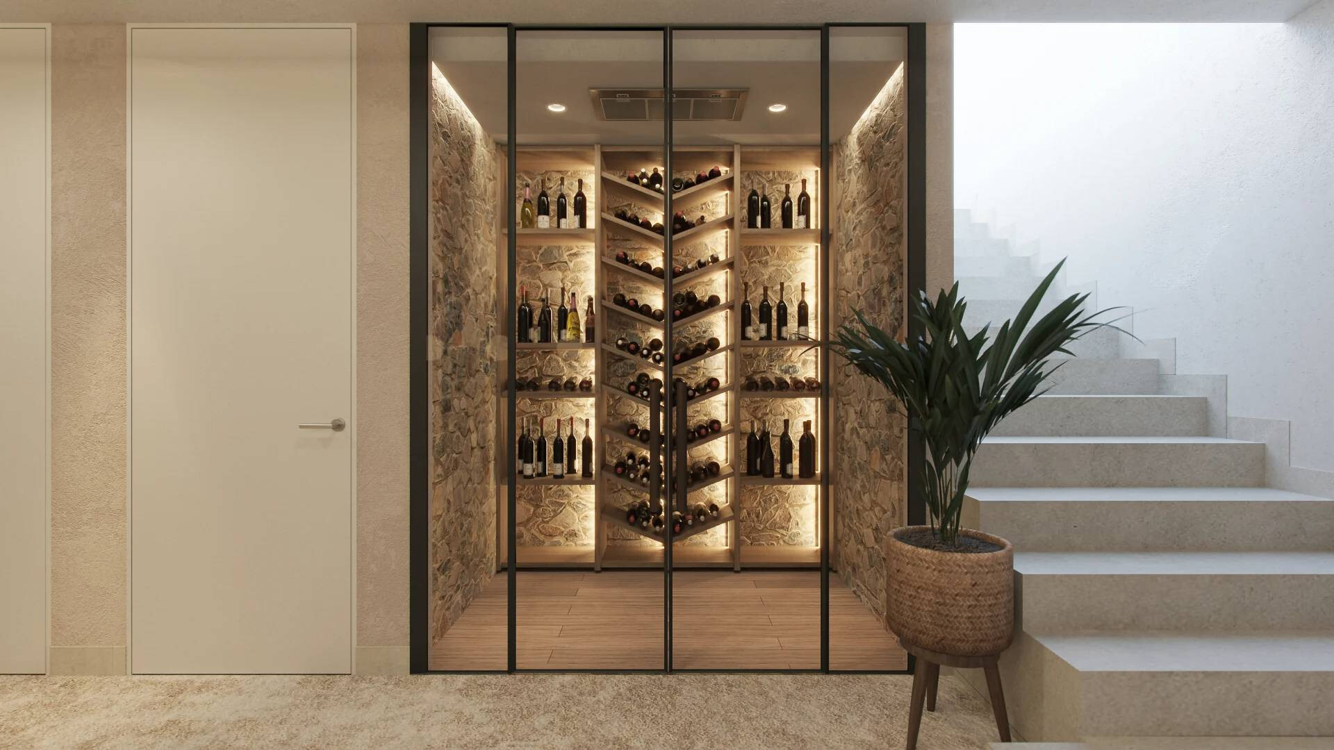 Het interieur van de villa combineert elegantie en comfort, met 5 slaapkamers, 3 en-suite badkamers en 2 toiletten, ontworpen voor welzijn. De minimalistische en aanpasbare keuken sluit aan op een verfijnde eetkamer. De woonkamer, met glazen deuren, opent naar een ruim terras. Daarnaast zijn er luxe voorzieningen zoals een wijnkelder, entertainmentruimte en privékantoor, ideaal voor een exclusieve levensstijl.