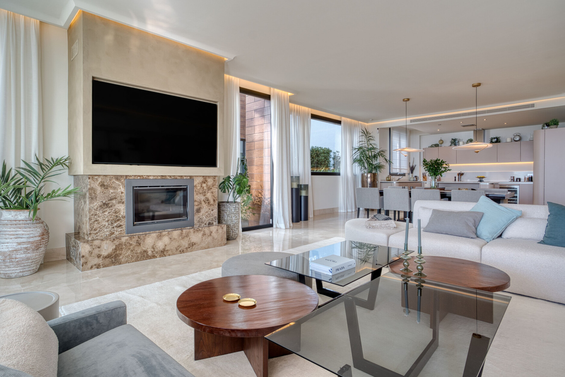 Het interieur van de woning wordt gekenmerkt door zijn open en moderne indeling. De lichte en ruime woon- en eetkamer staat in directe verbinding met de privéterrassen, waardoor een maximale integratie van binnen- en buitenruimte mogelijk is. De keuken is uitgerust met apparatuur van topklasse en biedt een ideale omgeving om zowel met het gezin te koken als gasten te ontvangen. De master suite is een luxueus toevluchtsoord, met directe toegang tot het terras en een eigentijdse en-suite badkamer.