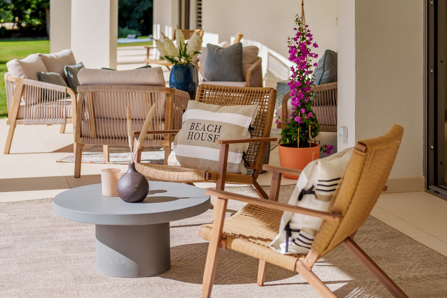De villa valt op door de indrukwekkende botanische tuin, ontworpen door het gerenommeerde bedrijf Fantastic Garden. Met soorten als majestueuze ficussen, Washingtonia robusta palmen, violette jacaranda's en torenhoge agaves sluit de natuurlijke omgeving naadloos aan op het architectonische ontwerp. Deze gelijkvloerse villa beslaat een royaal terrein van 3.062 m² en biedt een naadloze overgang tussen de binnen- en buitenruimtes. De villa beschikt over een overdekt terras, ideaal om het hele jaar door buiten te genieten. Volwassen en exotische planten, zoals Strelitzia nicolai en Cycas revoluta, geven het pand een levendige en luxueuze sfeer, perfect om te ontspannen of gasten te ontvangen.