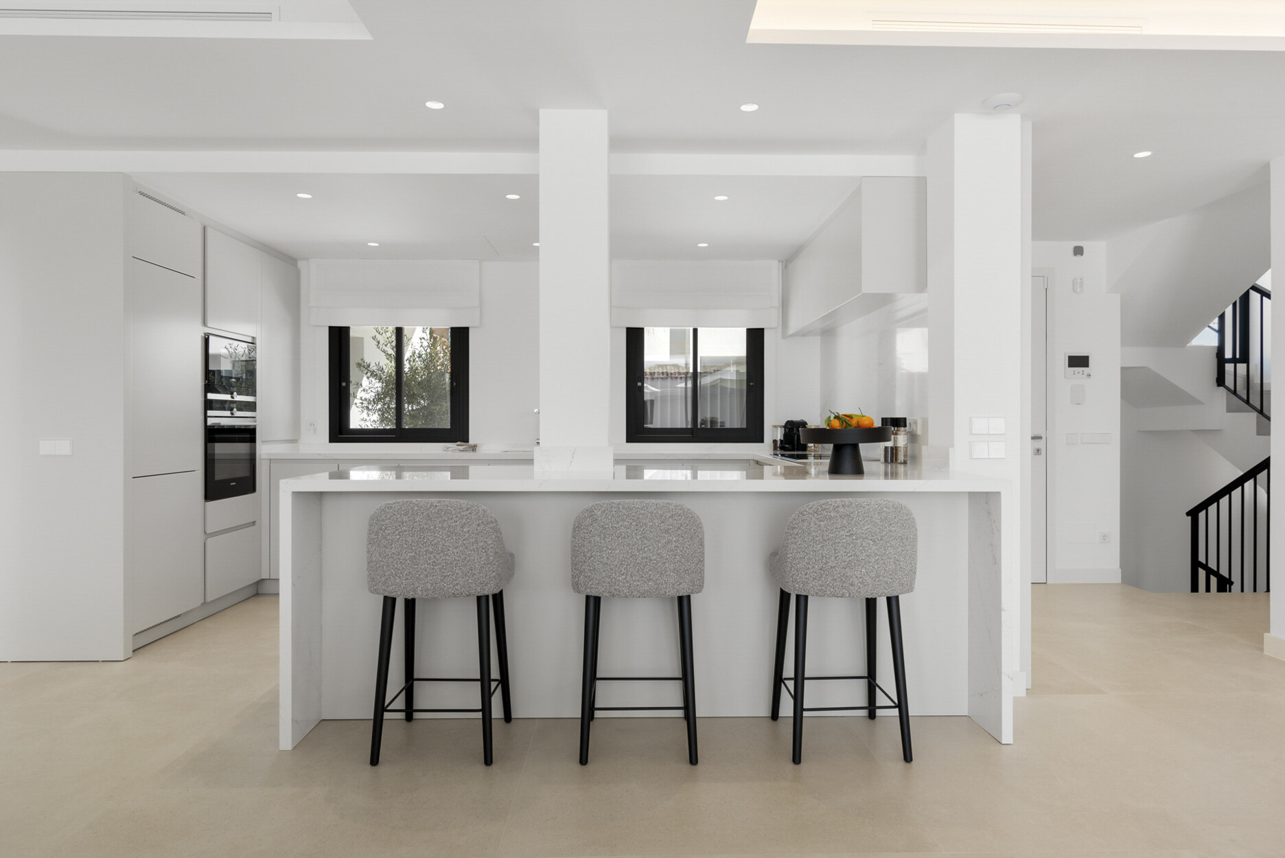 Het interieur is zorgvuldig ontworpen om een luxe en comfortabele sfeer te bieden. De begane grond beschikt over een ruime woonkamer, een moderne keuken met eethoek, allemaal open om de doorstroming tussen de ruimtes te vergemakkelijken. Muur-tot-muur glazen deuren overspoelen het interieur met natuurlijk licht en geven direct toegang tot het terras, waardoor er een naadloze verbinding ontstaat tussen de binnen- en buitenruimtes.