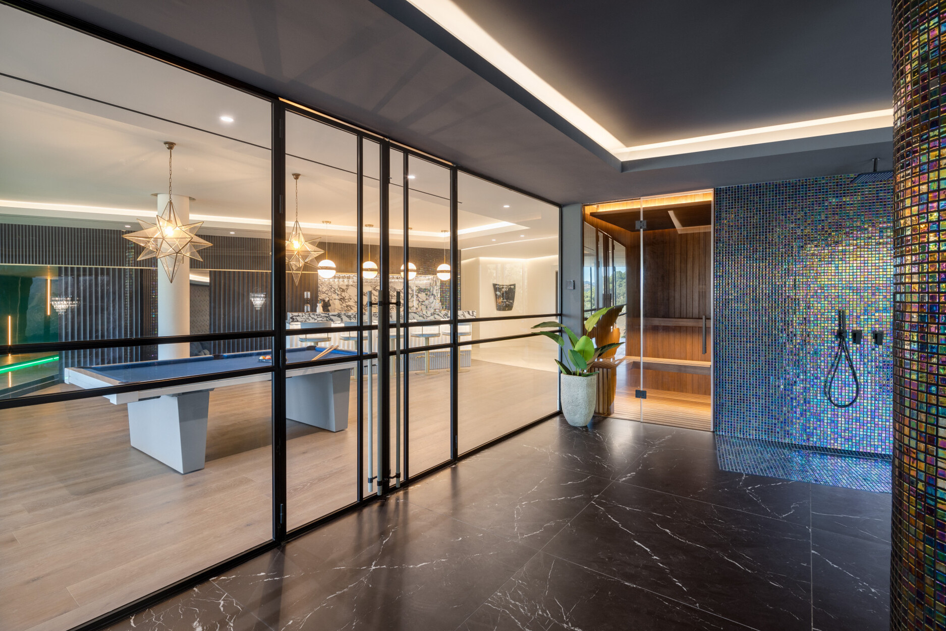 Plezier is gegarandeerd met een 130 meter lange waterglijbaan die langs de centrale glazen lift slingert, plus een speelkamer met een bowlingbaan, bioscoop, biljarttafel en overdekt basketbalveld. Voor wellness beschikt de villa over een volledig spa-centrum en een verwarmd zwembad met verzonken jacuzzi, waardoor de perfecte plek is gecreëerd voor degenen die willen ontspannen en nieuwe energie opdoen in het comfort van hun eigen huis.