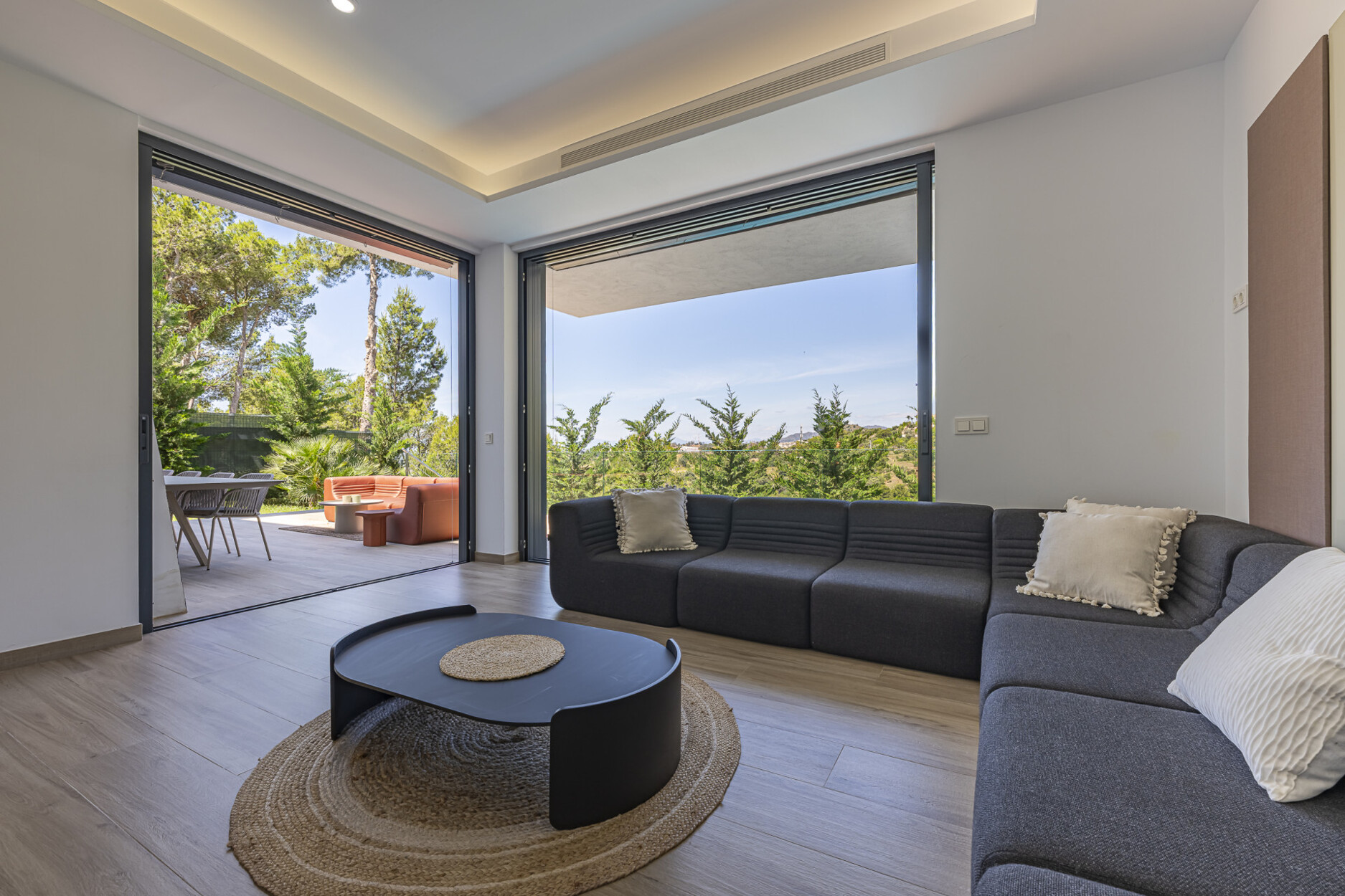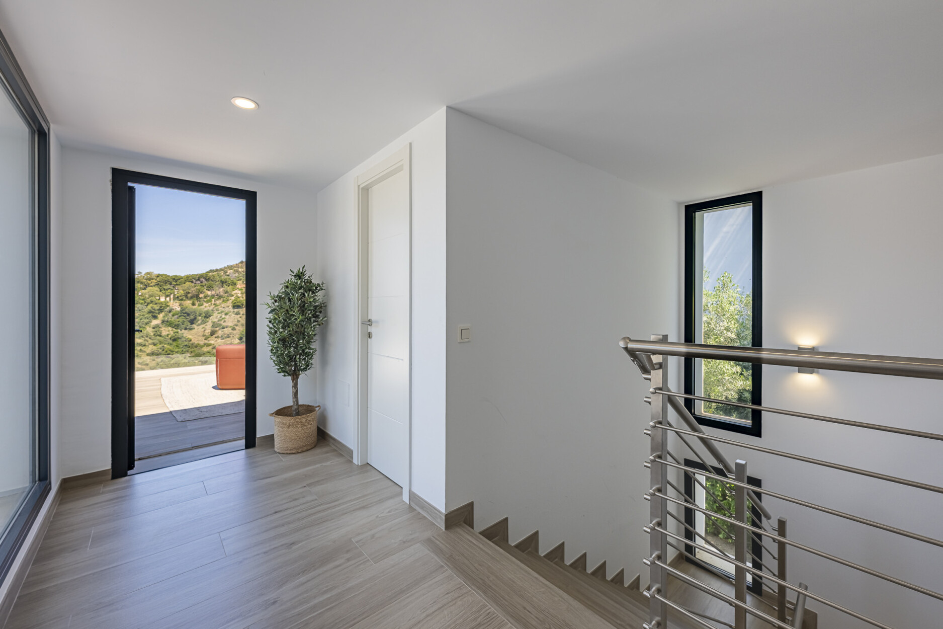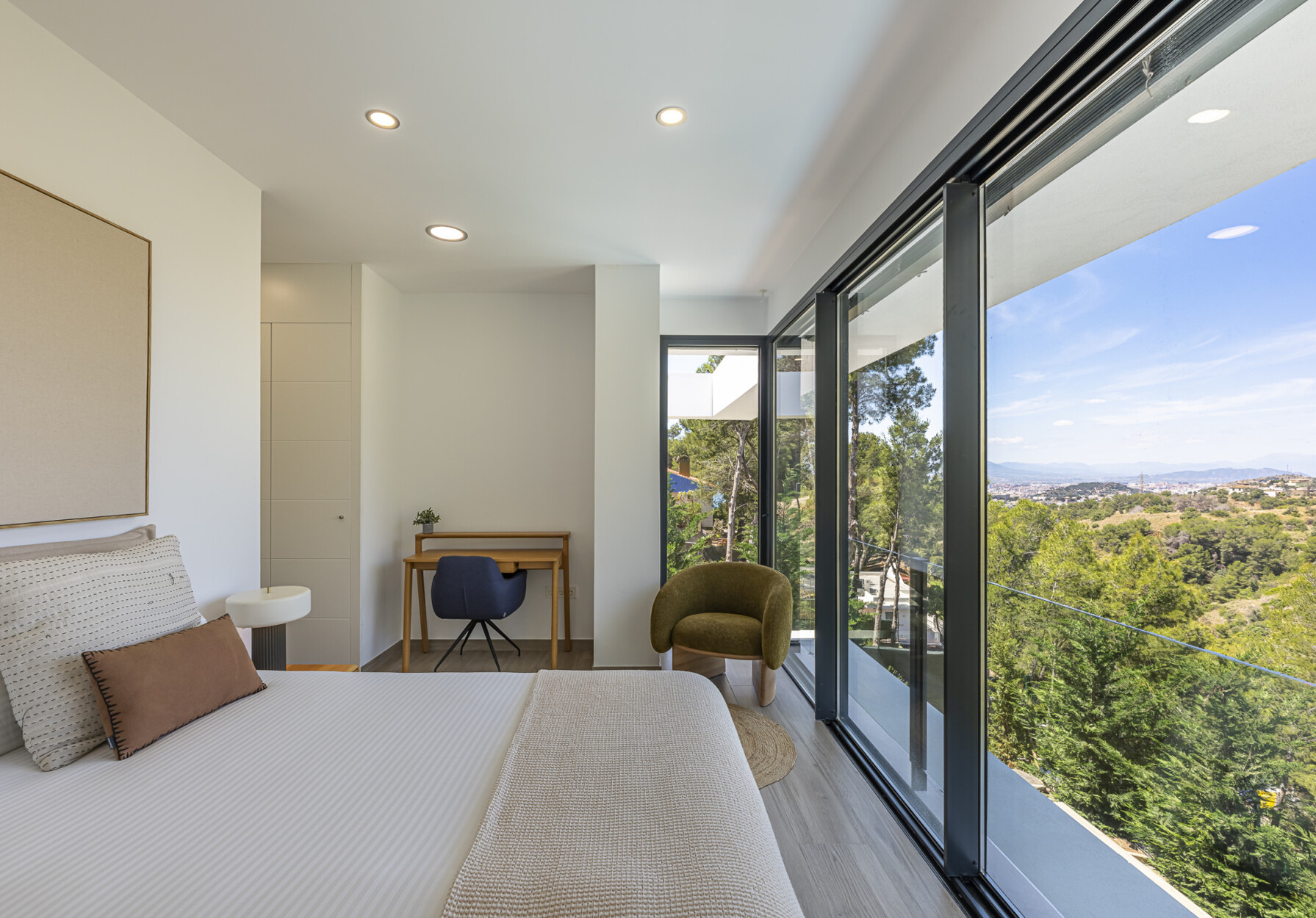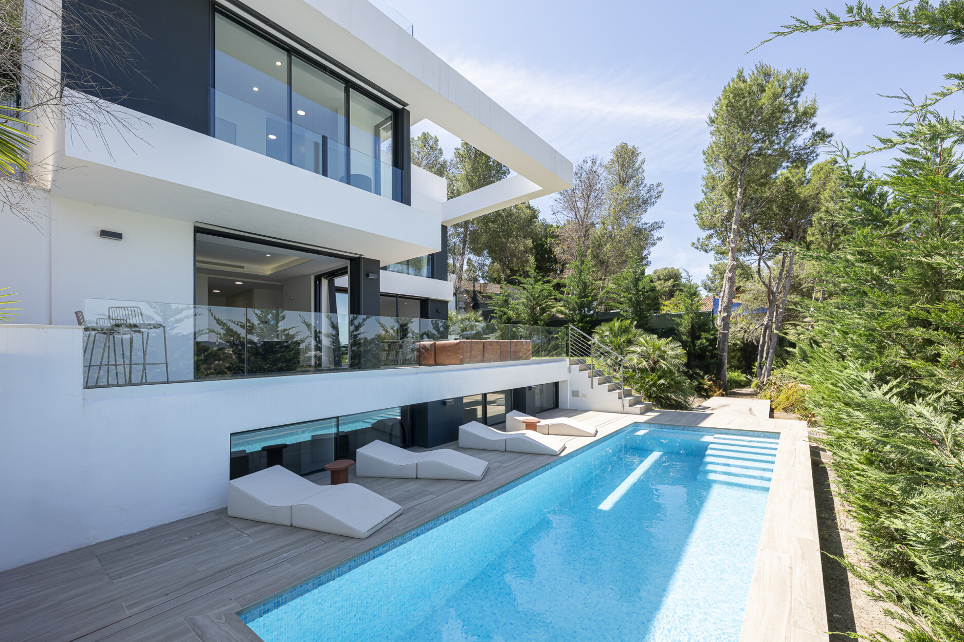 De begane grond beschikt over een stijlvolle open keuken die naadloos overgaat in de woon- en eetkamer, met directe toegang tot de tuin. Op de bovenverdieping bevinden zich drie slaapkamers, waaronder de hoofdslaapkamer met eigen badkamer en inloopkast — alle met vrij uitzicht. Het lagere niveau biedt vier extra kamers, waarvan drie met en-suite badkamers, flexibel in te richten als slaapkamers, kantoorruimte of thuisbioscoop. De hele woning is uitgerust met aerothermische klimaatregeling, vloerverwarming, airconditioning en een vooraf geïnstalleerd domoticasysteem.
