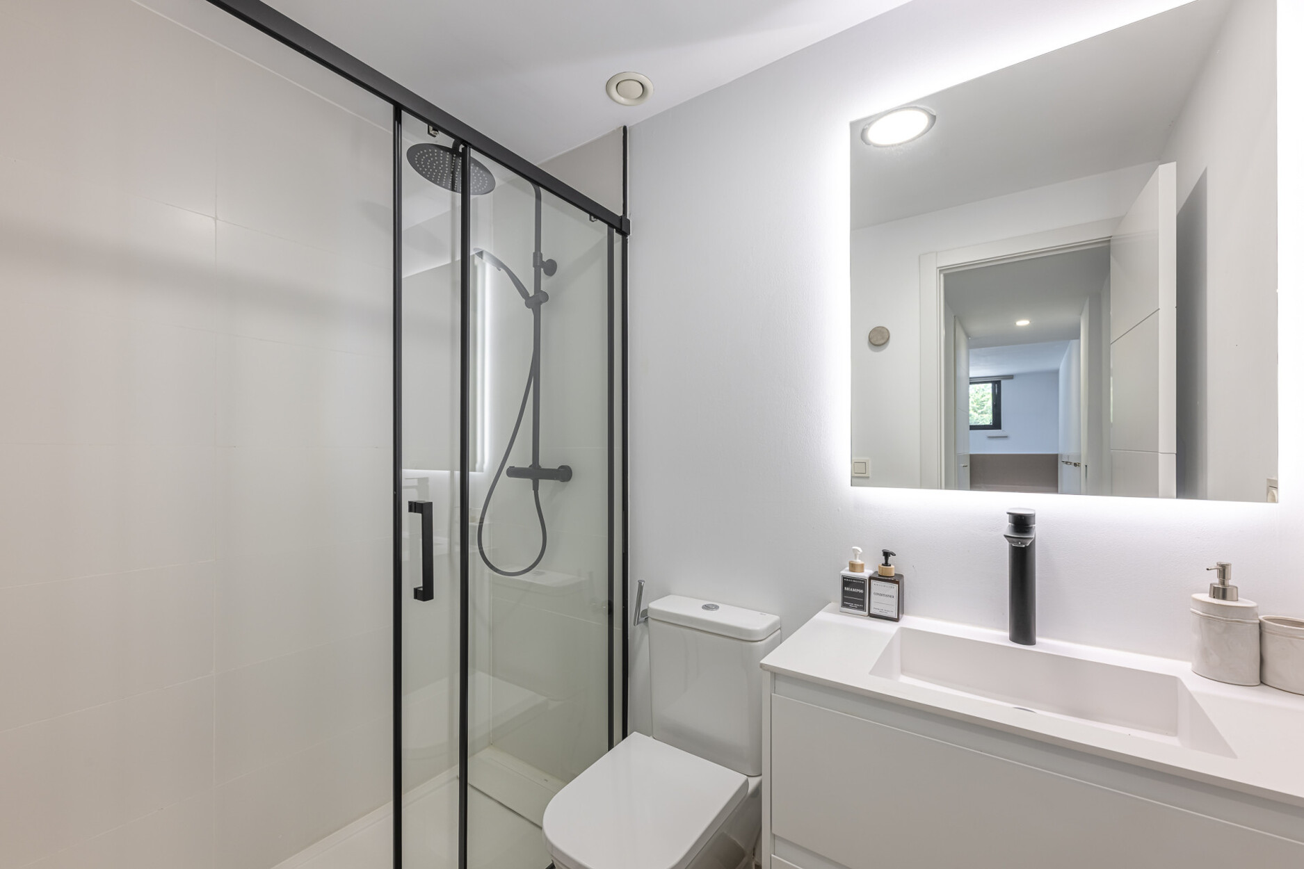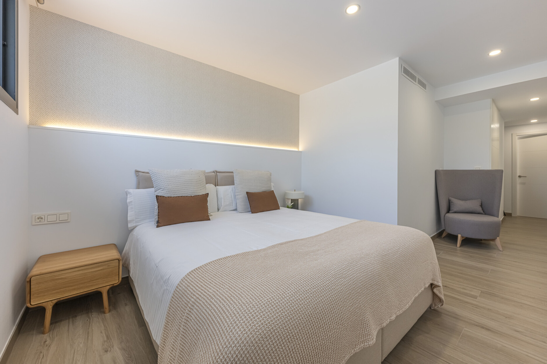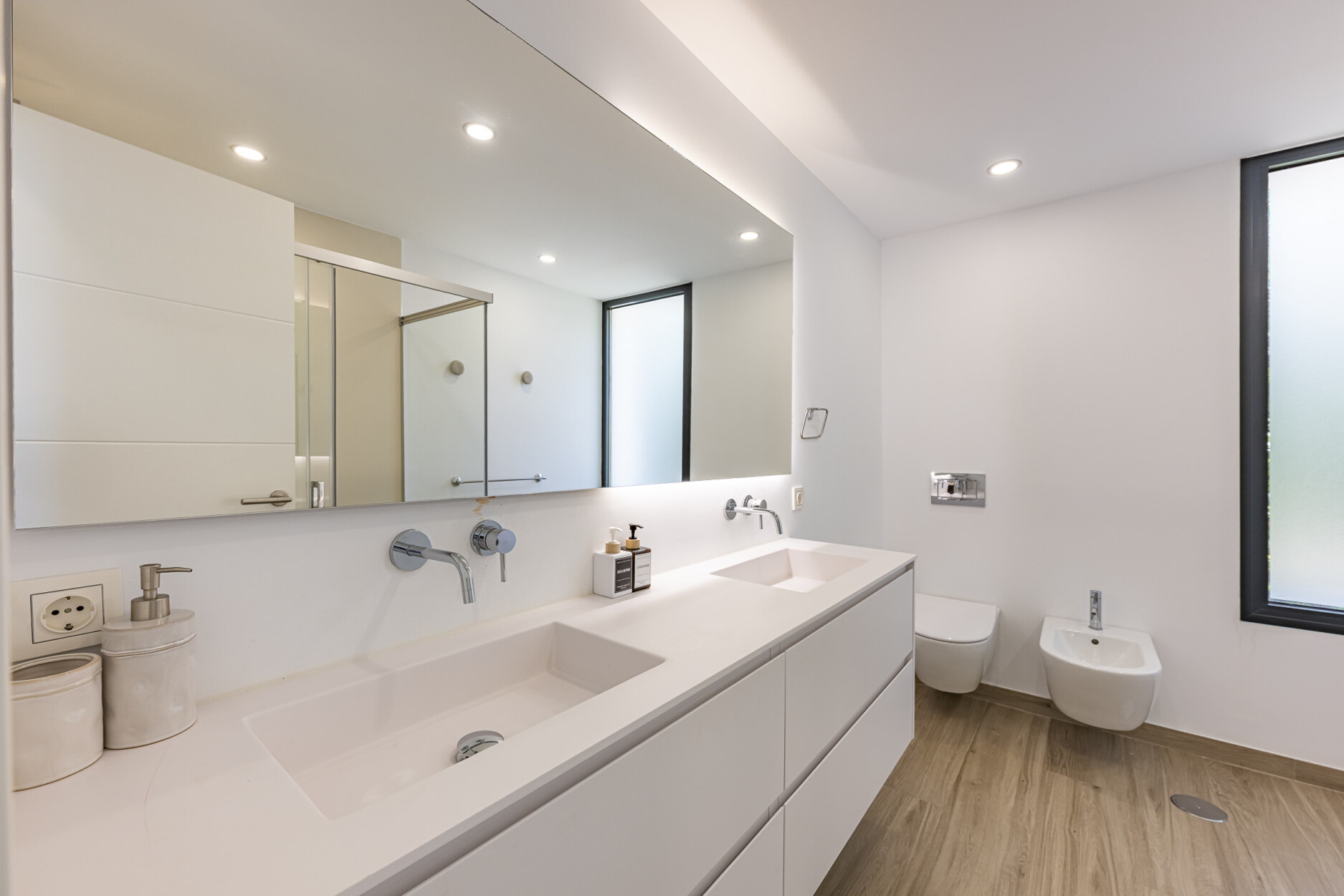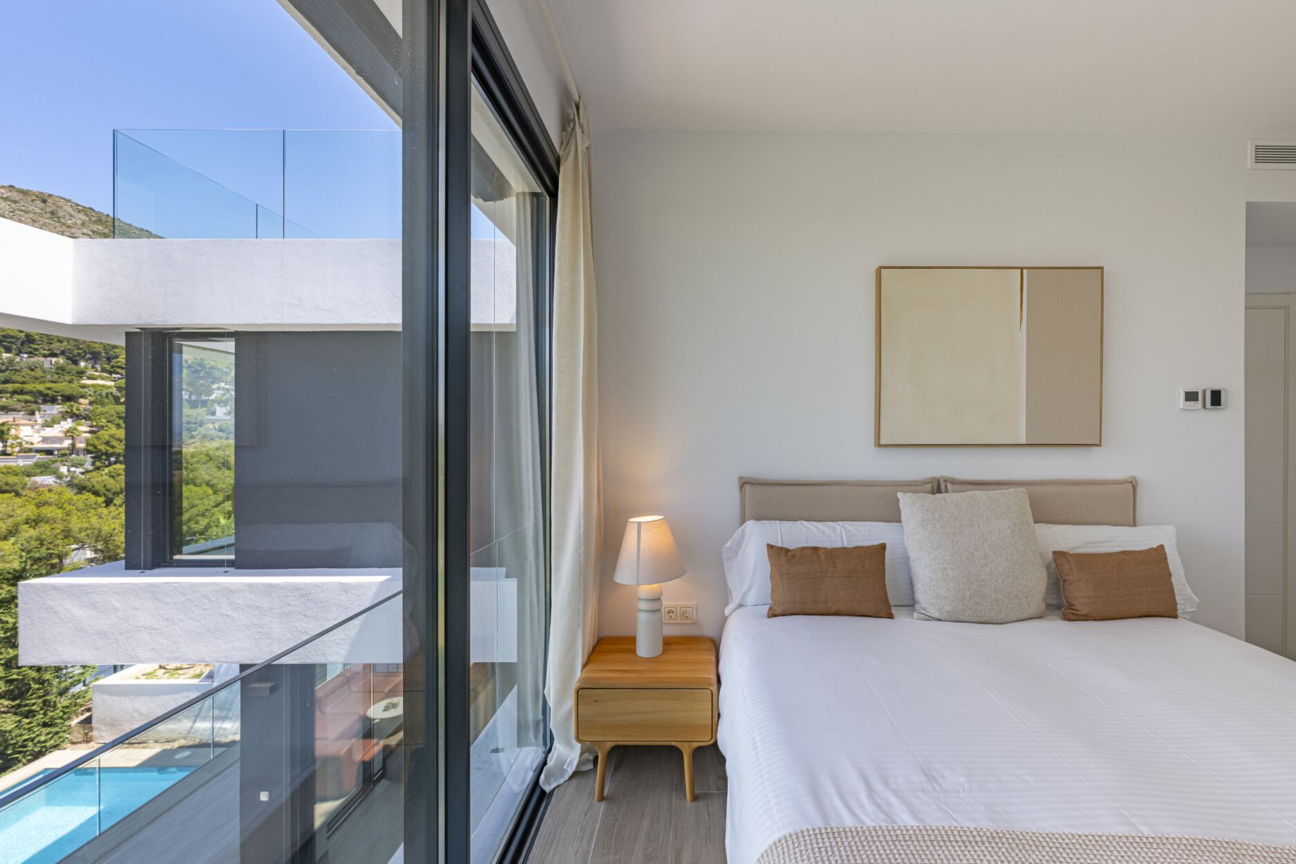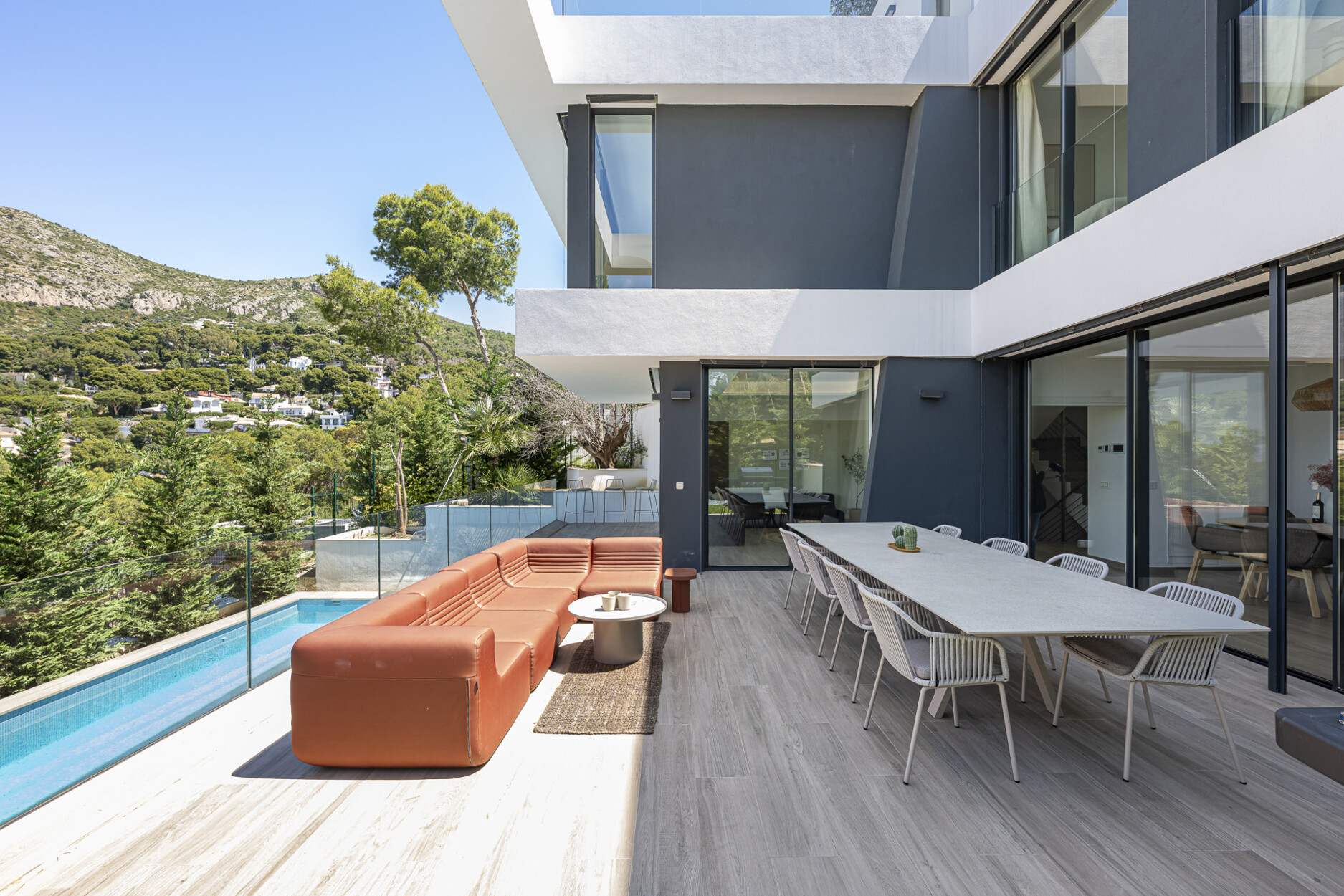 De begane grond beschikt over een stijlvolle open keuken die naadloos overgaat in de woon- en eetkamer, met directe toegang tot de tuin. Op de bovenverdieping bevinden zich drie slaapkamers, waaronder de hoofdslaapkamer met eigen badkamer en inloopkast — alle met vrij uitzicht. Het lagere niveau biedt vier extra kamers, waarvan drie met en-suite badkamers, flexibel in te richten als slaapkamers, kantoorruimte of thuisbioscoop. De hele woning is uitgerust met aerothermische klimaatregeling, vloerverwarming, airconditioning en een vooraf geïnstalleerd domoticasysteem.