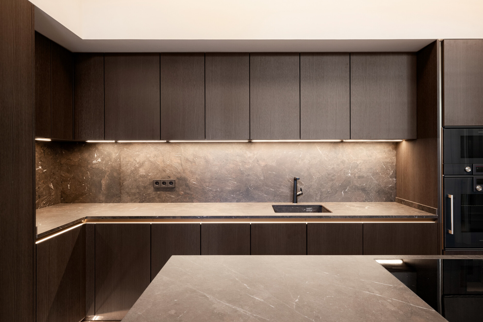Het interieur van de villa straalt warmte en verfijning uit. Ambachtelijke details zoals Murano-glazen lampen, sierlijsten en massief messing deurklinken geven karakter, terwijl de meest geavanceerde domoticasystemen de verlichting, beveiliging en zelfs een innovatieve draaiplatform in de garage aansturen – allemaal via een app te bedienen. De Siematic-keuken, uitgerust met Gaggenau-apparatuur, heeft schuifdeuren waarmee de ruimte flexibel kan worden aangepast aan elke gelegenheid.