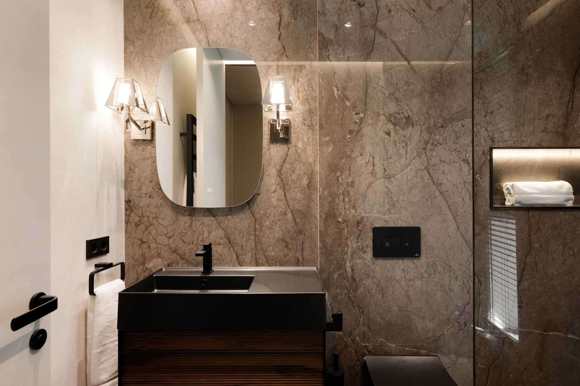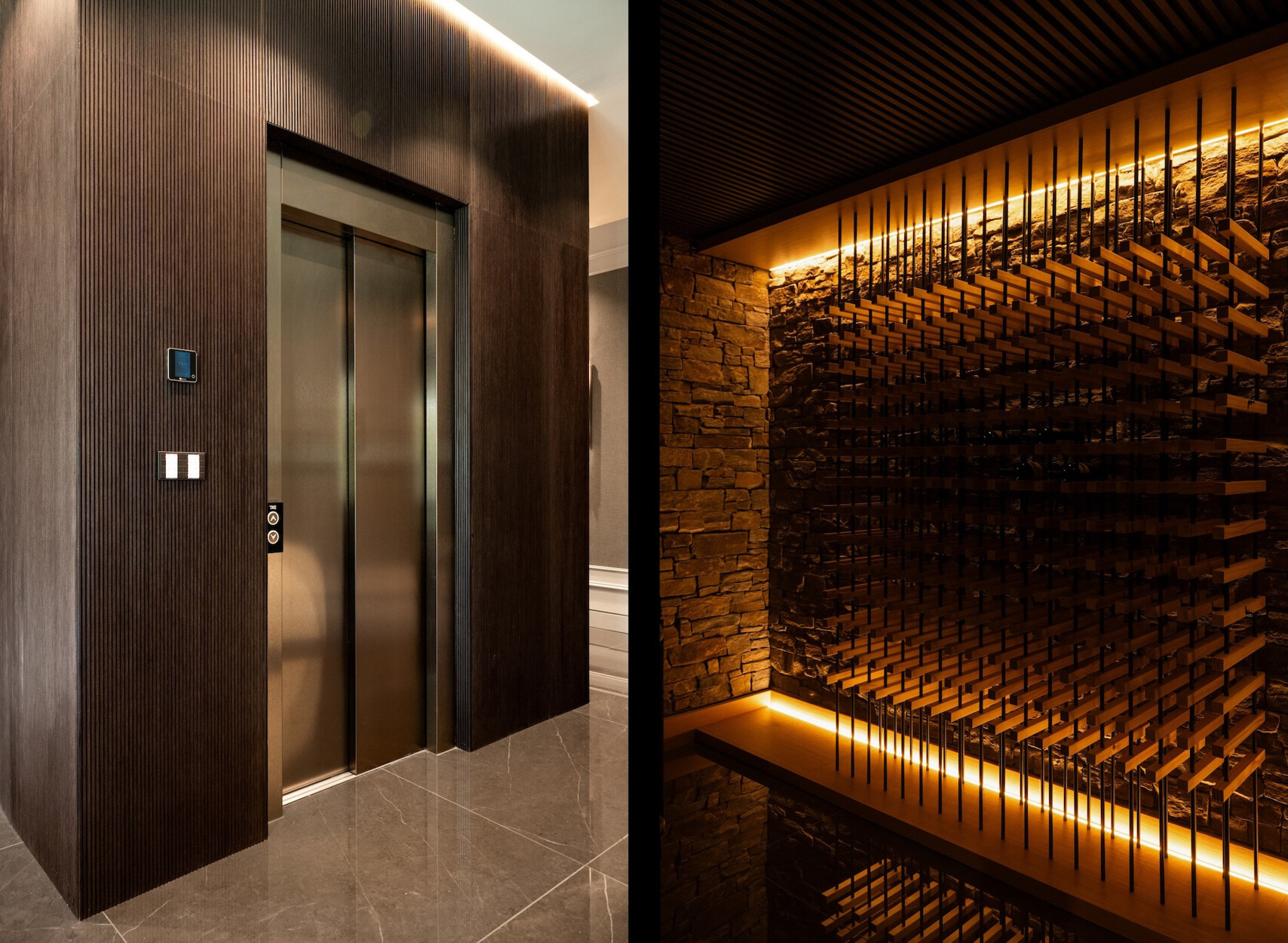 Op het lagere niveau bevindt zich een ware privé wellnessruimte. Voorzien van Technogym fitnessapparatuur, een Finse sauna, stoombad, massageruimte, hydromassagegedeelte met jacuzzi en een elegante, geklimatiseerde wijnkelder met kitchenette – deze ruimte is volledig gewijd aan ultieme ontspanning. Alles is afgewerkt met materialen van de hoogste kwaliteit.