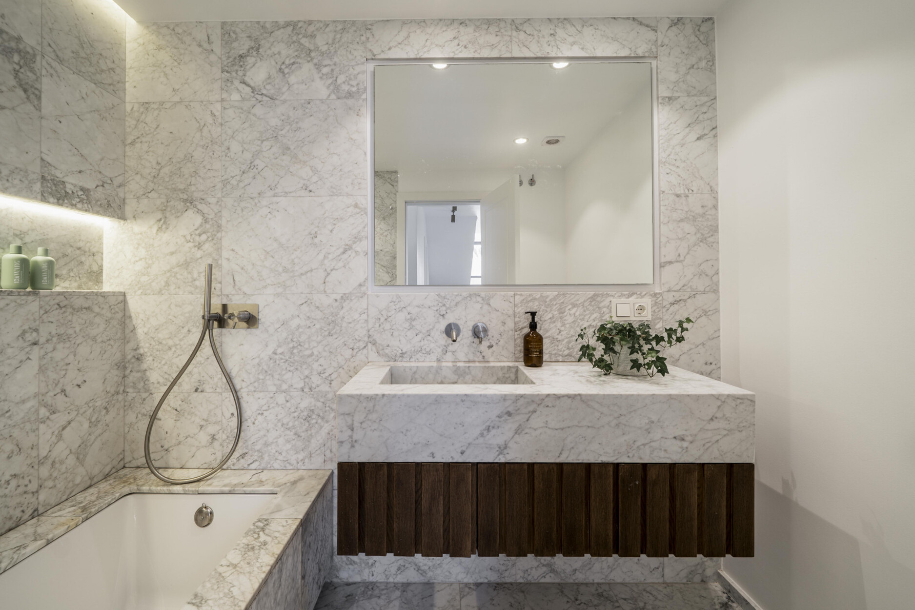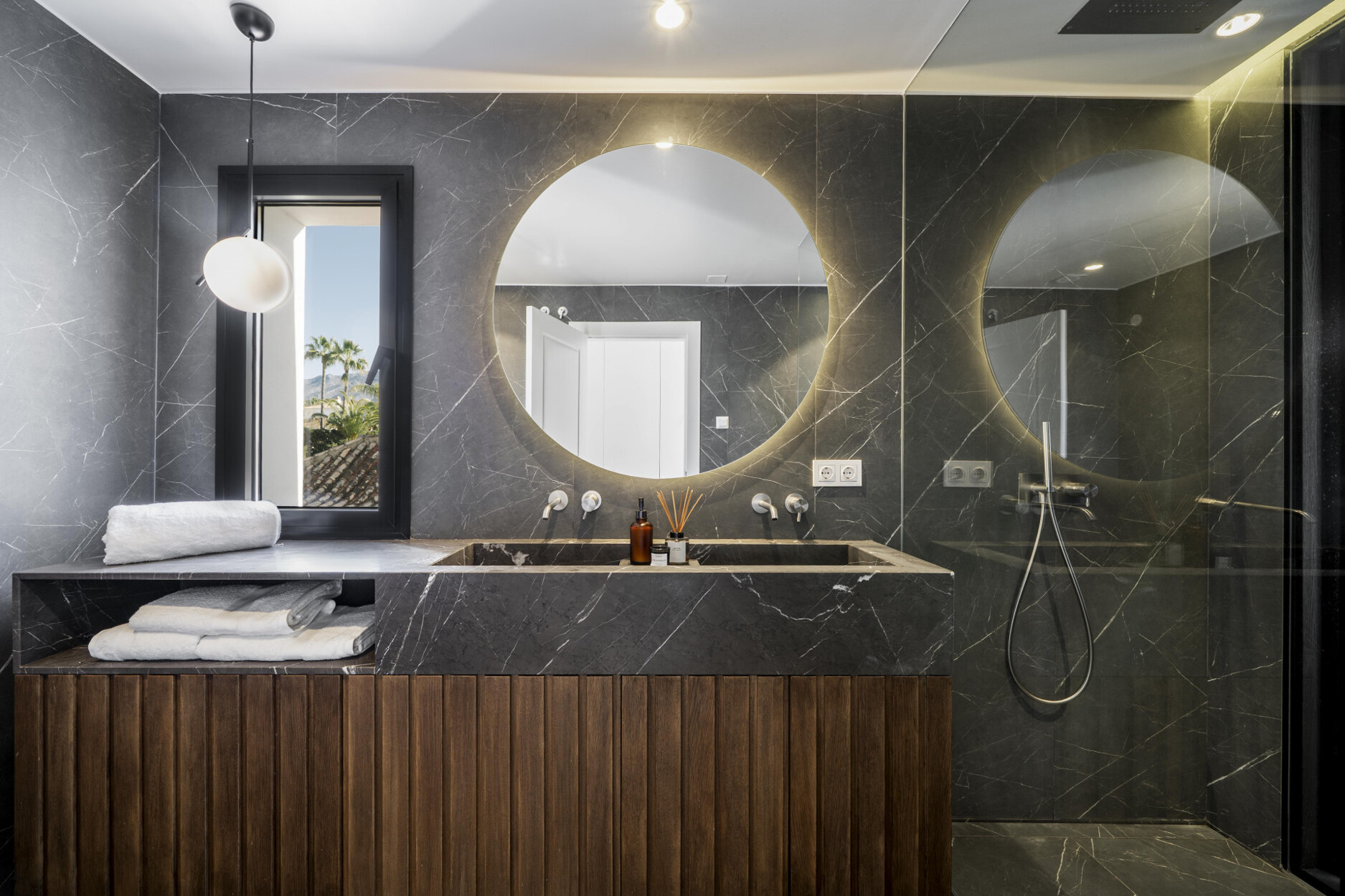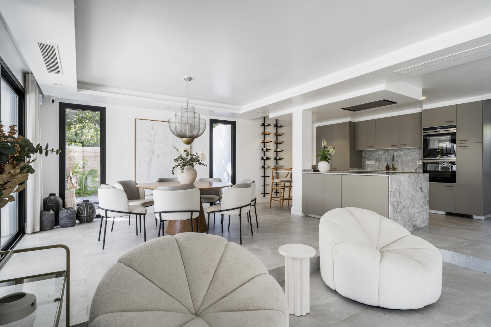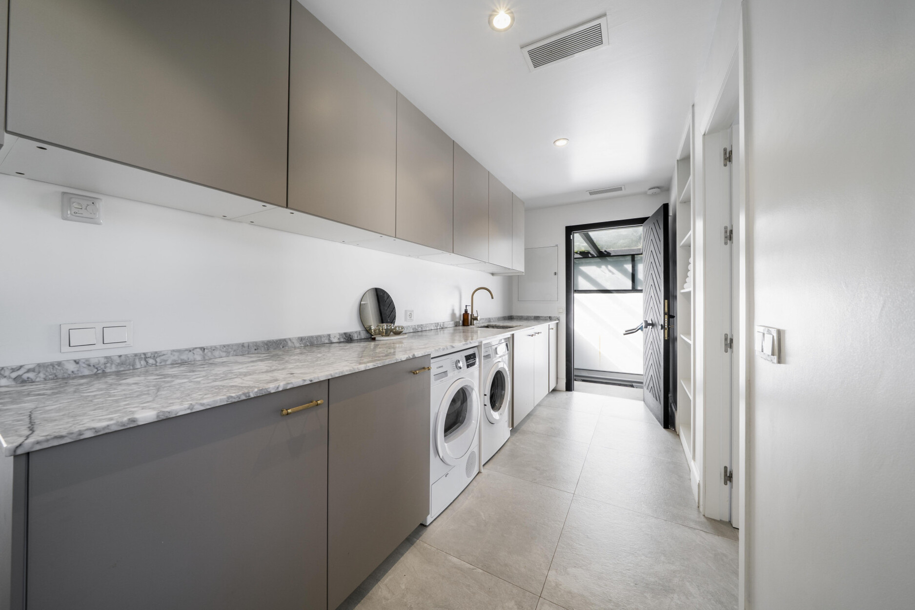 De begane grond beschikt over een open woonkamer met open haard en een moderne keuken met Siemens-apparatuur en een kookeiland. Een neutraal kleurenpalet, badkamers van natuursteen en houten accenten zorgen voor warmte en elegantie. Op dit niveau bevinden zich ook een gym met veel daglicht, twee slaapkamers – waarvan één met en-suite badkamer – en een praktische wasruimte.