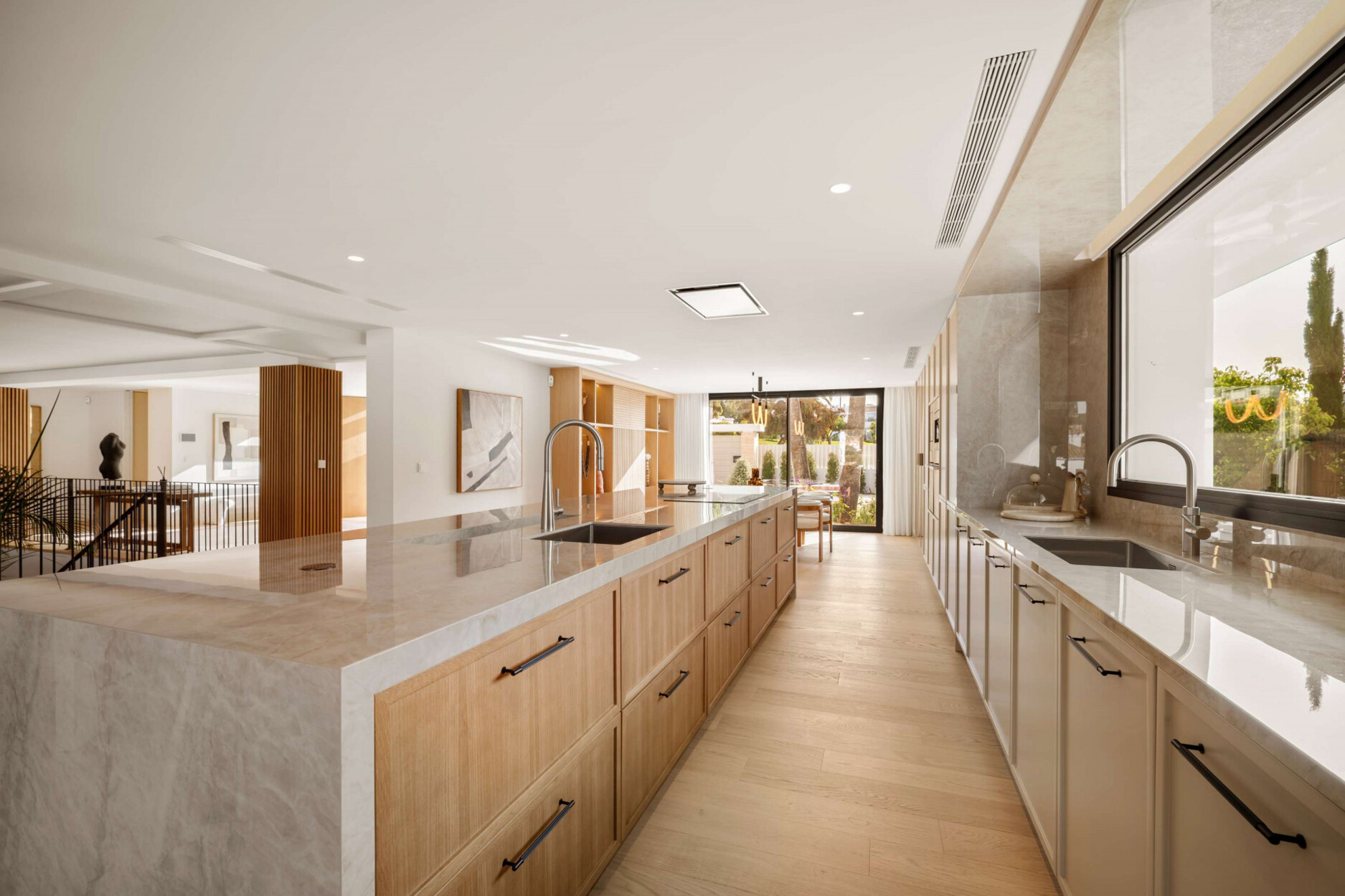 Deze indrukwekkende luxe villa bevindt zich in de exclusieve wijk Aloha Golf, Nueva Andalucía. Volledig gerenoveerd in 2025, is hij ontworpen door het gerenommeerde GC Studio. Het pand combineert moderne architectuur met hoogwaardige, nobele materialen en biedt een perfecte balans tussen design, comfort en verfijning. Met zes ruime slaapkamers en een kelder gewijd aan ontspanning, herdefinieert deze villa de luxe levensstijl in Marbella.