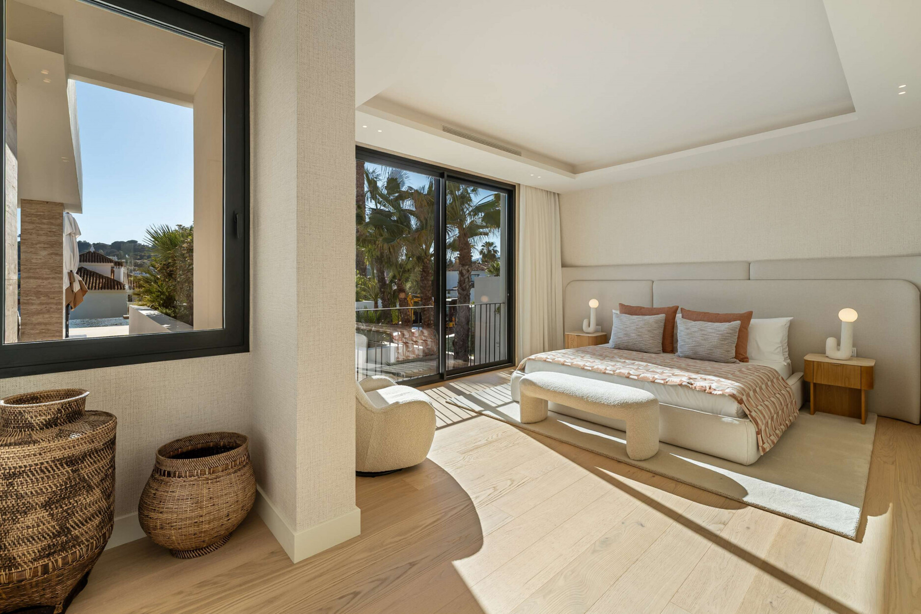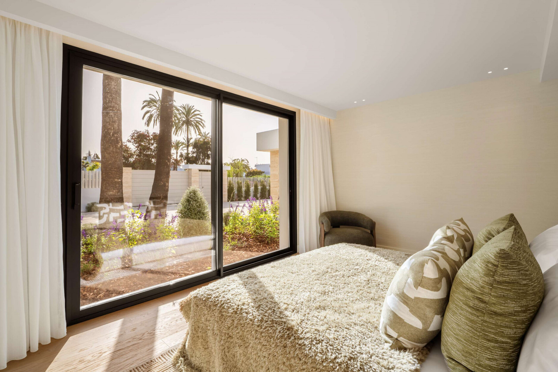 Het exterieur straalt elegantie en verfijning uit, met een symmetrische gevel, grote ramen en weelderige begroeiing die harmonie en warmte toevoegt. De bovenverdieping biedt een privéterras met jacuzzi en spectaculaire uitzichten op de golfbaan, ideaal om te ontspannen en het mediterrane klimaat het hele jaar door te genieten.