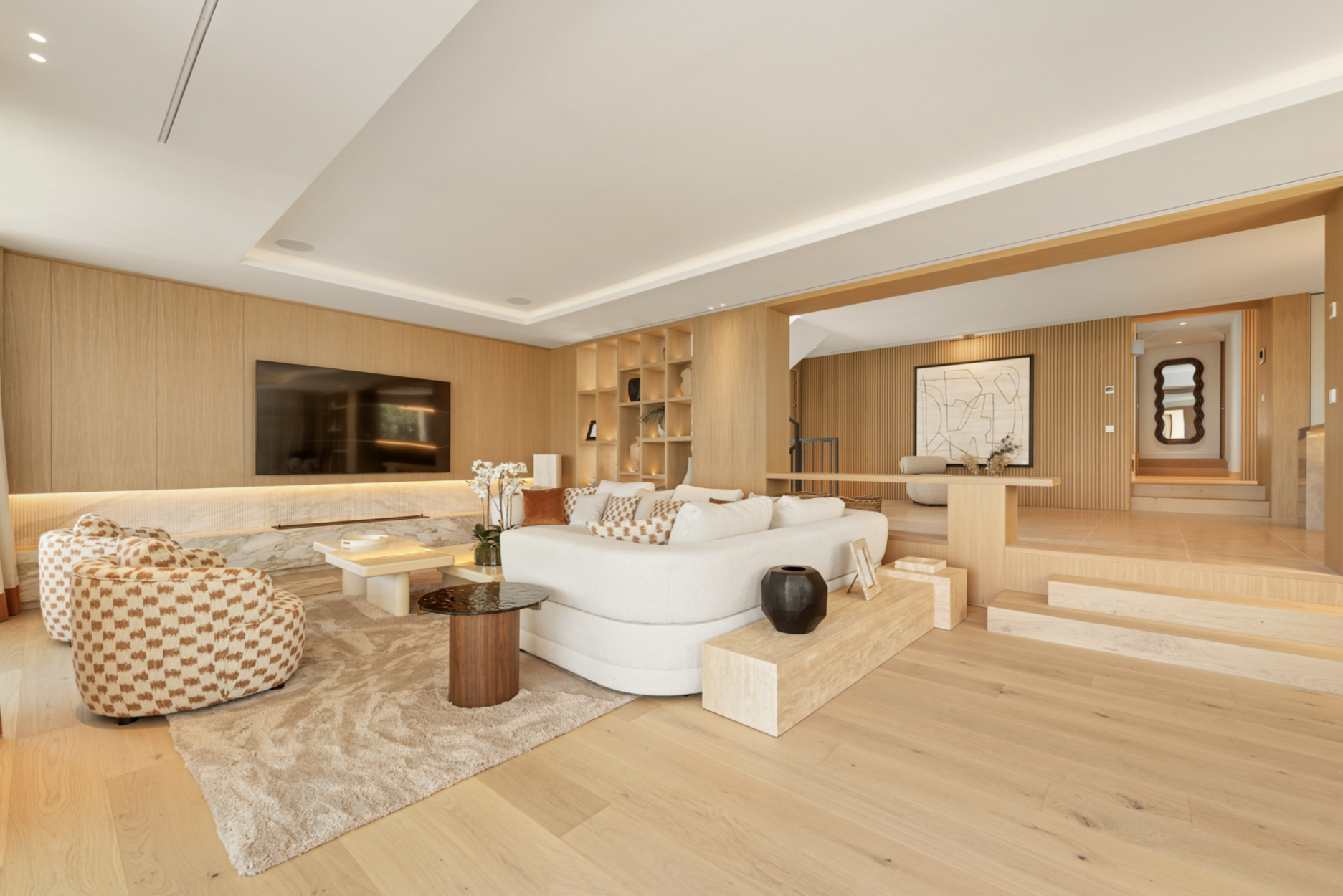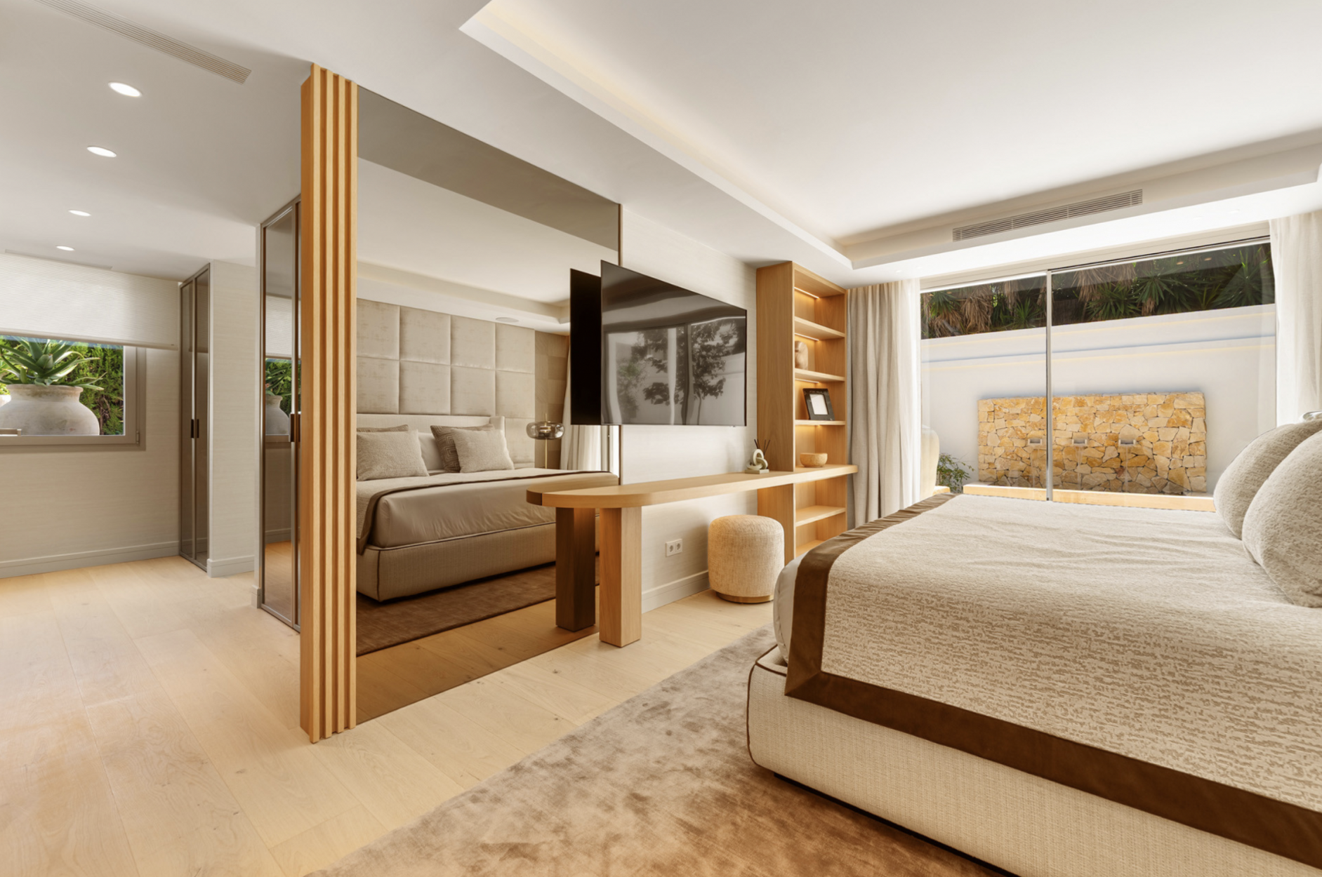 Binnen straalt de woning rust uit dankzij het gebruik van licht hout, natuursteen en op maat gemaakt meubilair. De open indeling verbindt de gourmetkeuken, eetruimte en royale woonkamer, allemaal visueel en functioneel verbonden via grote raampartijen die het interieur overspoelen met natuurlijk licht en zorgen voor een naadloze overgang tussen binnen en buiten. De vijf slaapkamers zijn strategisch geplaatst om zowel privacy als comfort te bieden, met elk detail zorgvuldig uitgewerkt voor een gebalanceerde en uitnodigende leefervaring.