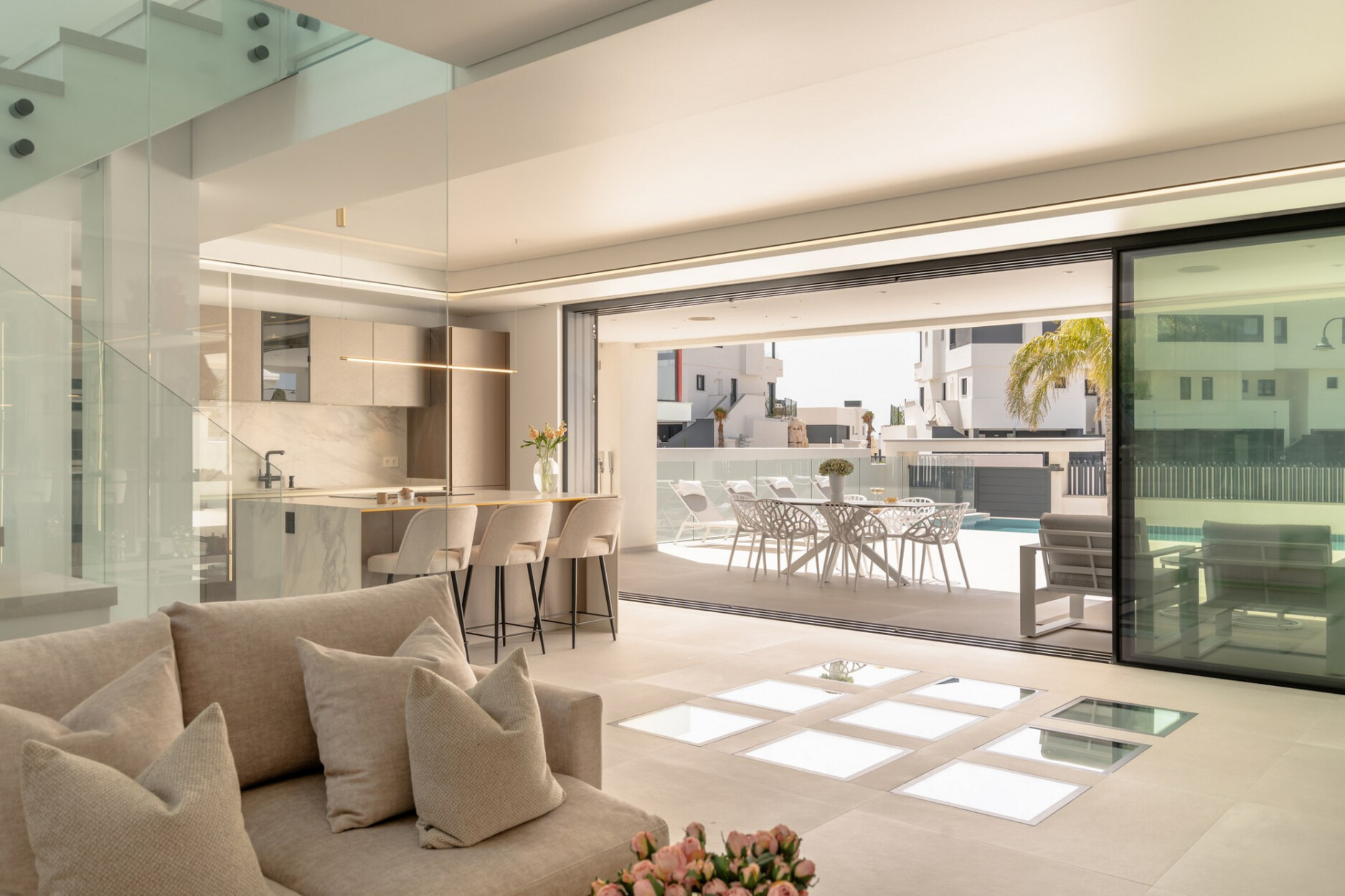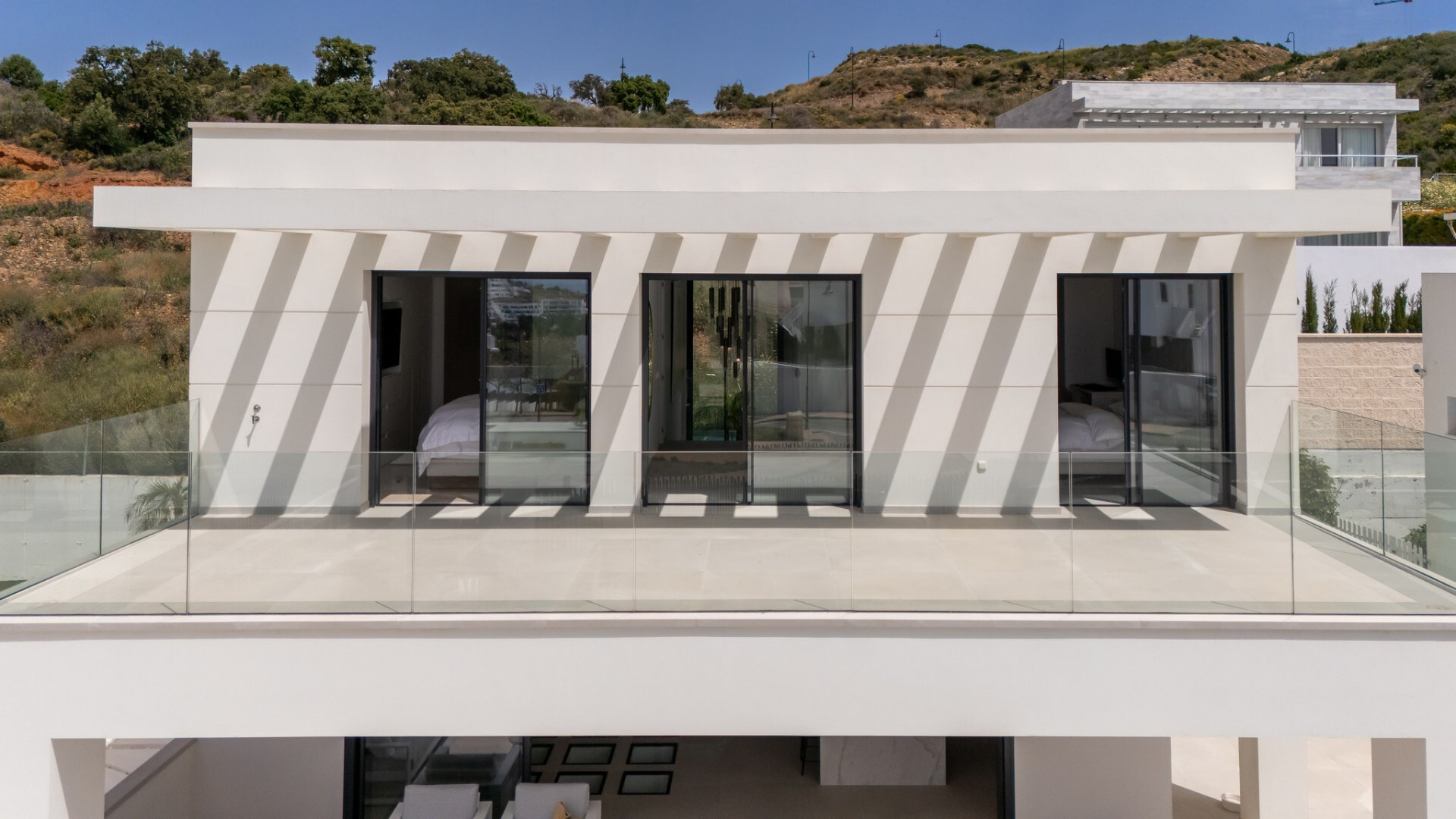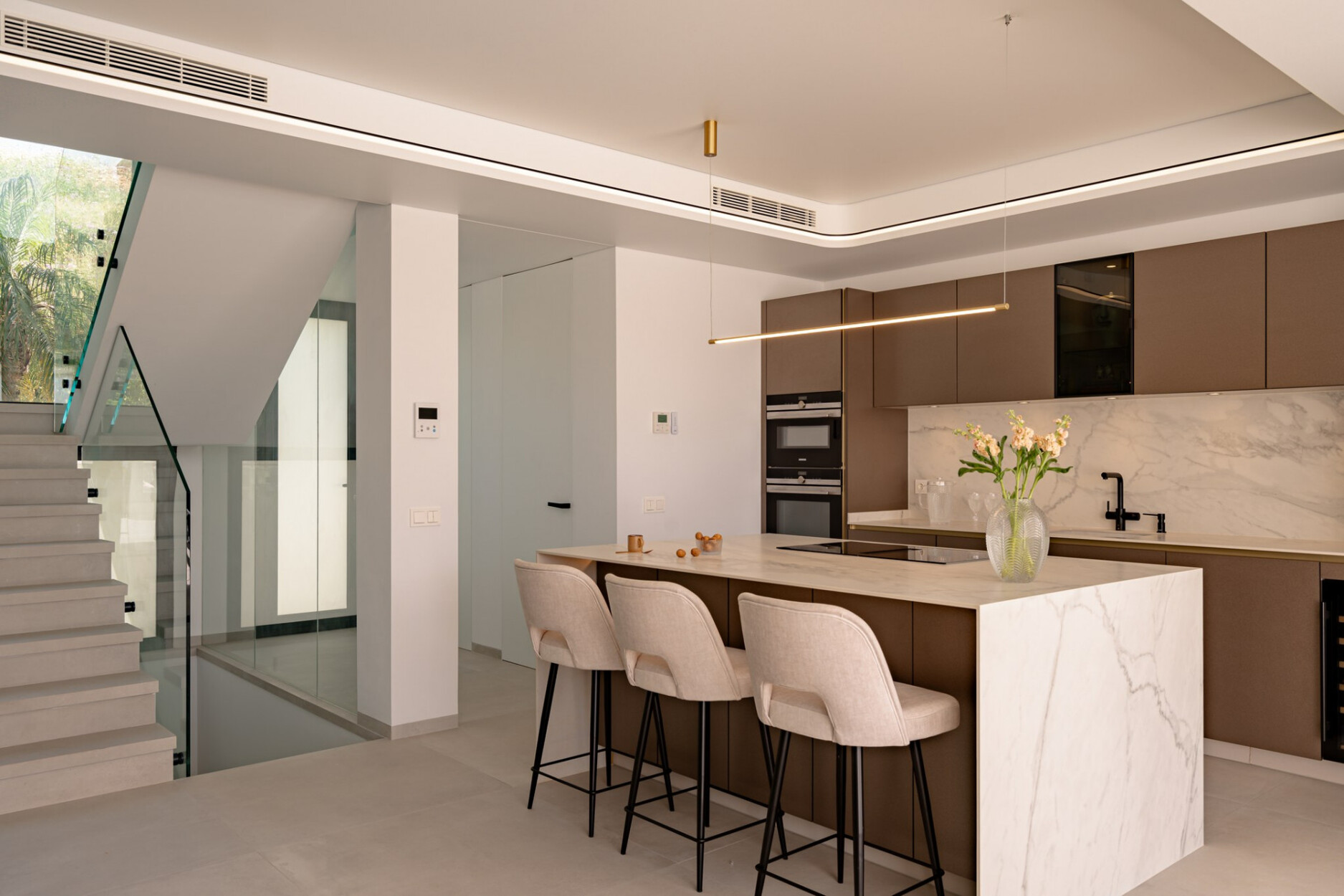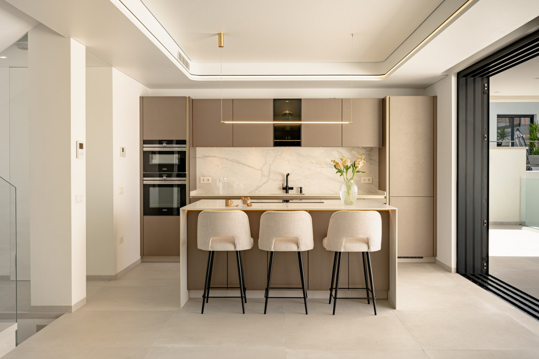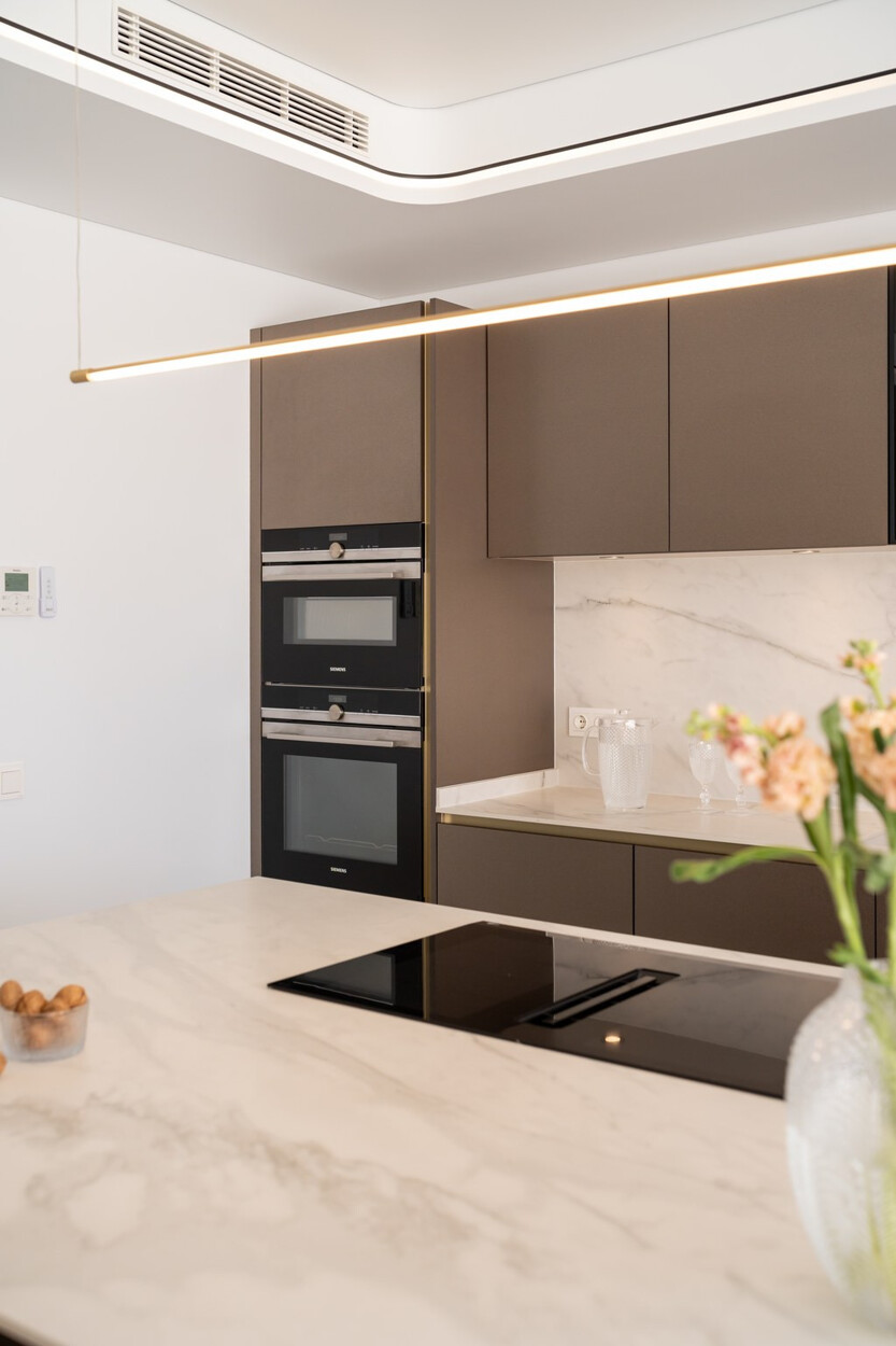 Binnen biedt de villa een ruime open woon- en eetkamer met ramen van vloer tot plafond die het natuurlijke licht binnenlaten en een naadloze verbinding met buiten creëren. De keuken, uitgerust met SIEMENS-apparaten en een praktisch kookeiland, is perfect geschikt voor zowel dagelijks gebruik als voor gasten. De vier lichte en comfortabele slaapkamers omvatten een hoofdsuite met inloopkast, en-suite badkamer en toegang tot een privéterras.