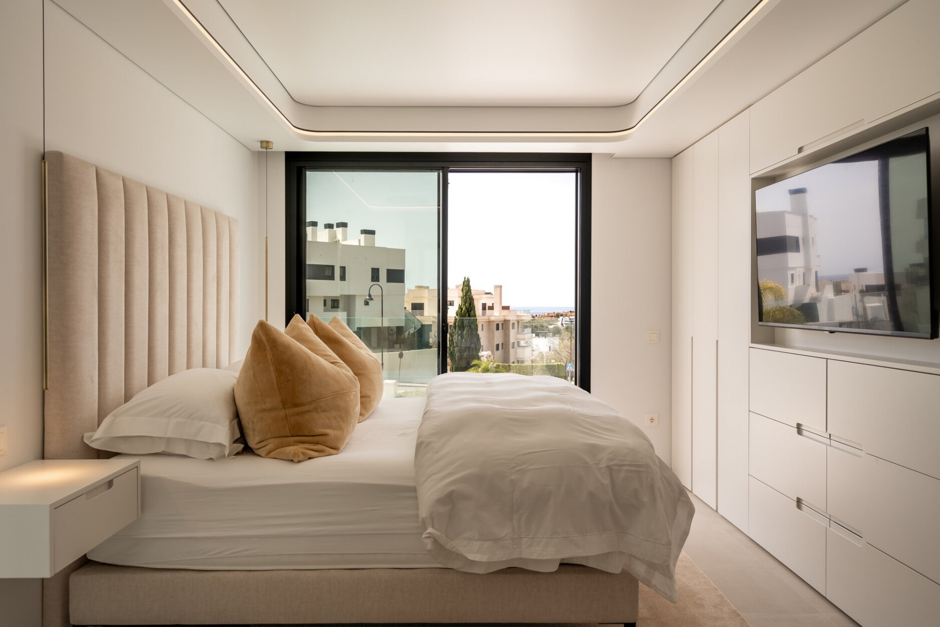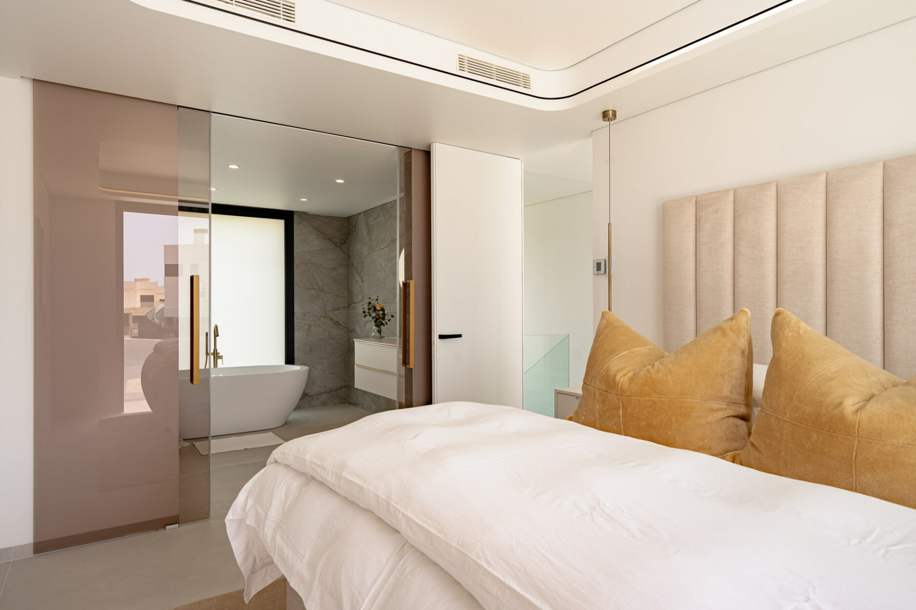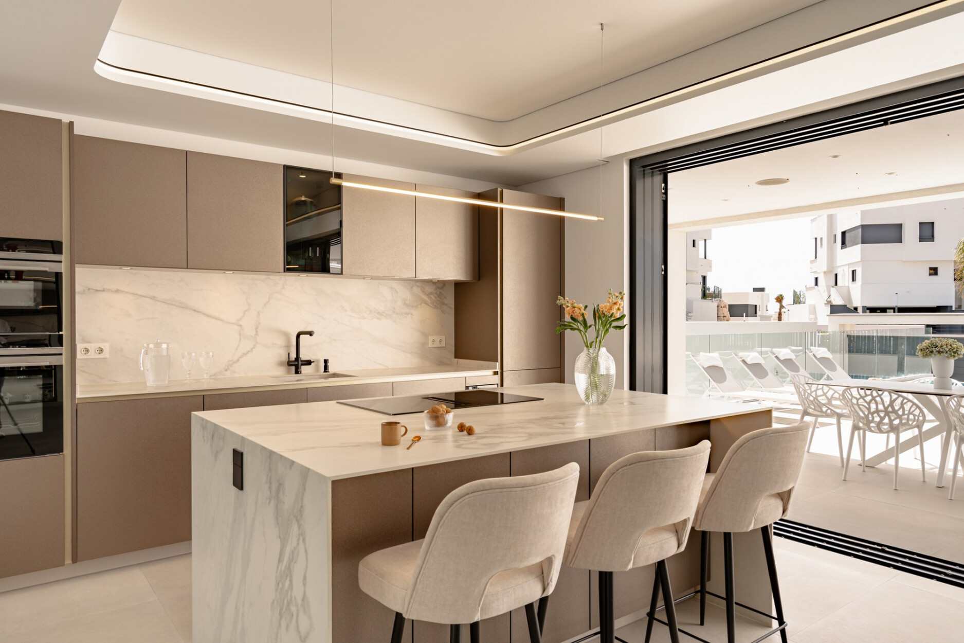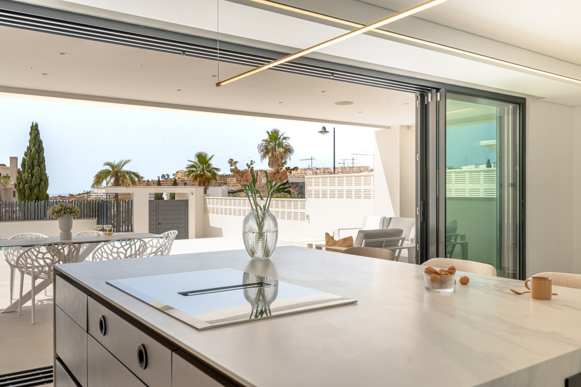 Binnen biedt de villa een ruime open woon- en eetkamer met ramen van vloer tot plafond die het natuurlijke licht binnenlaten en een naadloze verbinding met buiten creëren. De keuken, uitgerust met SIEMENS-apparaten en een praktisch kookeiland, is perfect geschikt voor zowel dagelijks gebruik als voor gasten. De vier lichte en comfortabele slaapkamers omvatten een hoofdsuite met inloopkast, en-suite badkamer en toegang tot een privéterras.