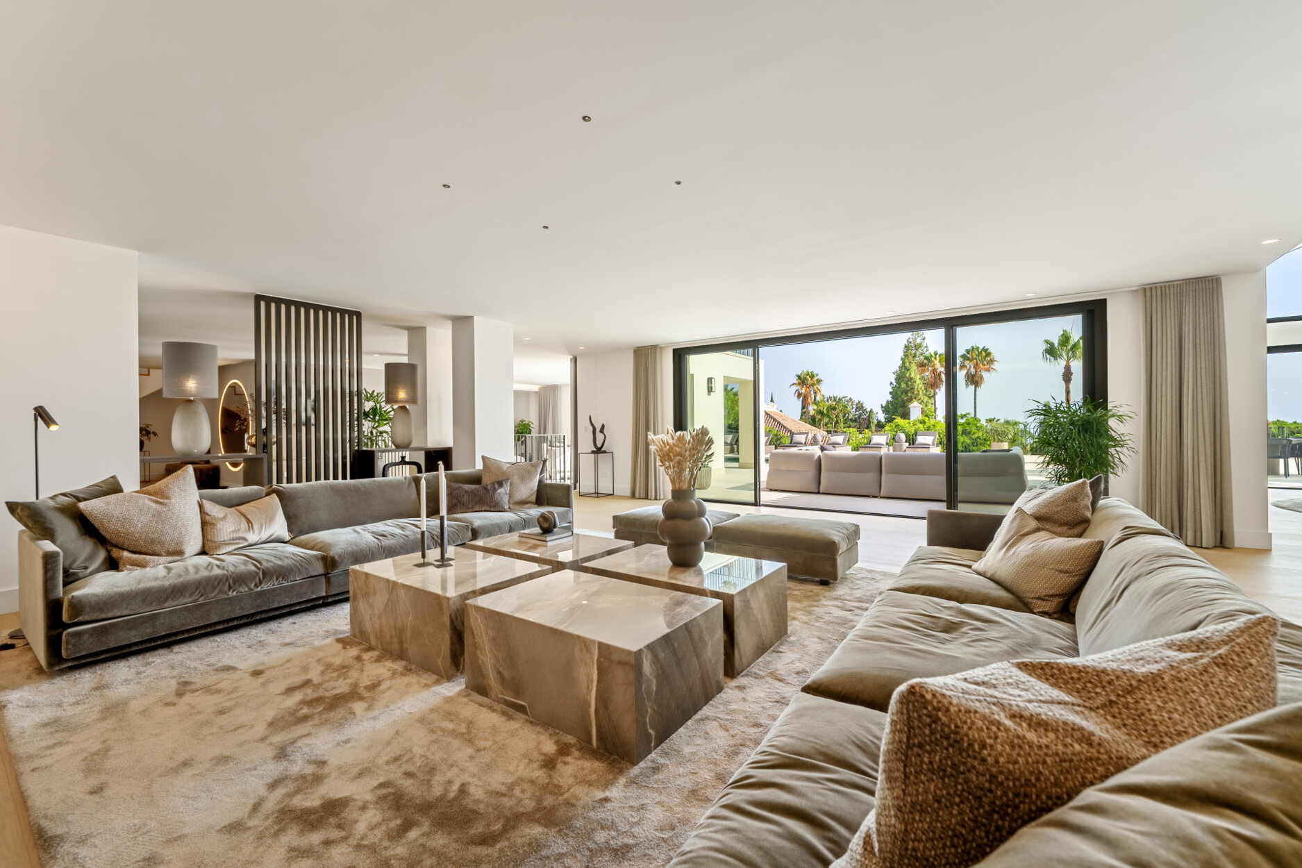 De villa beschikt over lichte, open interieurs die worden versterkt door kamerhoge ramen en gewelfde plafonds, waardoor binnen- en buitenruimtes naadloos in elkaar overlopen. De open woon- en eetkamer vloeit over in een designkeuken met een centraal kookeiland – een stijlvolle, functionele en uitnodigende leefruimte.