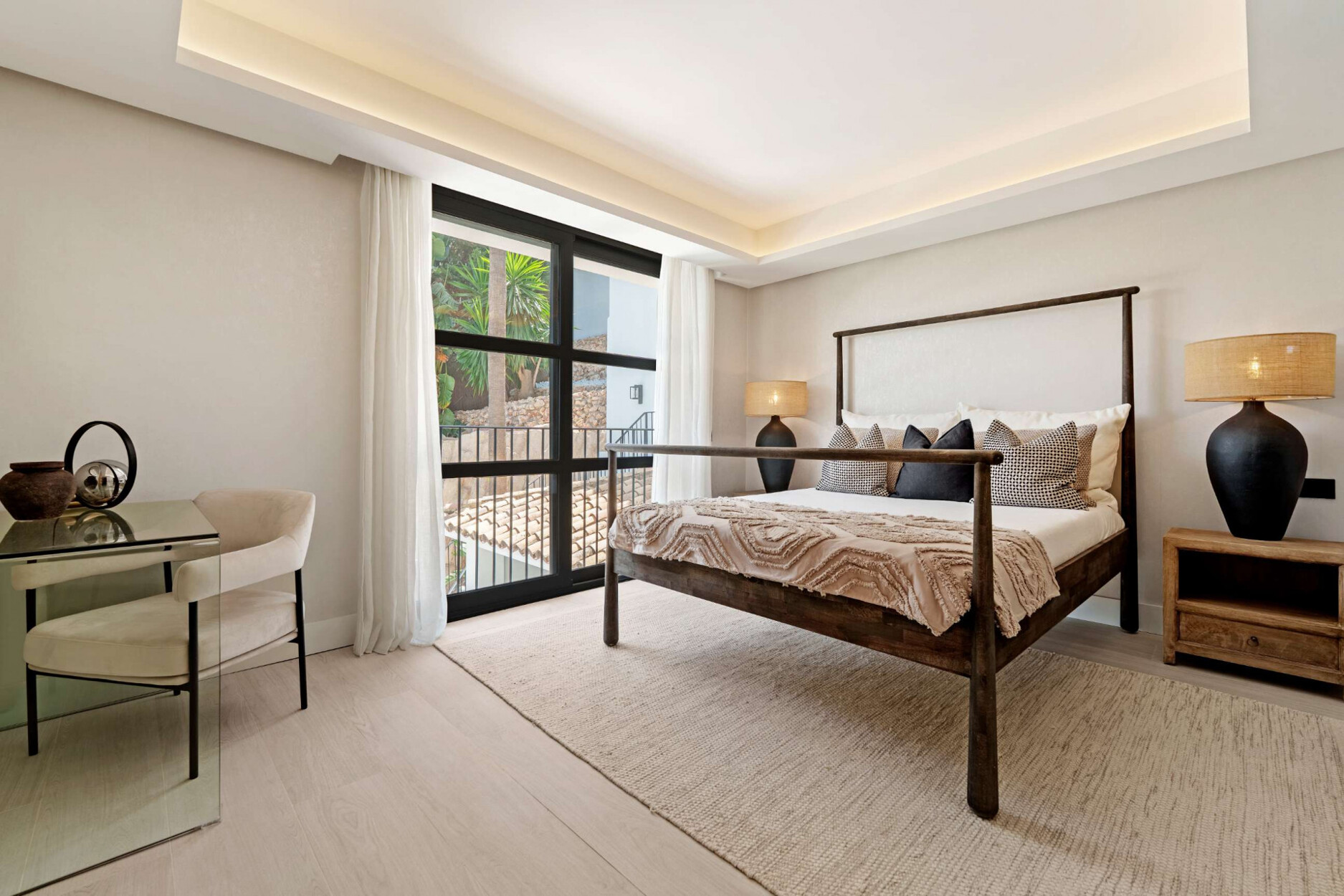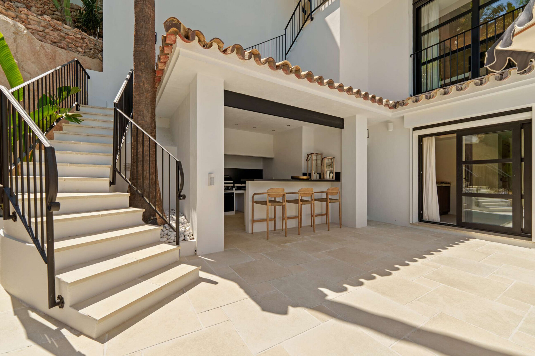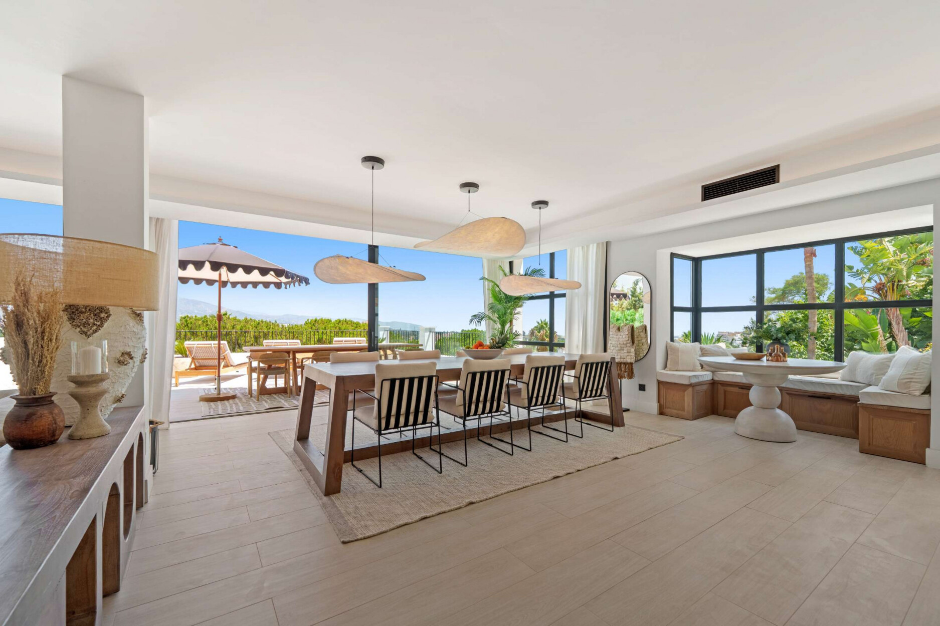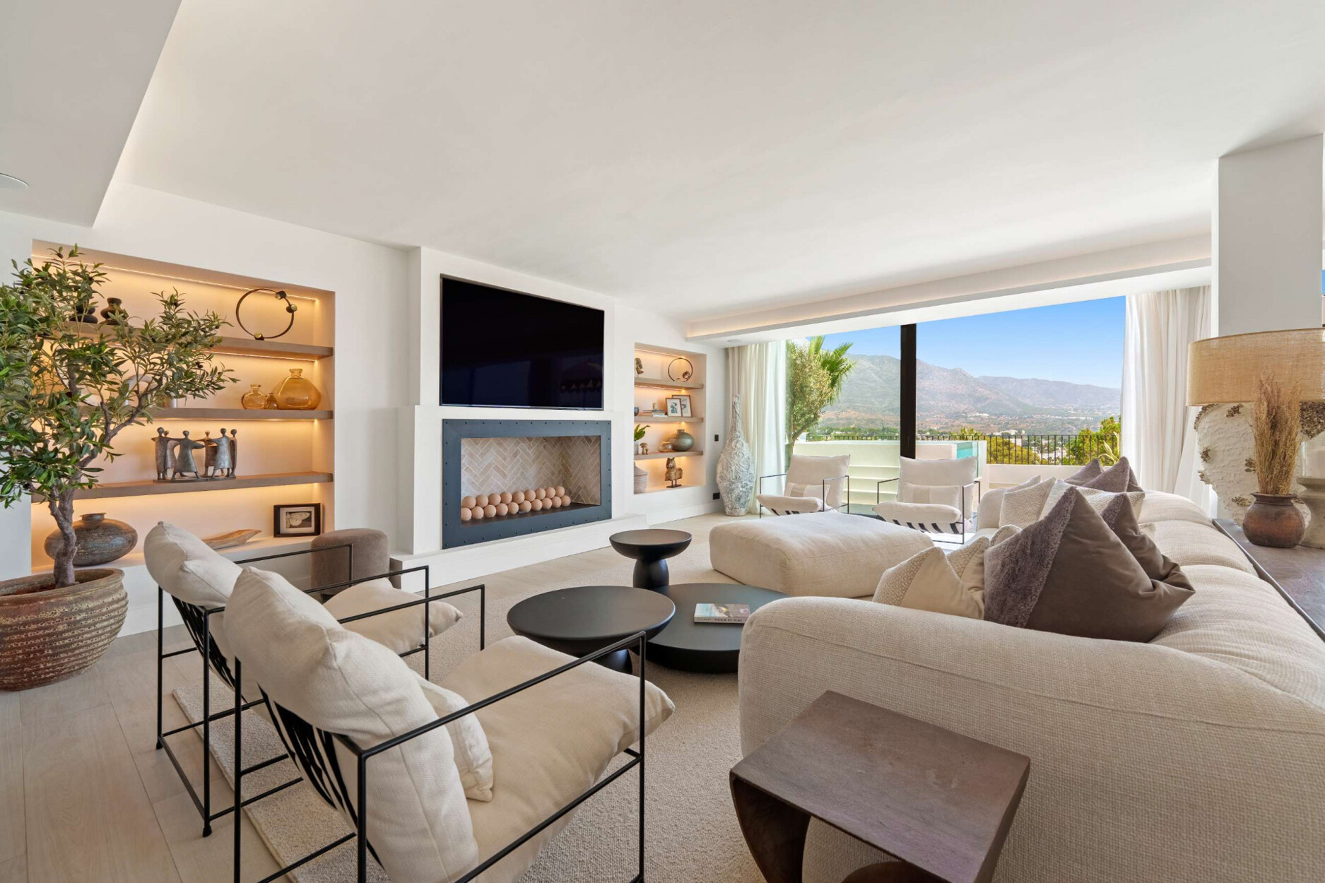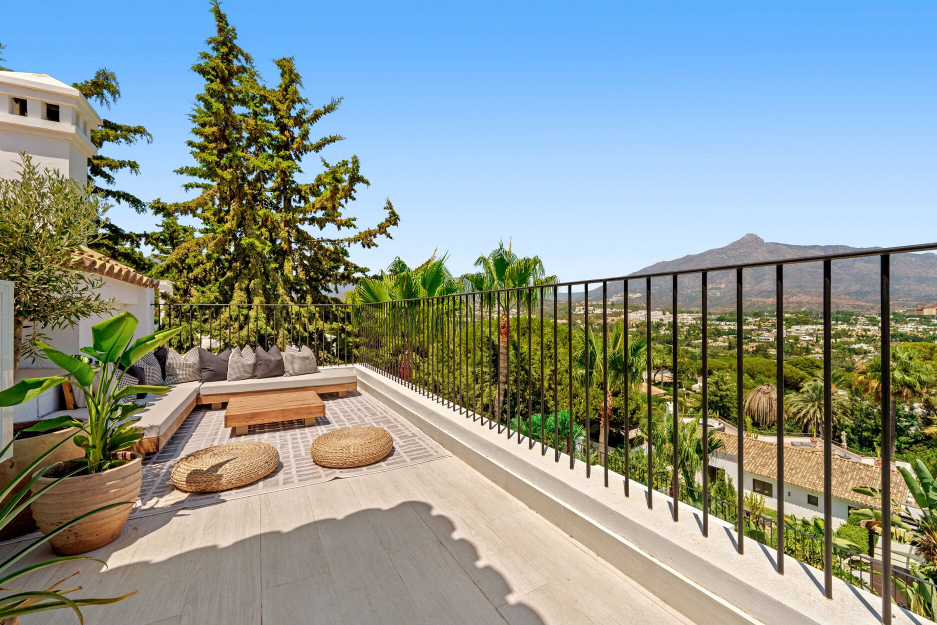 De buitenruimtes van deze villa weerspiegelen de essentie van mediterrane luxe. Omgeven door aangelegde tuinen en ontspanningszones beschikt de woning over een spectaculaire privézwembad, een verzonken lounge met sfeerverlichting en meerdere buitenruimtes om te dineren, te ontspannen of van de zonsondergang te genieten. Elk detail is zorgvuldig ontworpen om een omgeving van welzijn en verfijning te creëren, waar natuur en architectuur in perfecte harmonie samensmelten.