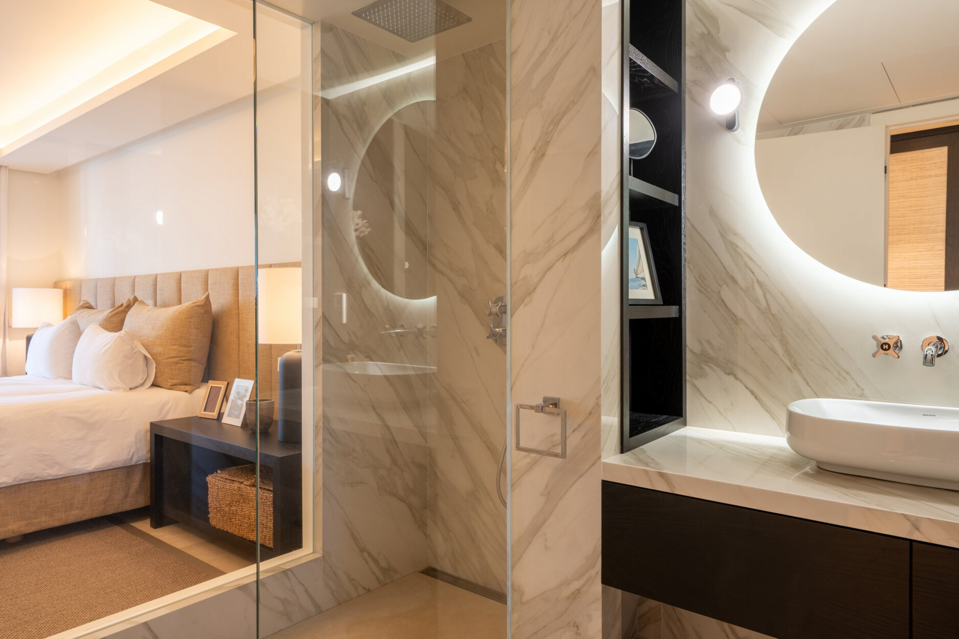 Ontworpen met comfort en stijl in het achterhoofd, de interieurs showcase een elegante open-plan lay-out die naadloos verbindt de woon-, eet- en keukenruimten. Grote glazen deuren overspoelen de ruimte met natuurlijk licht en openen op het terras, waardoor de woonkamer buiten wordt uitgebreid. De master suite beschikt over een luxe en-suite badkamer en directe toegang tot de tuin, terwijl de twee extra slaapkamers ook stijlvolle en-suite badkamers bevatten. Neutrale tinten, natuurlijke texturen en op maat gemaakte afwerkingen creëren een rustige, uitnodigende sfeer ideaal voor het moderne mediterrane leven.