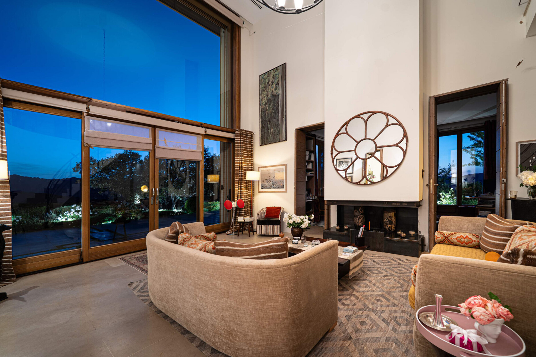 De ruime terrassen breiden de ervaring naar buiten uit, waar een grote pergola met metalen pilaren een spel van licht en schaduw creëert, ideaal voor bijeenkomsten, dineren in de open lucht en onvergetelijke zonsondergangen. Een keramisch fresco met de windstreken leidt bezoekers naar de meest indrukwekkende uitzichten op het natuurpark, terwijl een betegelde binnenplaats met een waterval leidt naar het zwembad in zwembaanstijl, dat tussen de lucht en de bergen lijkt te zweven. Bovenaan de tuin herbergt een Mongoolse yurt een kunstbibliotheek en een intieme leesruimte.