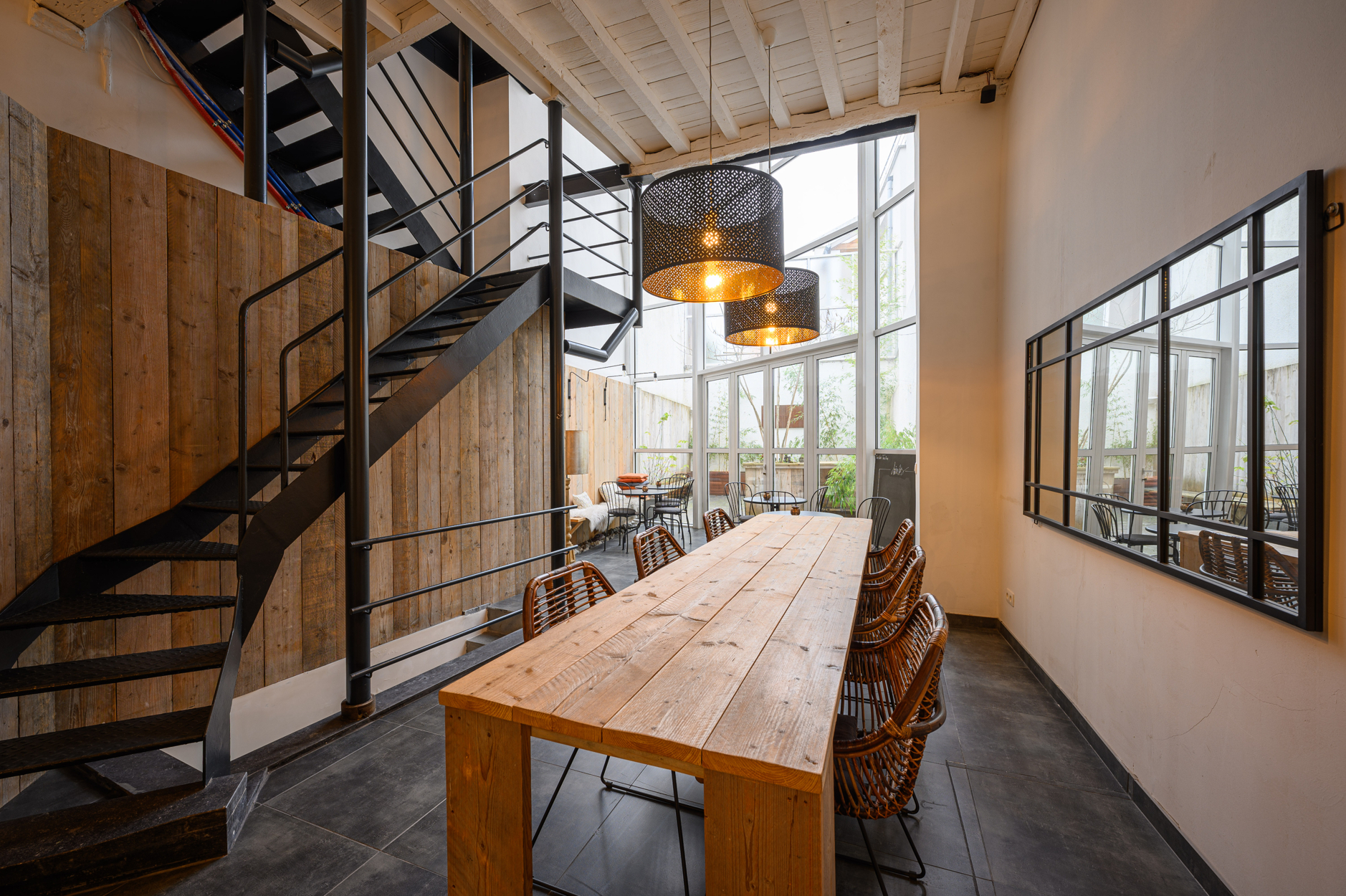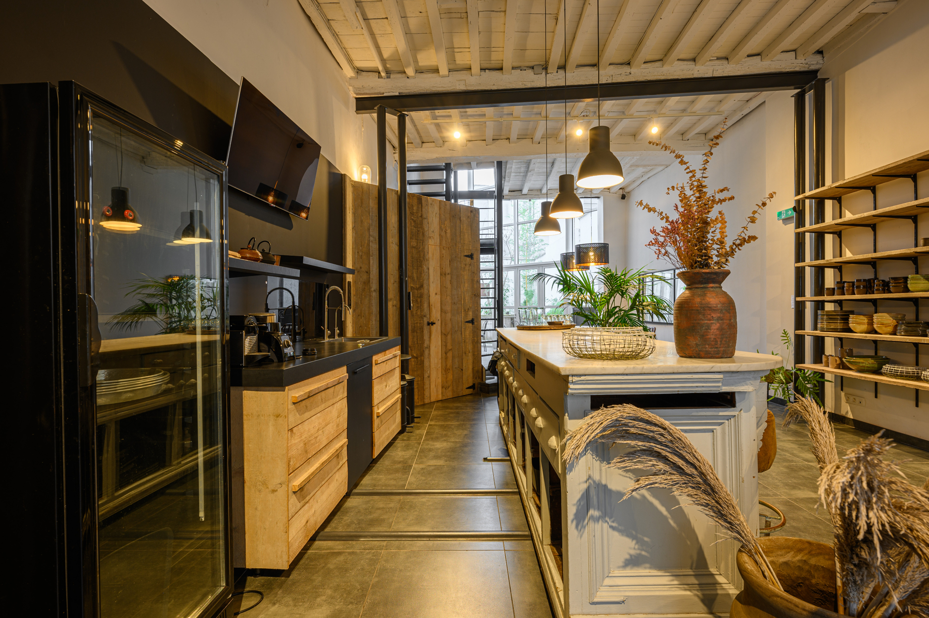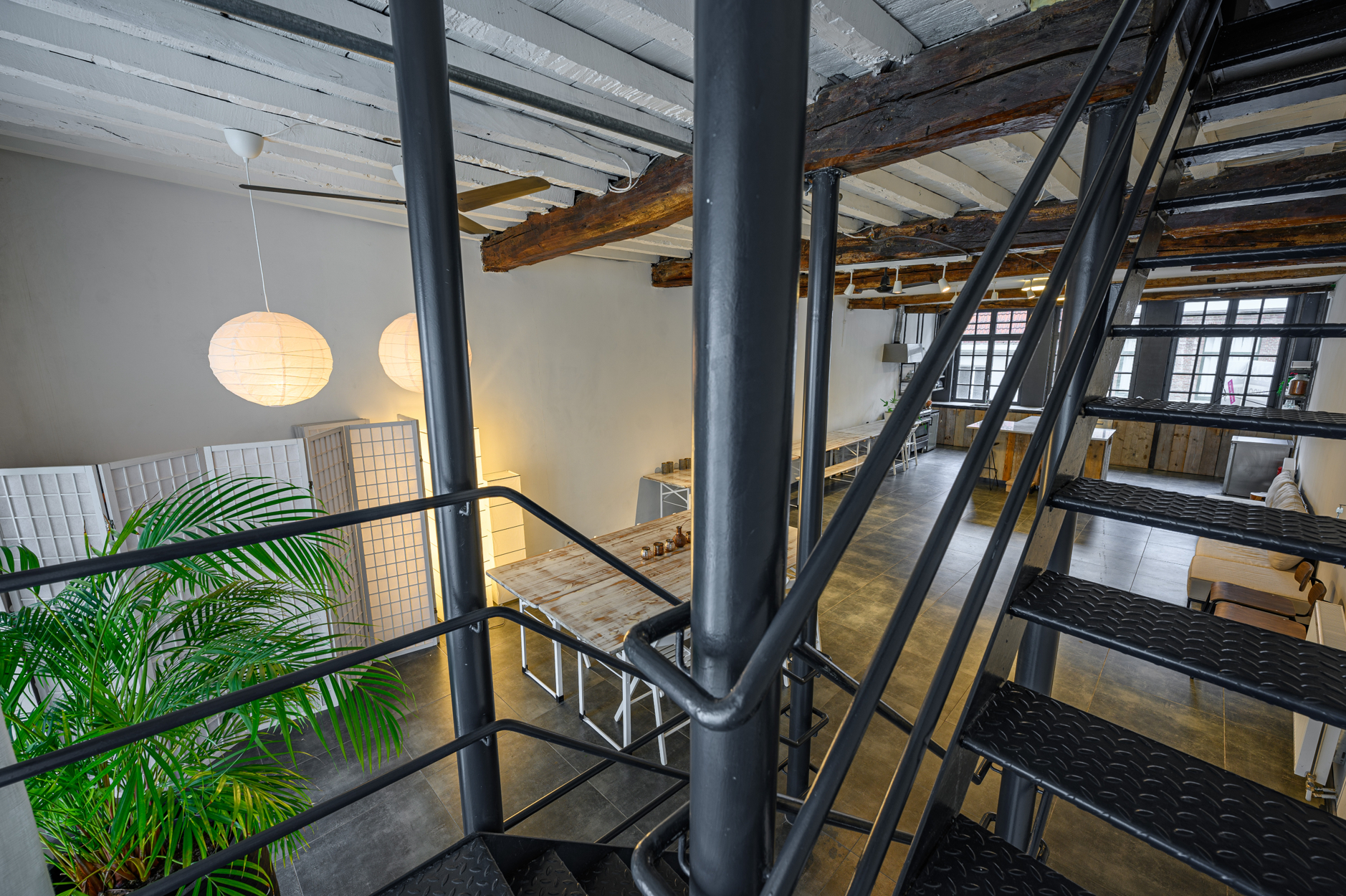 Verdieping: grote open ruimte met keukengedeelte aan de voorzijde van het pand, mezanine met zicht op de benedenverdieping en de tuin.