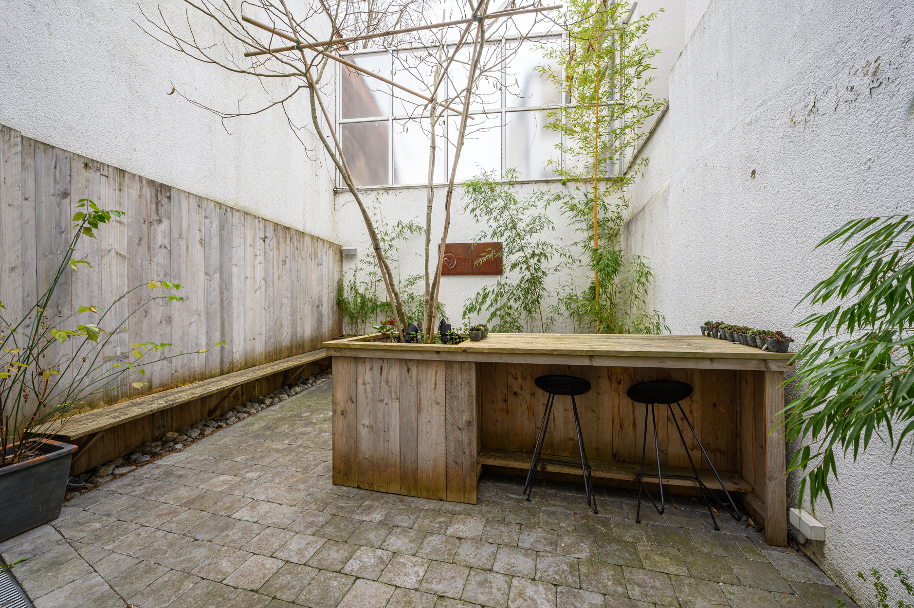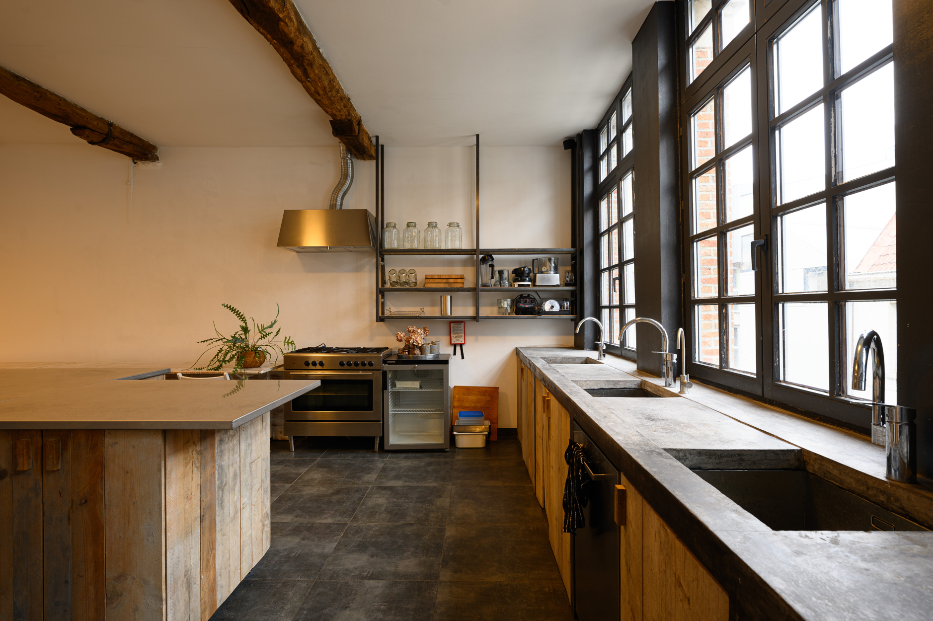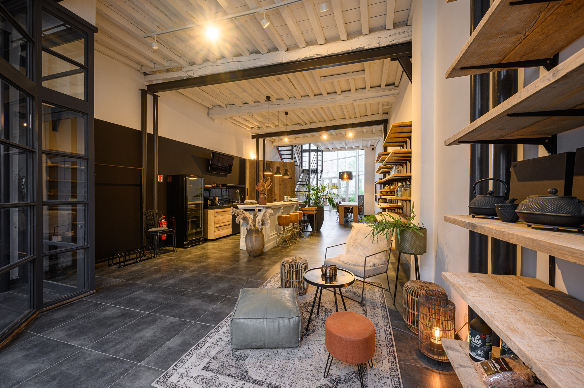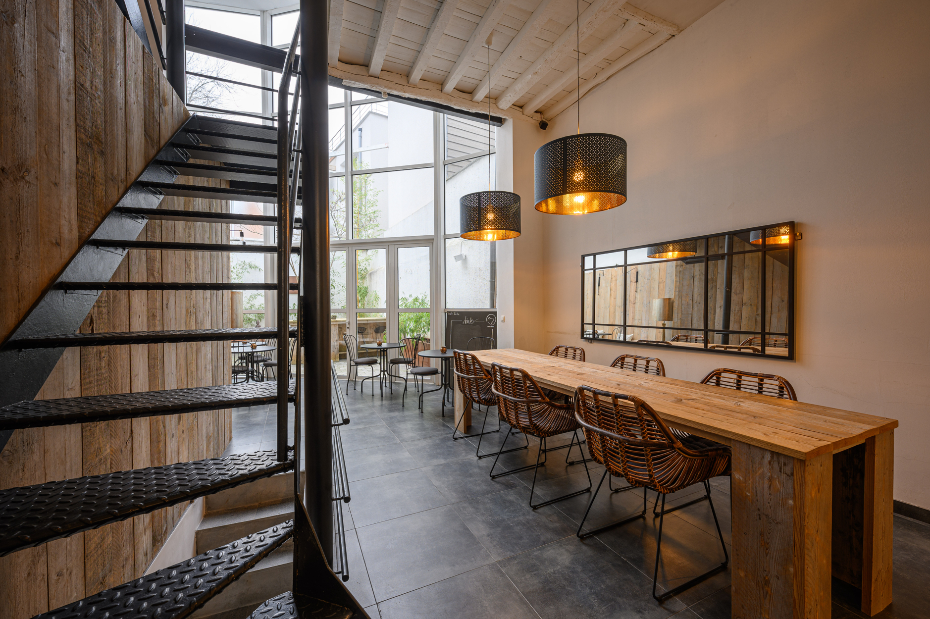 Verdieping: grote open ruimte met keukengedeelte aan de voorzijde van het pand, mezanine met zicht op de benedenverdieping en de tuin.