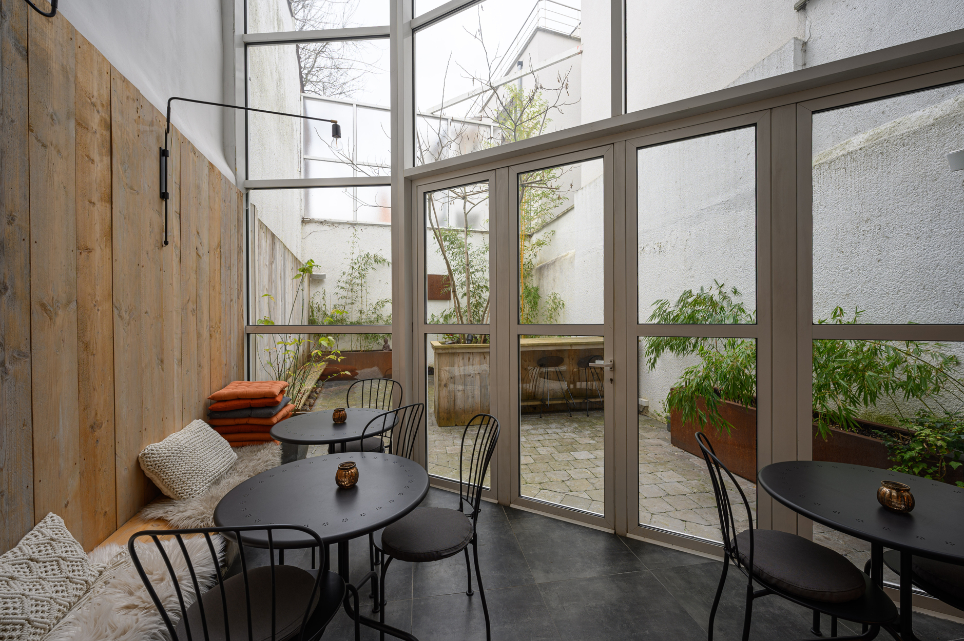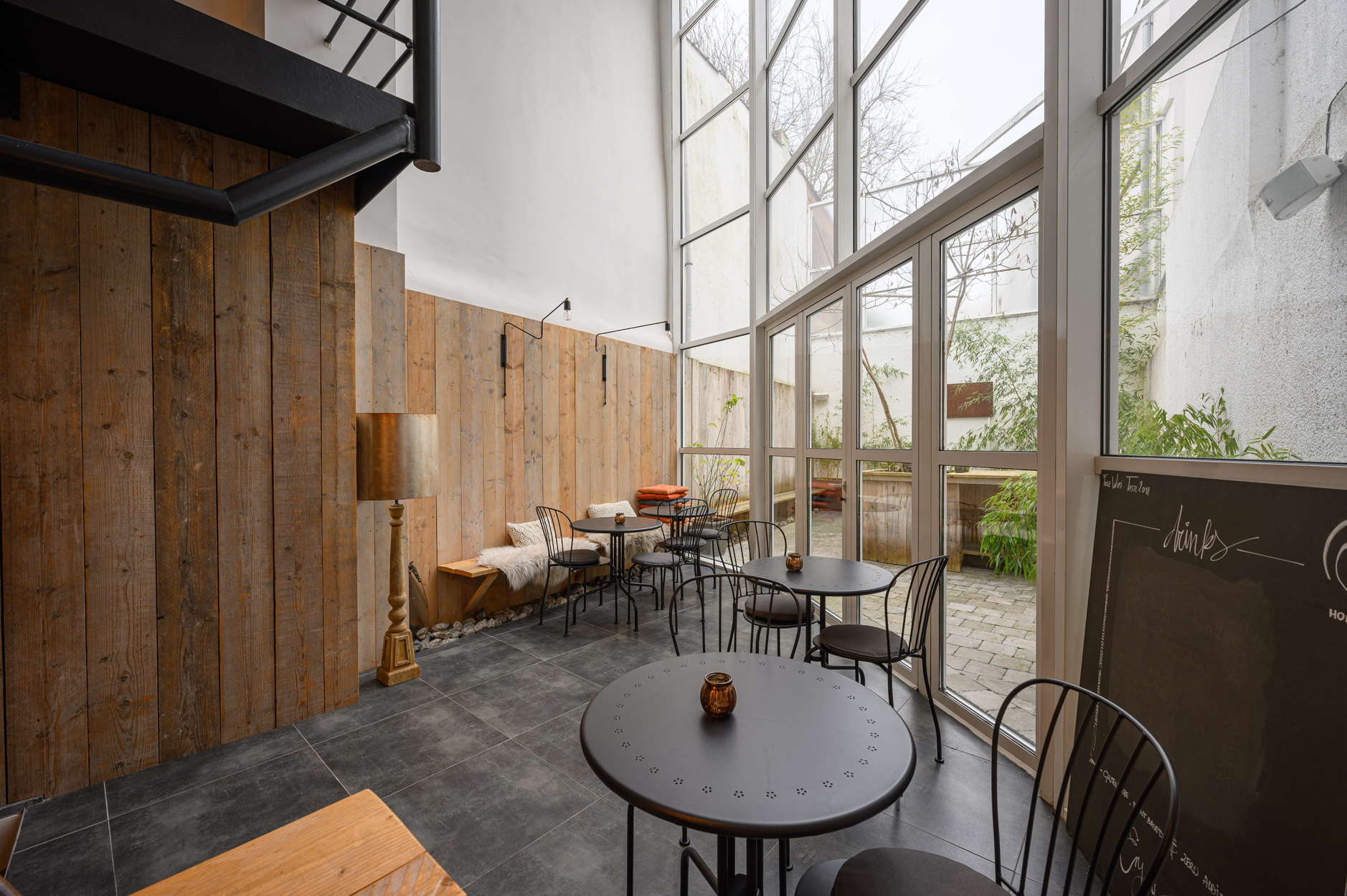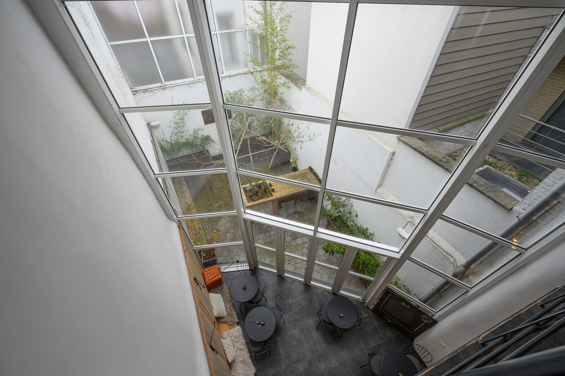 Gelijkvloers: inkom met hellend vlak voor rolstoelgebruikers. Grote open ruimte met metalen open trap, zithoek, buitenterras.