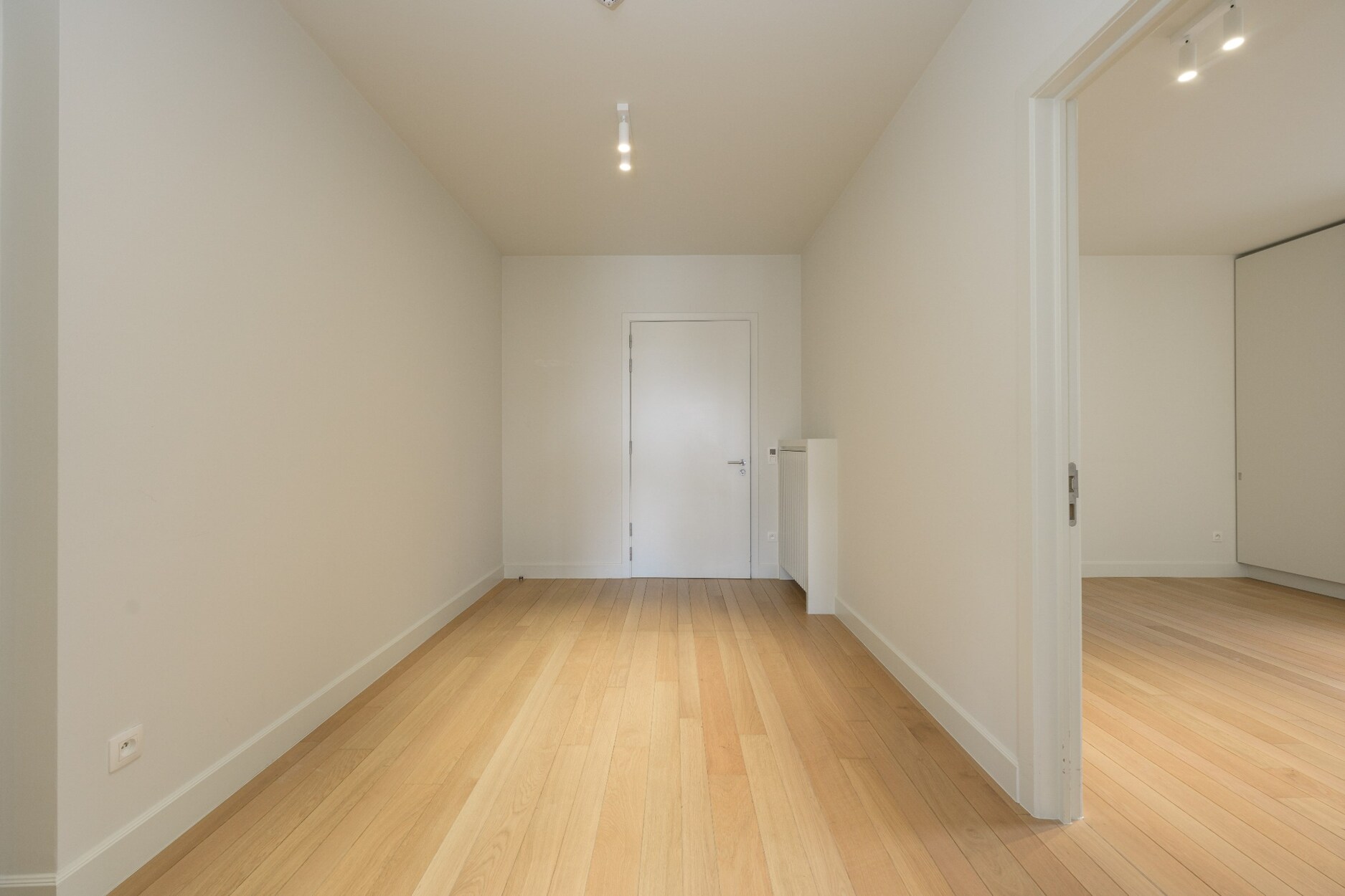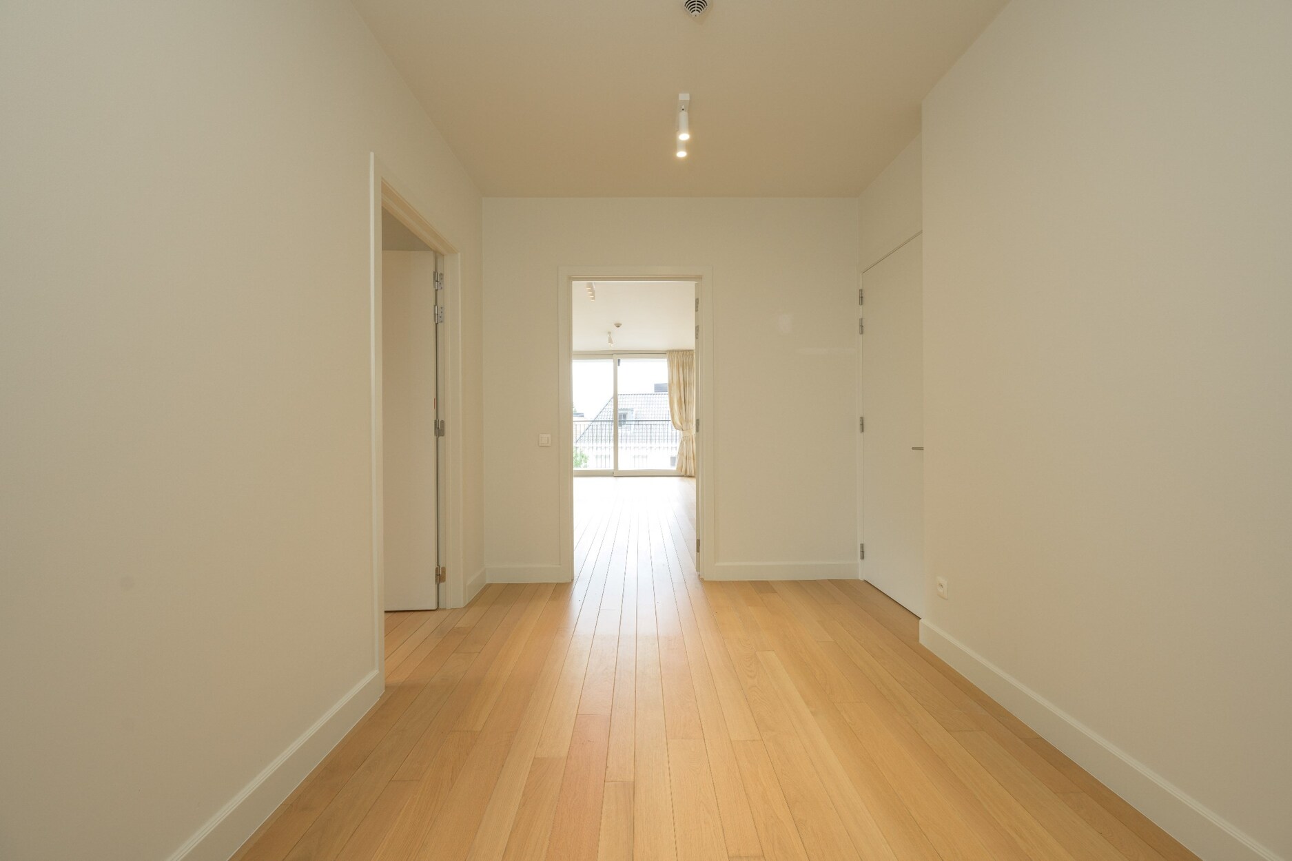 We betreden dit appartement via een inkomhal op parket en een toilet voor de gasten.