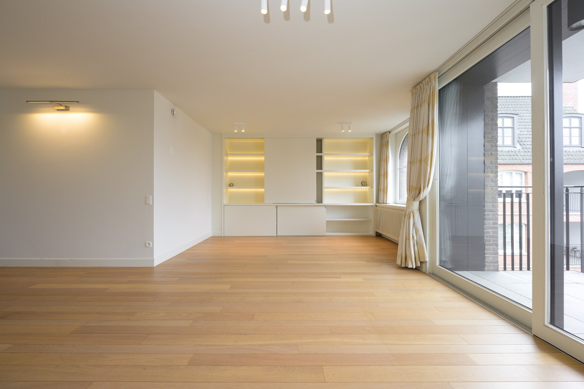 Dit appartement beschikt over een ruime woonkamer op parket, afgewerkt met de nodige ingemaakte kasten. Het terras is bereikbaar vanuit de woonkamer en biedt zicht op het binnenplein van dit project. Aansluitend treffen we de halfopen keuken aan waar het mogelijk is een eettafel te plaatsen met zicht op het plein. Deze keuken is voorzien van de nodige toestellen van Miele. De praktische berging/wasplaats ligt achter deze keuken.