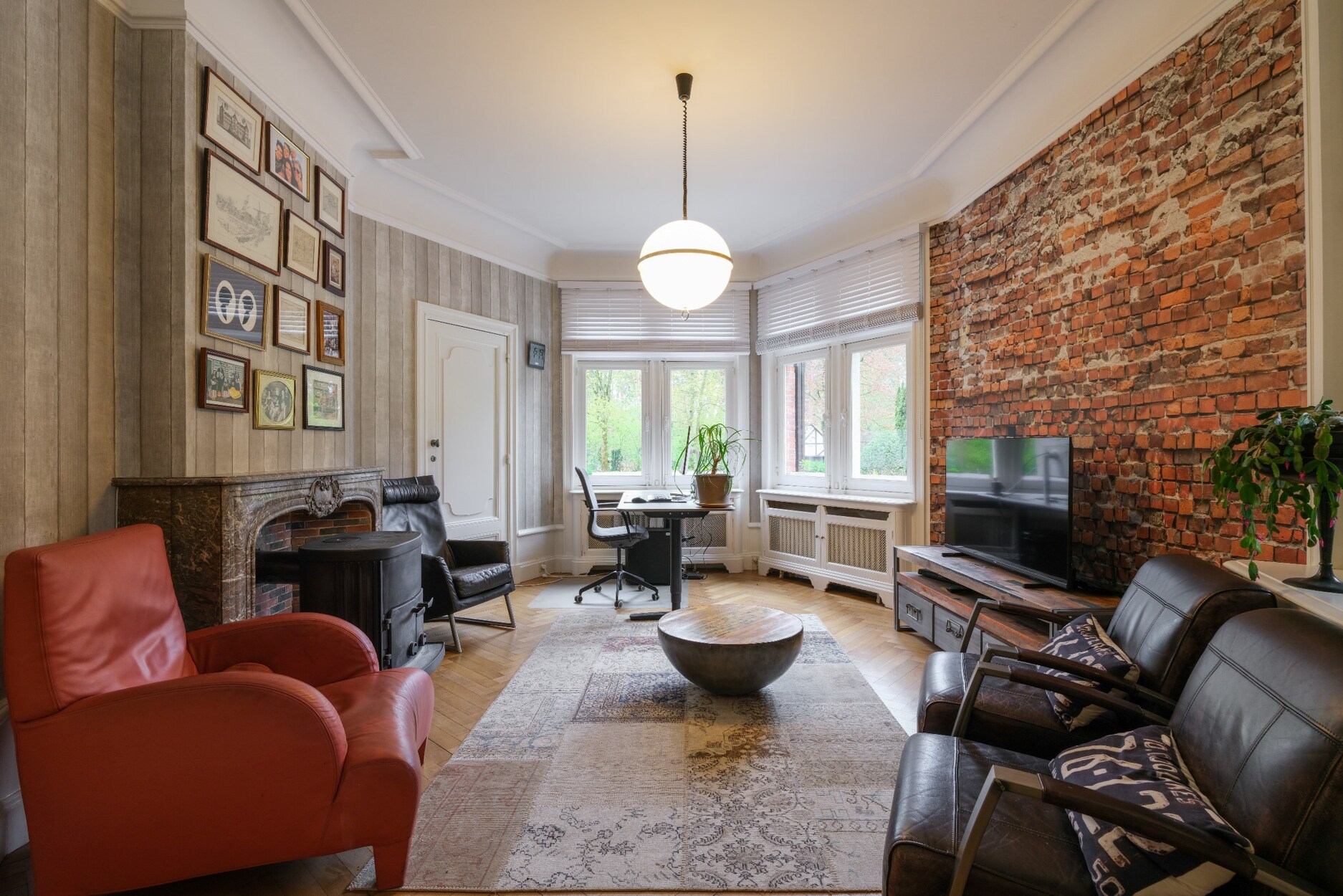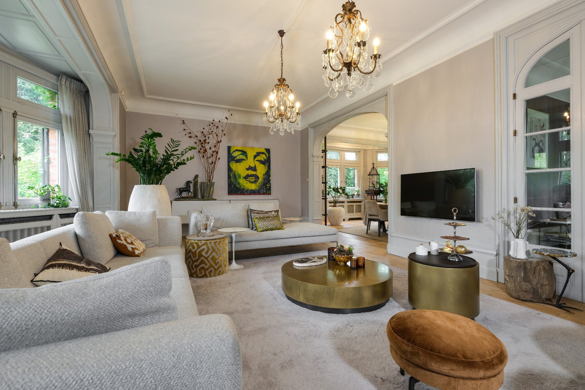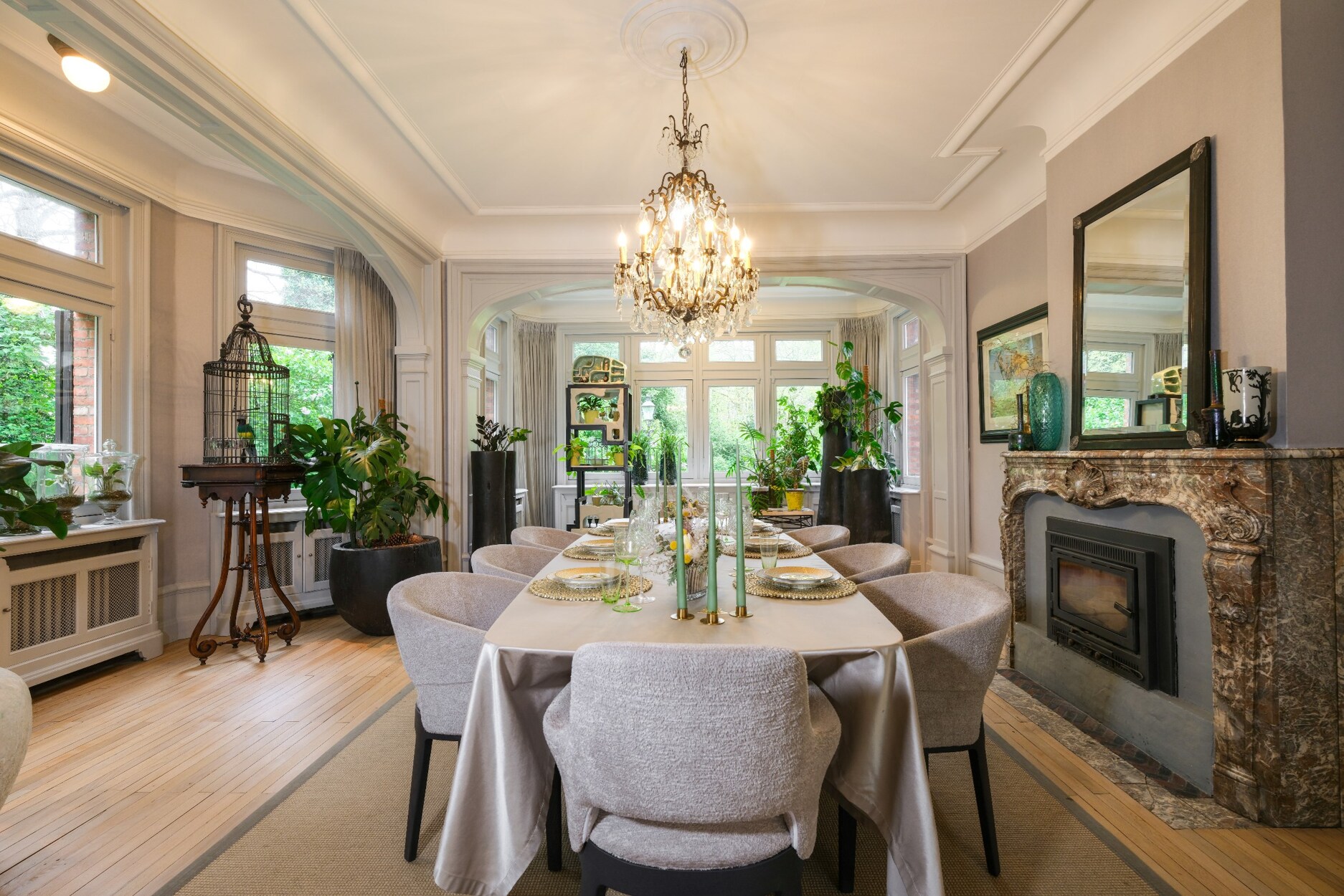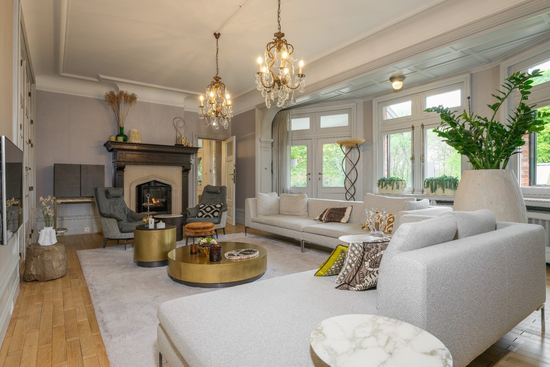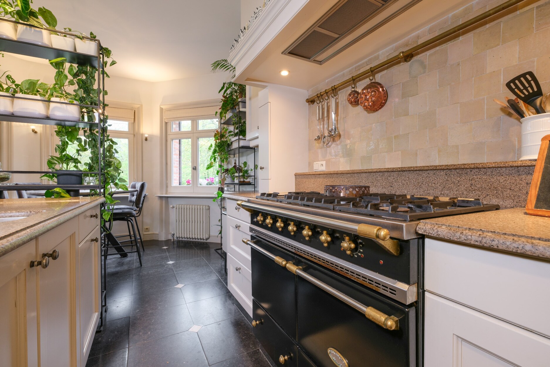 De hoofdingang, toegankelijk via een bordes aan de voorzijde, leidt naar een royale hal met een majestueuze trap naar de eerste verdieping. Een portaal biedt toegang tot een gastentoilet en een lift. De ruime living, met een hoog plafond en veel natuurlijk licht, beschikt over een sierlijke schouw met gaskachel. De aangrenzende eetkamer staat in verbinding met de luxe leefkeuken, die is uitgerust met hoogwaardige apparatuur(Miele vaatwasser, Lacanche dubbele oven met geïntegreerde 5-pits gaskookplaat, Miele koelkast, Imperial stoomoven, Miele diepvriezer en Siemens microgolfoven). De veranda/ buitenterras is toegankelijk vanuit de eetkamer die in verbinding staat met de keuken.