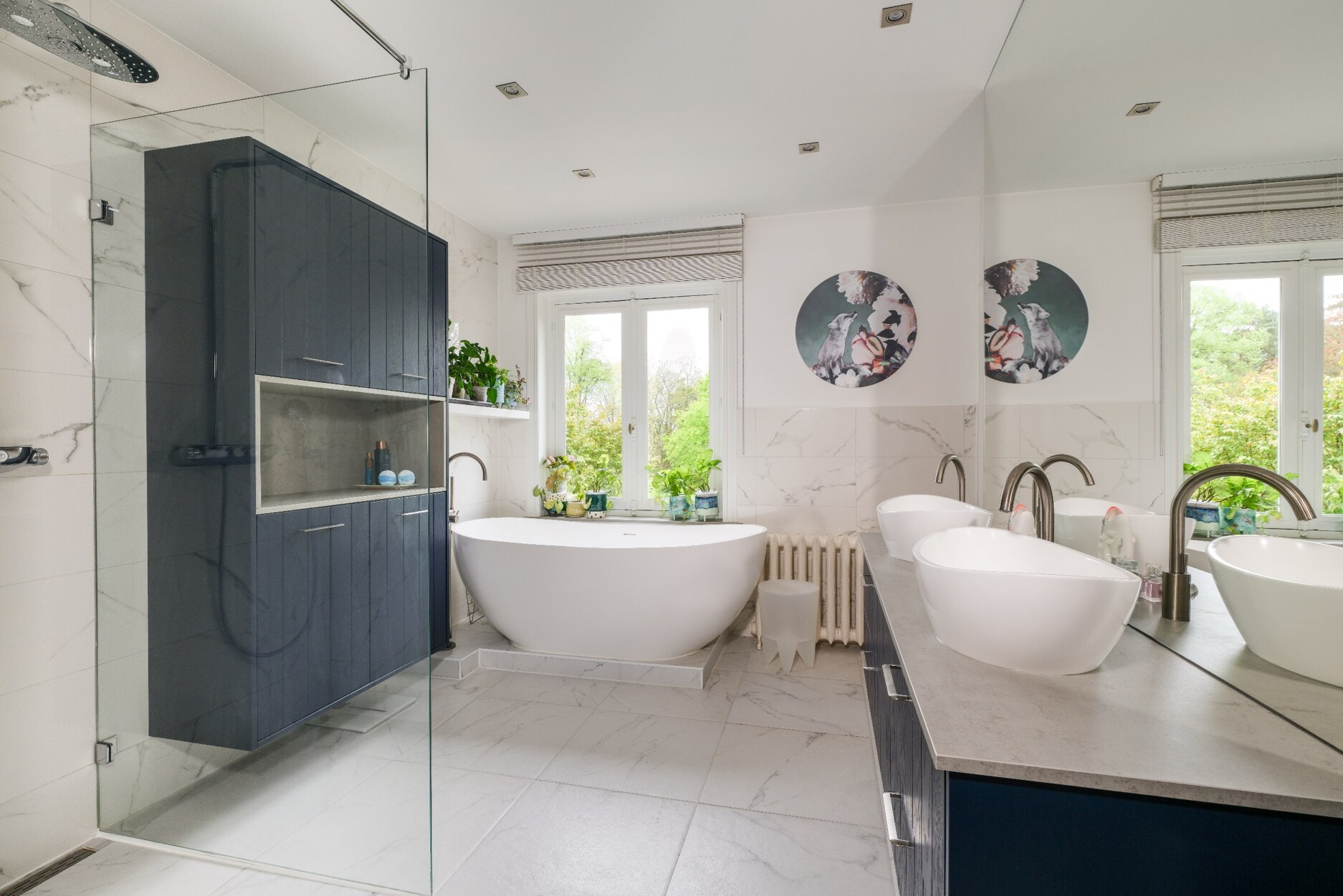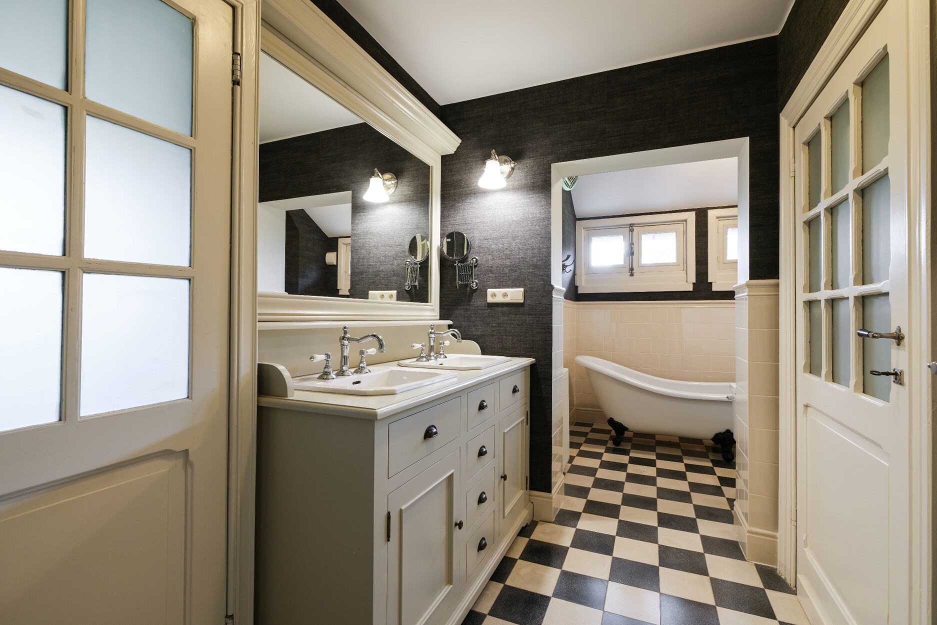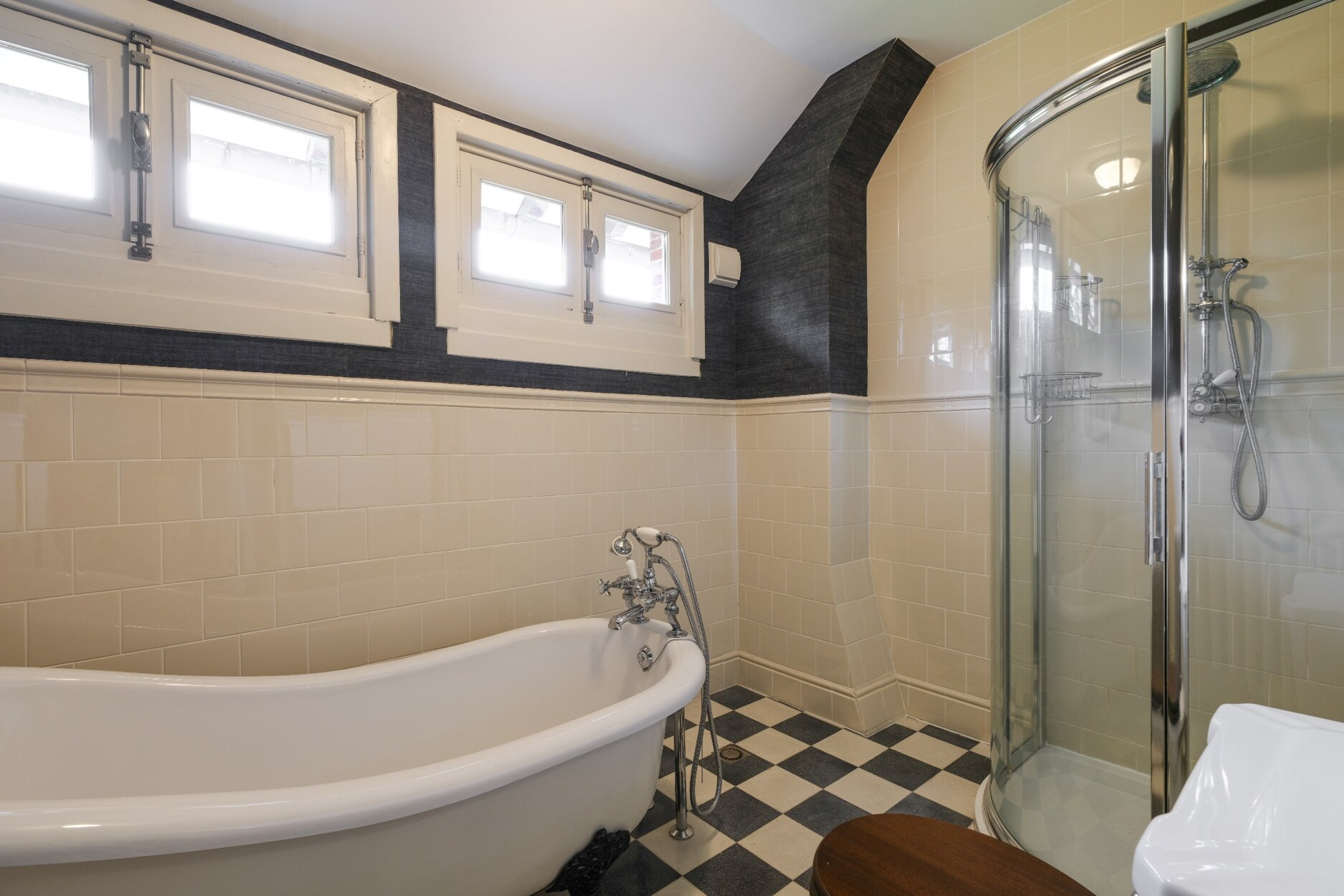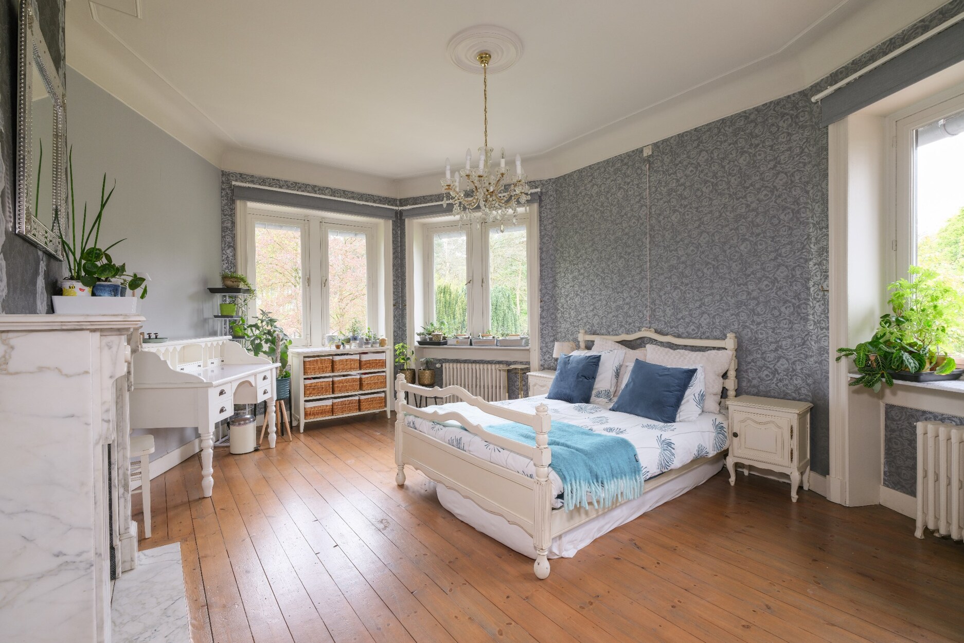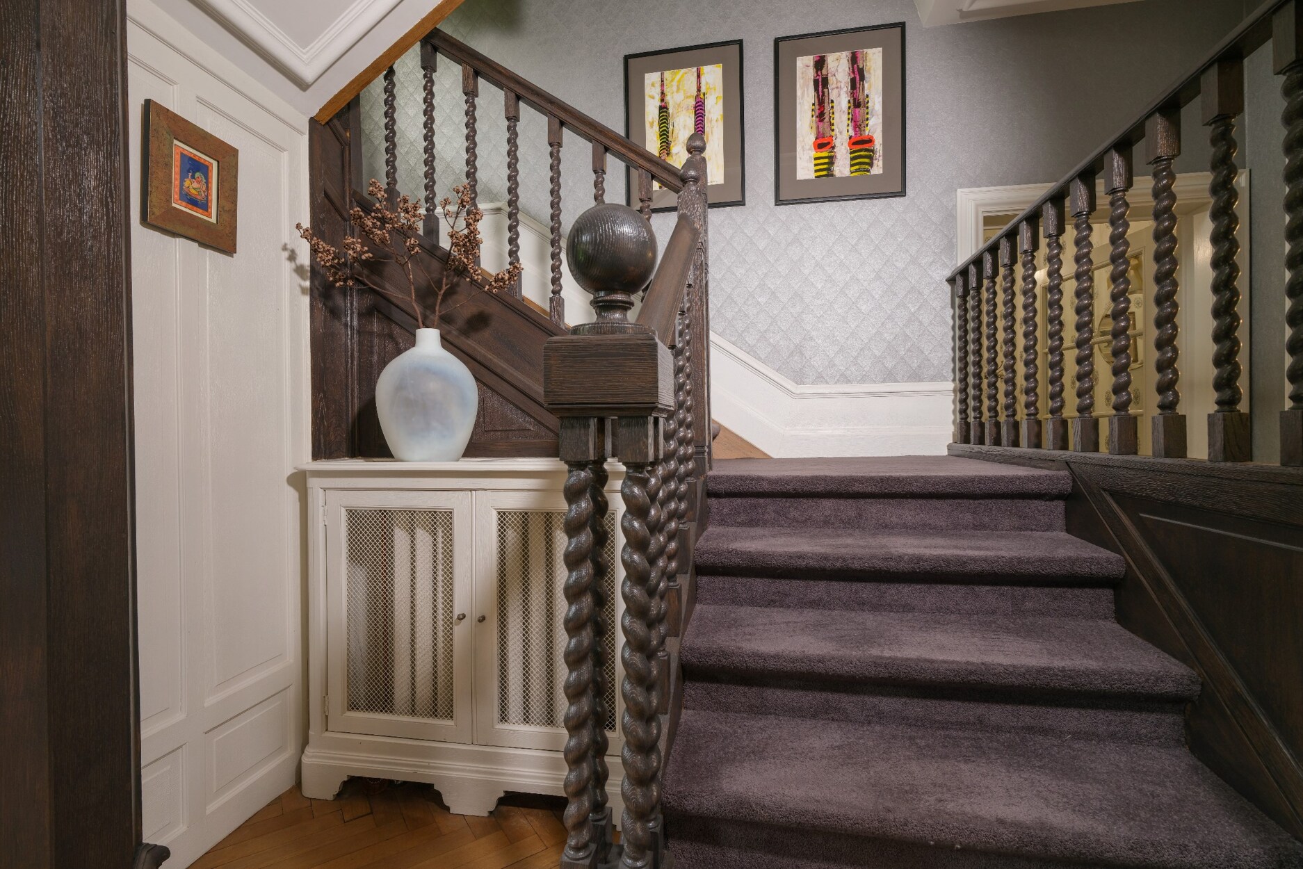 De authentieke houten trap leidt naar de overloop met toegang tot alle slaapkamers en badkamers op deze verdieping. De masterbedroom, met een marmeren schouw met gashaard, heeft een eigen luxe badkamer voorzien van ligbad, inloopdouche en badmeubel met dubbele wastafel. Een aparte was/bergkamer, 4 extra slaapkamers en 2 extra badkamers completeren deze verdieping.