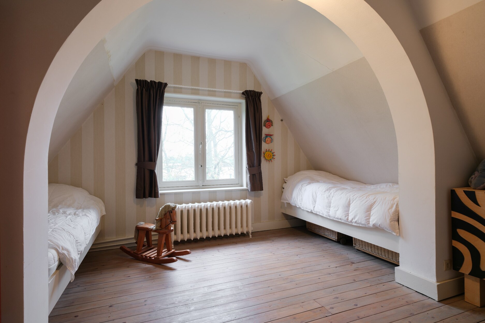Een vaste trap leidt naar meer slaapkamers en een badkamer. Deze verdieping biedt tevens toegang tot een bergzolder.