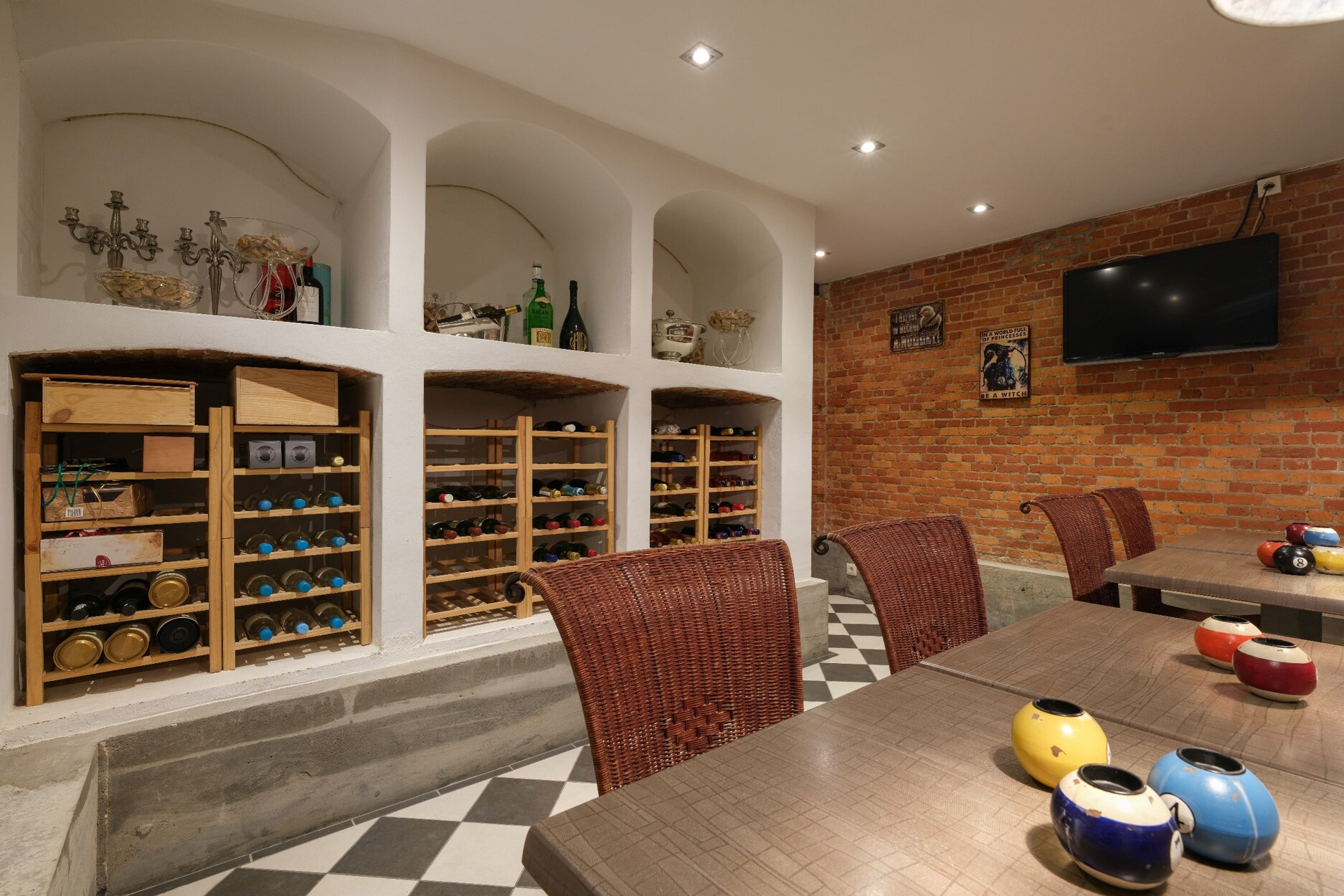 Hier vinden we meerdere ruimten waaronder een keuken (diverse laden en kasten, dubbele spoelbak, afwasmachine en elektrische kookplaat), prachtige wellnessruimte (2 persoonsbubbelbad, solarium, dubbele regendouche, stoomcabine met massagedouche, sauna), fitnessruimte en een gezellige, volledig ingerichte bar/café met aansluitend nog een aparte degustatieruimte en wijnbewaarplaatsen. In de kelder bevindt zich tevens ook de technische ruimte voor elektra, alarminstallatie en er zijn nog diverse opbergruimtes aanwezig.