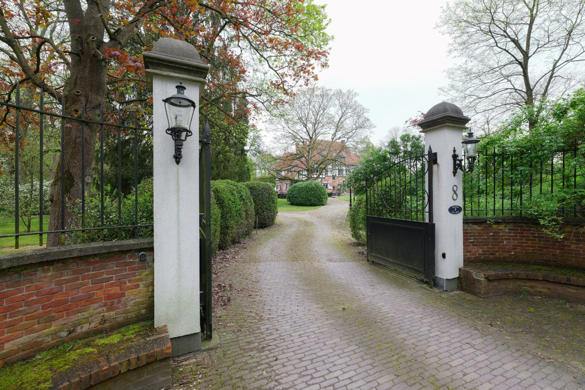 Een volgroeide parktuin, omgeven door een muur, hekwerk en een klassieke smeedijzeren (elektrische bedienbare) poort vooraan het domein. De tuin beschikt over diverse terrassen en een bijgebouw met ruimte voor garages en berging, inclusief een waterpomp voor de tuin.