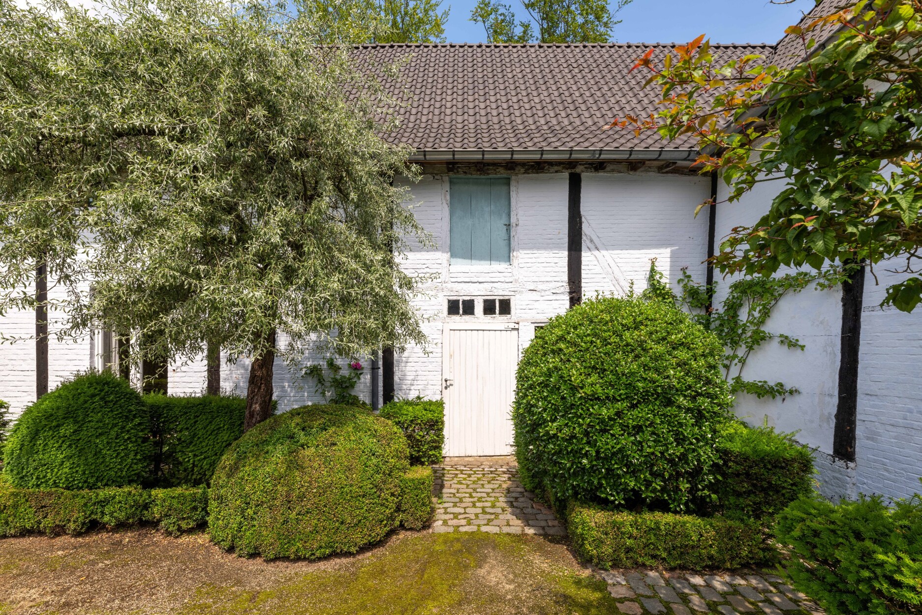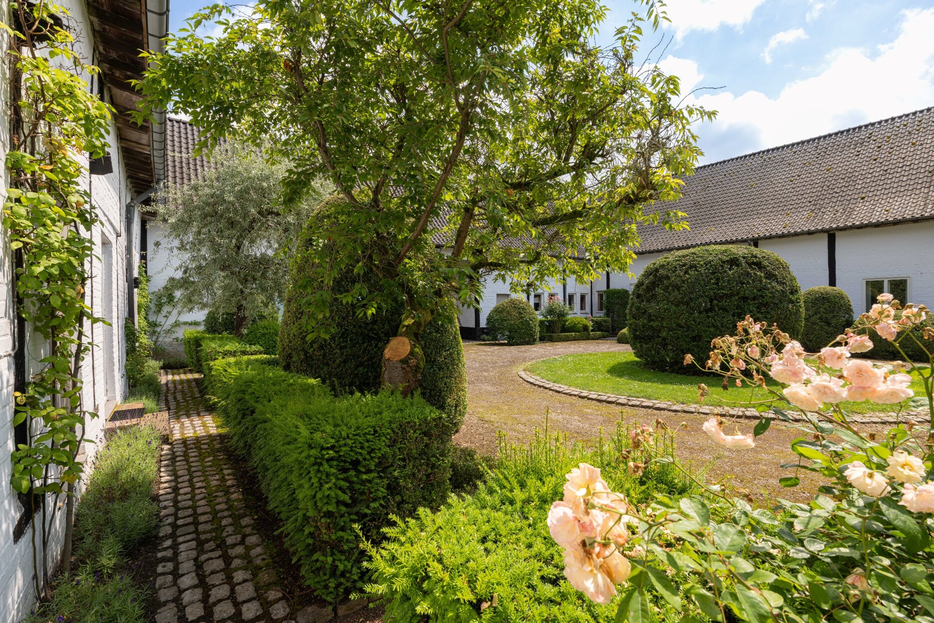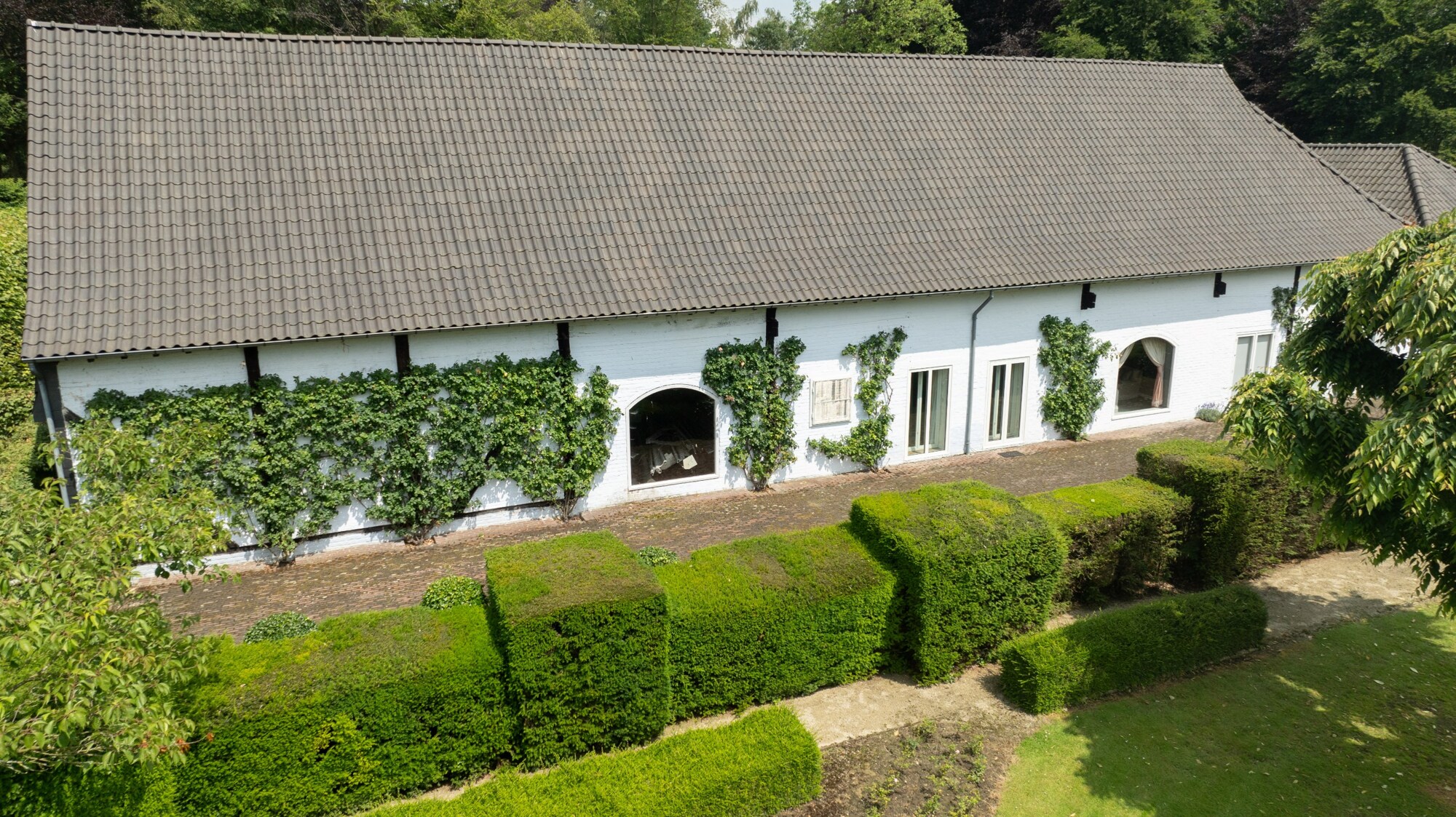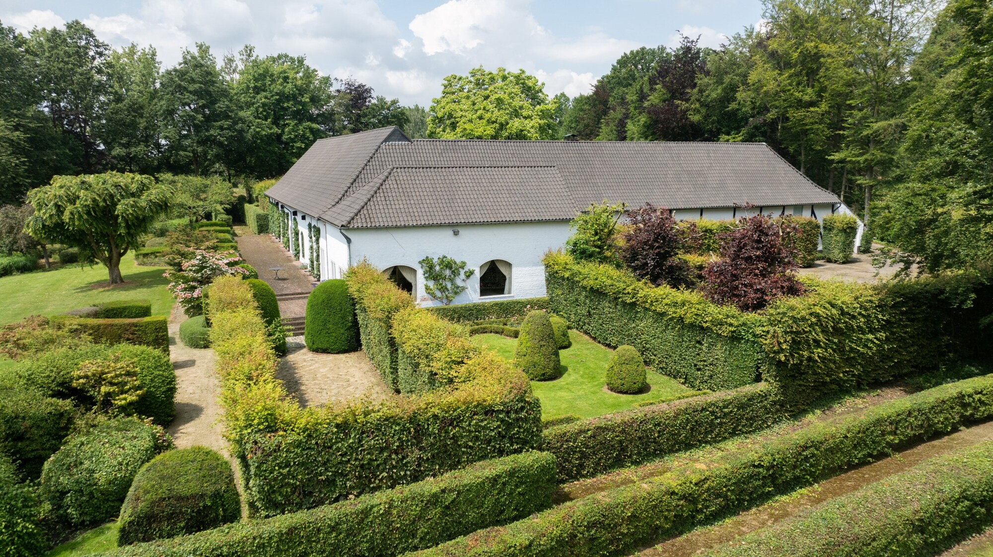 De overdekte toegangspoort van de vierkantshoeve geeft uit op de patio vanwaar men enerzijds toegang heeft tot het hoofdhuis. Dit bestaat uit een ruim salon met eetkamer die uitgeven op de prachtige parktuin met vijver, een grote keuken, bijkeuken, een masterbedroom met aansluitend een badkamer en nog 2 slaapkamers en een badkamer. Daarnaast heeft men nog een grote polyvalente ruimte die naar eigen behoefte kan ingericht worden. Aan de andere kant in de patio zijn er nog 3 grote gastenkamers met badkamer, telkens met een aparte toegang, een grote garage en tuinberging en de conciergewoning. Verderop in het domein is er ook nog een orangerie met op het gelijkvloers een salon en eetplaats met rechtstreekse connectie naar zuid-gerichte terras en aansluitend een keuken. Op het eerste verdiep zijn er 2 luxe suite kamers met telkens een badkamer, dressing en groot terras.
