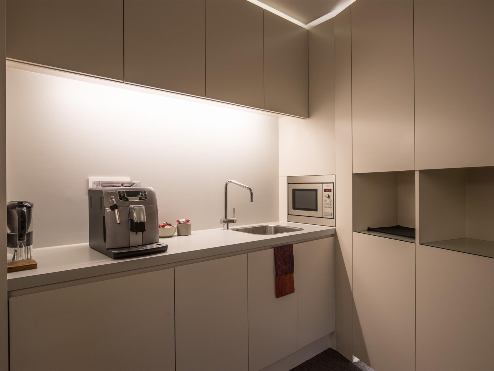 - landschapskantoor met desk en kitchenette voorzien van een ingebouwde microgolf en vaatwasser